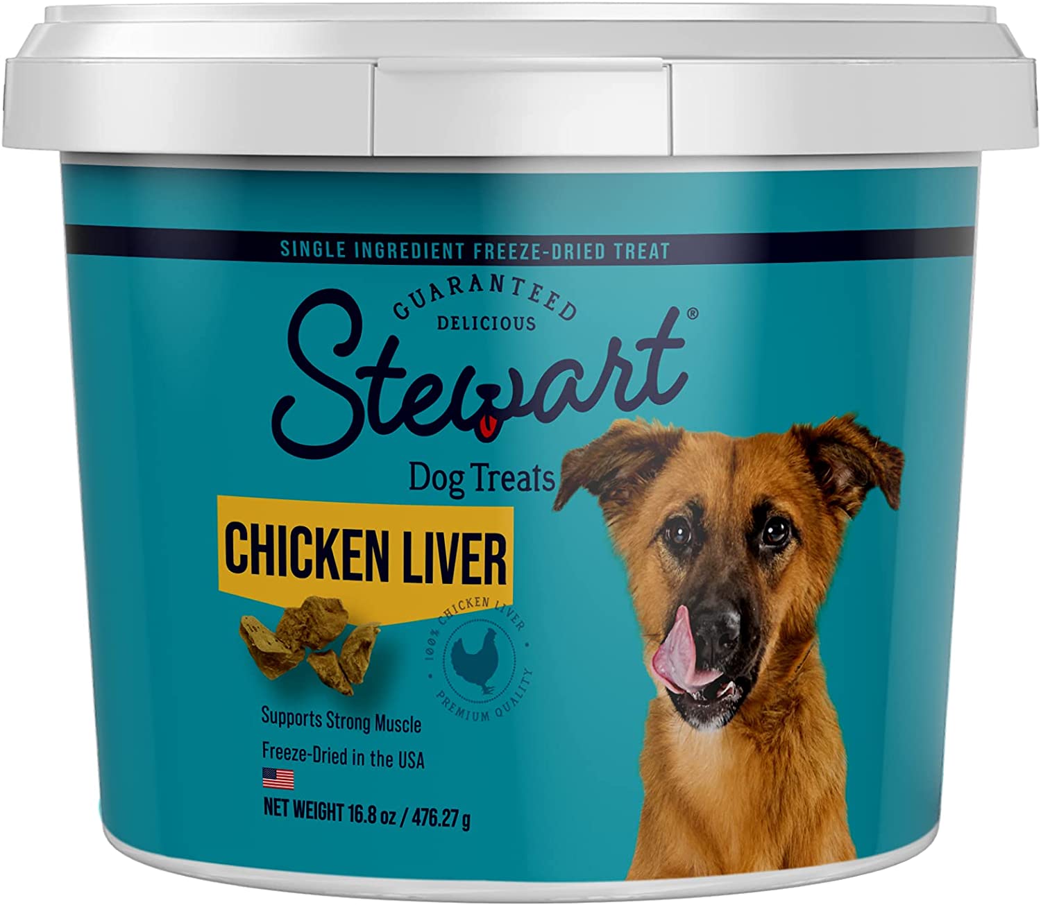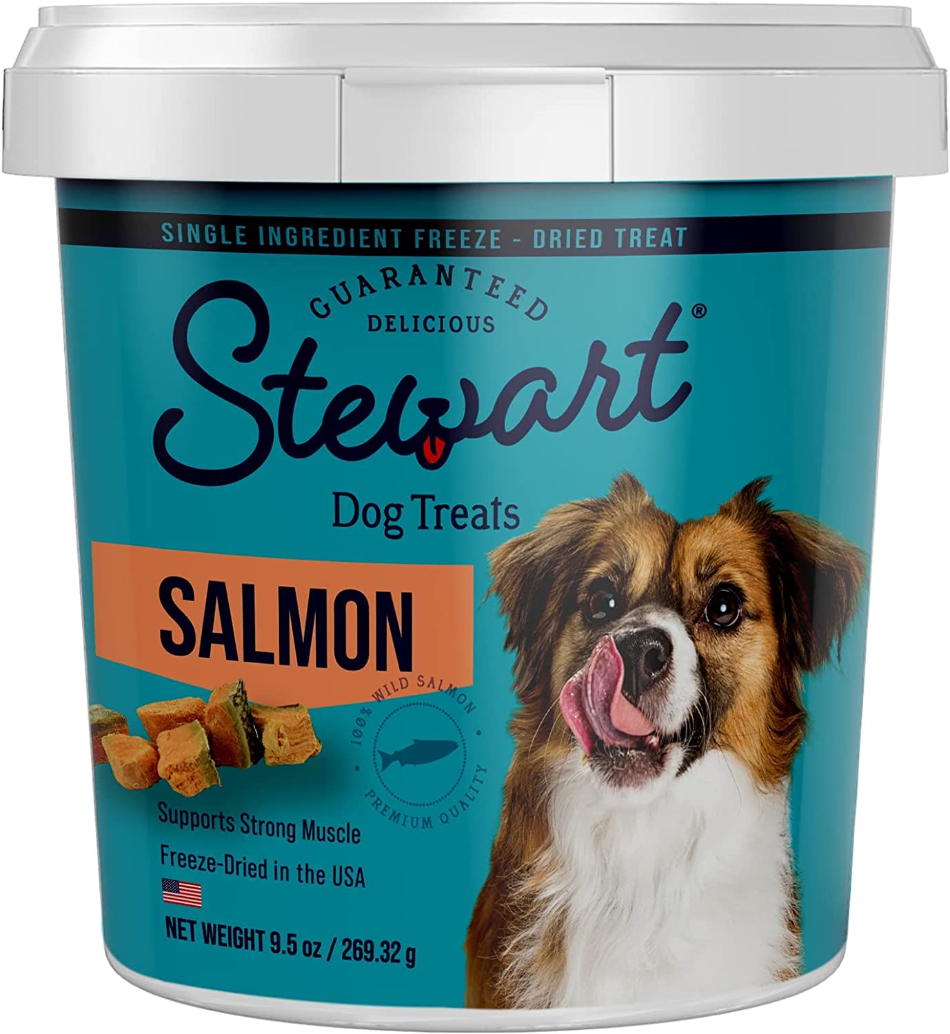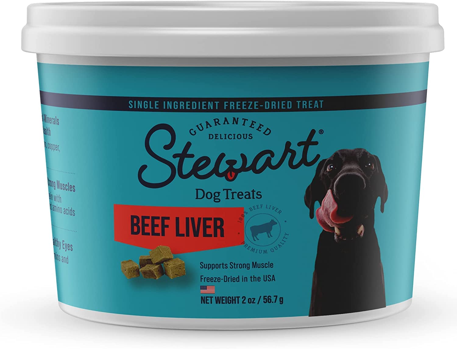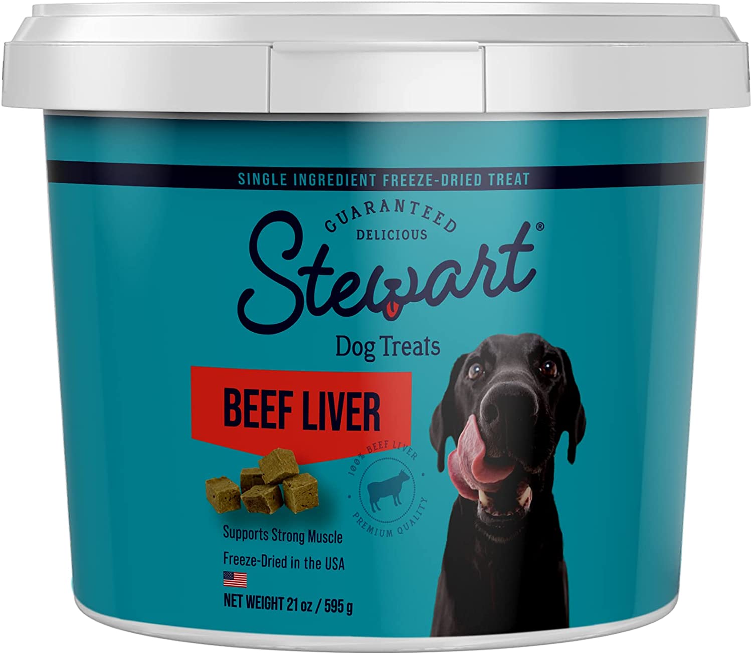 Healthy treats your dog will love! You and your pup deserve the best, so give them a dog treat with life-long benefits. Each Stewart Freeze-Dried Dog Treat is made with just one ingredient and guaranteed delicious while providing wholesome, natural nutrition for your best friend. Our grain-free dog treats are gluten-free and never enhanced with artificial flavoring or fillers like corn and soy. These delicious and nutritious treats are available in four hearty protein varieties: beef liver, chicken breast, chicken liver, and wild salmon. Every day spent with your dog is a gift, and whether you have a small, medium, or large dog, our single ingredient dog treat is sure to get tails wagging. Freeze-dried with care in the USA using responsibly sourced ingredients to lock in flavor and nutrients, our real meat dog treats keep the good times going strong. The treats are lightweight and conveniently packaged in a resealable tub or pouch to keep them fresh and ready to share with your dog at any moment. Packed with protein and great for training! Your dog will sit, stay, and beg for the amazing taste of our dog treats. They are easy to break into small pieces to reward your dog for a job well done. Whether it’s a morning walk, weekend hike, or a trip to the lake, treat your dog on every adventure. We recommend the following servings up to three times per day: Less than 30 lbs. (1 to 2 treats), 30 lbs. to 60 lbs. (2 to 4 treats), Over 60 lbs. (4 to 6 treats). Sweeten life’s moments with wholesome, high quality dog treats to help your dog live a healthy, happy life. Try them today!