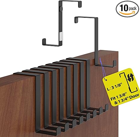 Menz Over The Door Hooks 10 Pack, 2-Sided Fits 1 3/8" & 1 3/4" Coat Hanger, Black Towel Hook w/Anti-Scratch Pads, Wreath Hanger w/Removable Sticky Non-Slip Dots, Thin Overdoor Organizer Length 3"