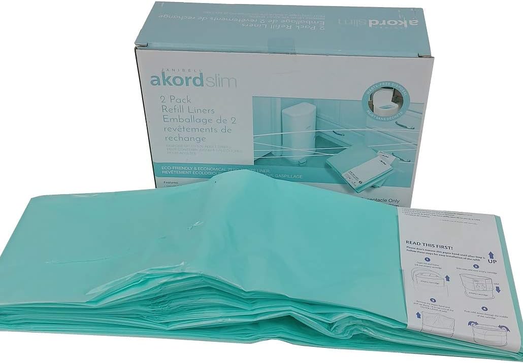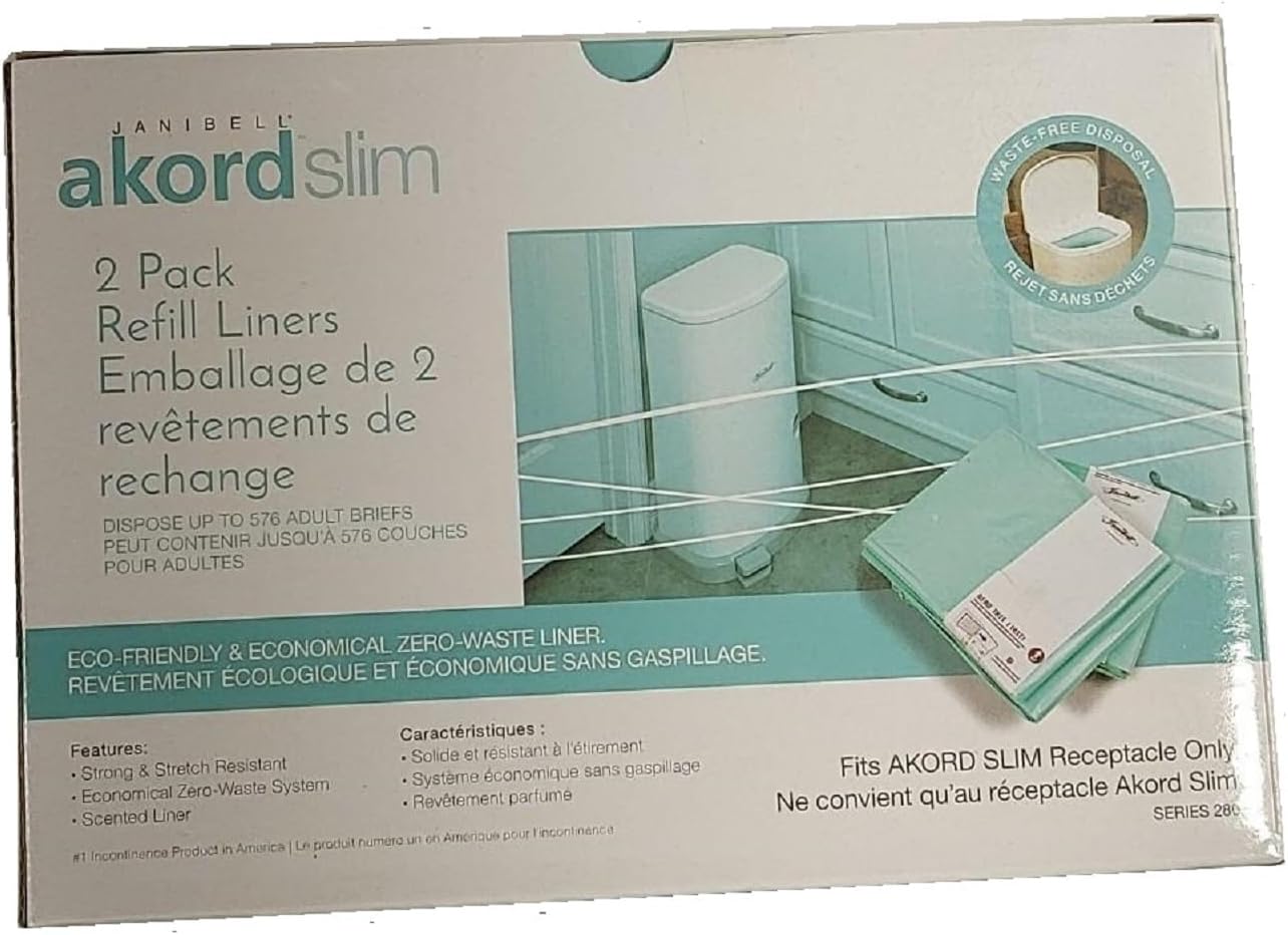 Akord 2-pack liner packs in box solve disposing of incontinence products such as diapers, pads and briefs. The continuous liner system reduces bags can dispose of a single diaper or up to 35 adult-size briefs without wasting liner. It's a continuous roll, cut and tied-off to whatever size you want. A single liner pack will last for over 576 adult briefs and times 2 equals 1152 total!! Liner Pack Size: Each liner pack refill is over 70 feet long and 12 microns thick and fits the Janibell Incontinence disposal 280 series system. The roll, cut and tie design of the liners ensure minimal exposure to the soiled contents, and lets you dispose of just one diaper/pad. You get 2 packs of refill liners in 1 box that are compatible with the hands-free Akord Slim Receptacle (sold separately).