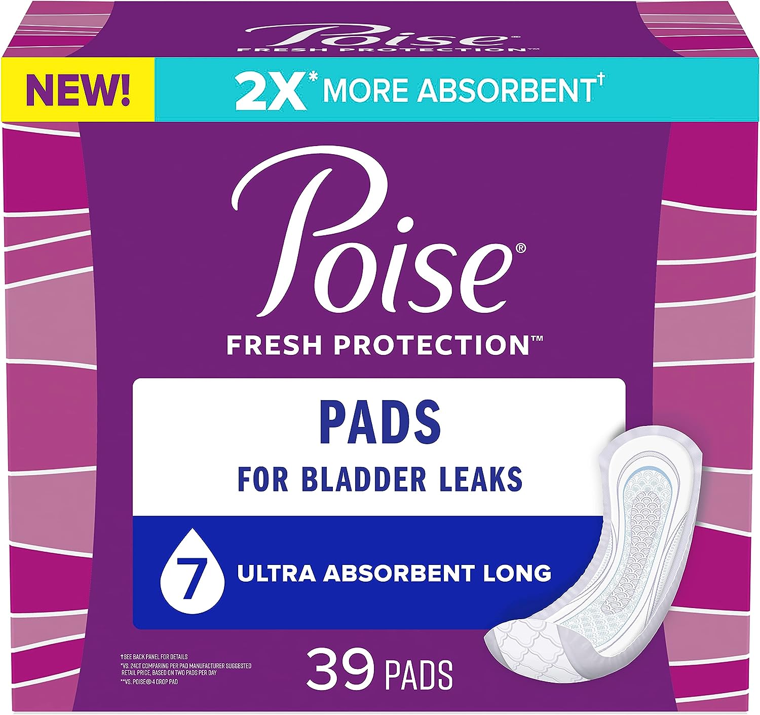 Say goodbye to discomfort from bladder leaks and hello to Poise Postpartum Incontinence Pads in Ultra Absorbency and Long Length, a pad that is designed for your comfort and protection. Poise Ultra Absorbency 7 Drop pads are designed to give you the best protection***. Poise incontinence pads for women are made specifically for bladder leaks, unlike period pads, which are meant for menstrual needs. In fact, Poise pads keep you 10x drier compared to the leading period pad and even feature 2x more absorbent material** to give you the best protection***. Poise pads absorb bladder leaks, lock away wetness, and neutralize odors, helping you feel clean and fresh throughout the day. Our pads are also made with breathable materials that help eliminate dampness, so you feel clean and fresh too! Poise bladder control pads are discreet and fit securely in your underwear. Poise incontinence pads are available in light, moderate, maximum, and overnight absorbencies. For lighter absorbency needs, check out Poise Daily Liners. Shop for Poise discreetly by having it shipped directly to your door or pick up curbside. Poise adult incontinence products are HSA/FSA-eligible in the U.S. *Satisfaction guaranteed or your money back: Online access required. Limit 1 per household. Original receipt/UPC required. Restrictions apply. See Poise website for details. **vs. Poise 4 Drop Pad ***vs. Poise National Brand Daytime pads