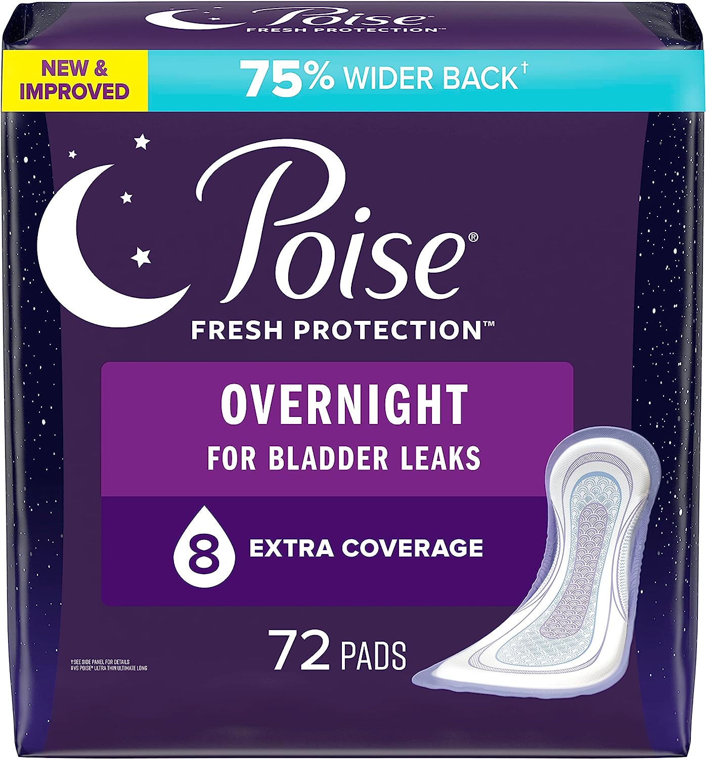 Poise Incontinence Pads & Postpartum Incontinence Pads, 8 Drop Overnight Absorbency, Extra-Coverage Length, 72 Count (2 Packs of 36), Packaging May Vary