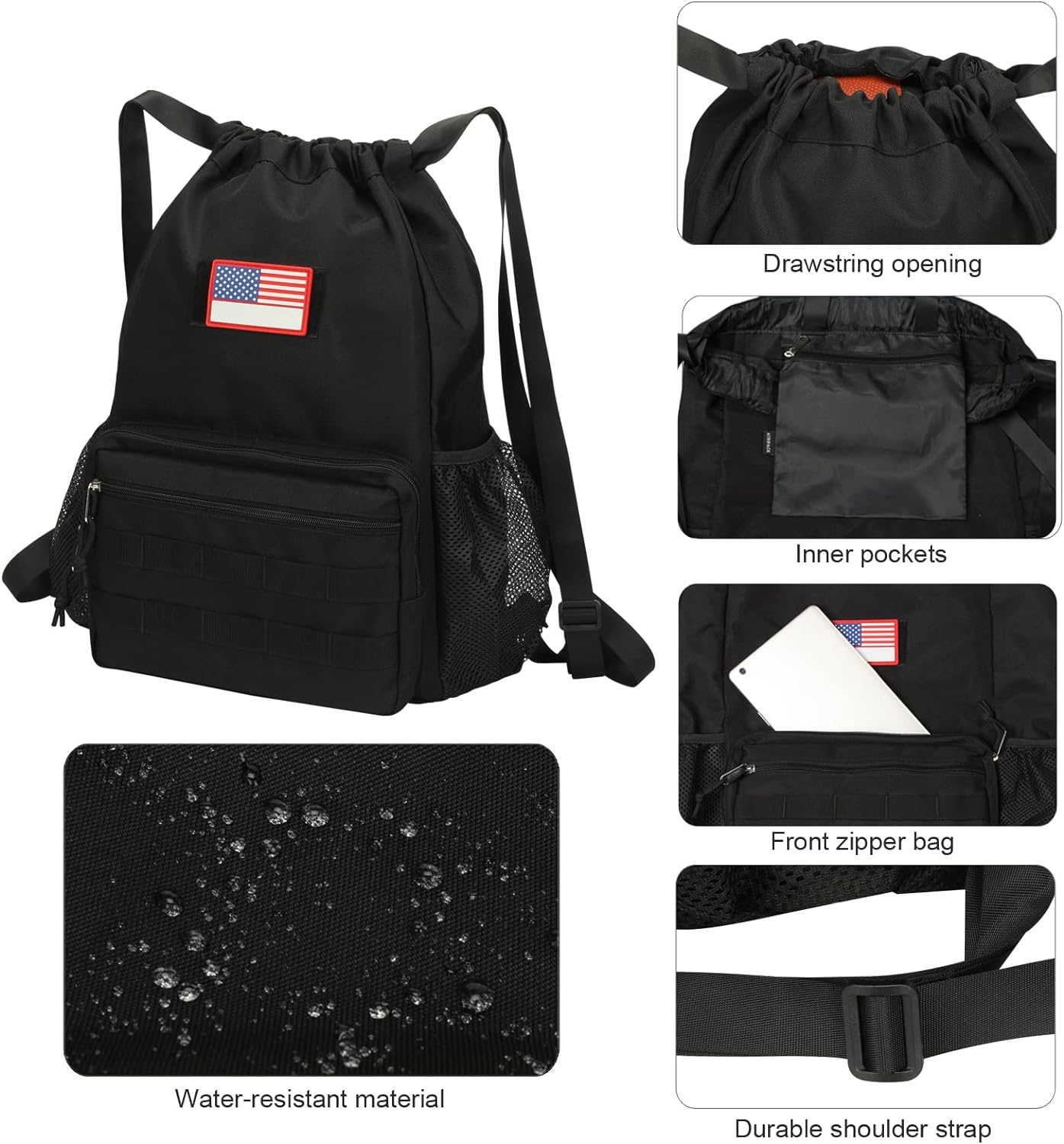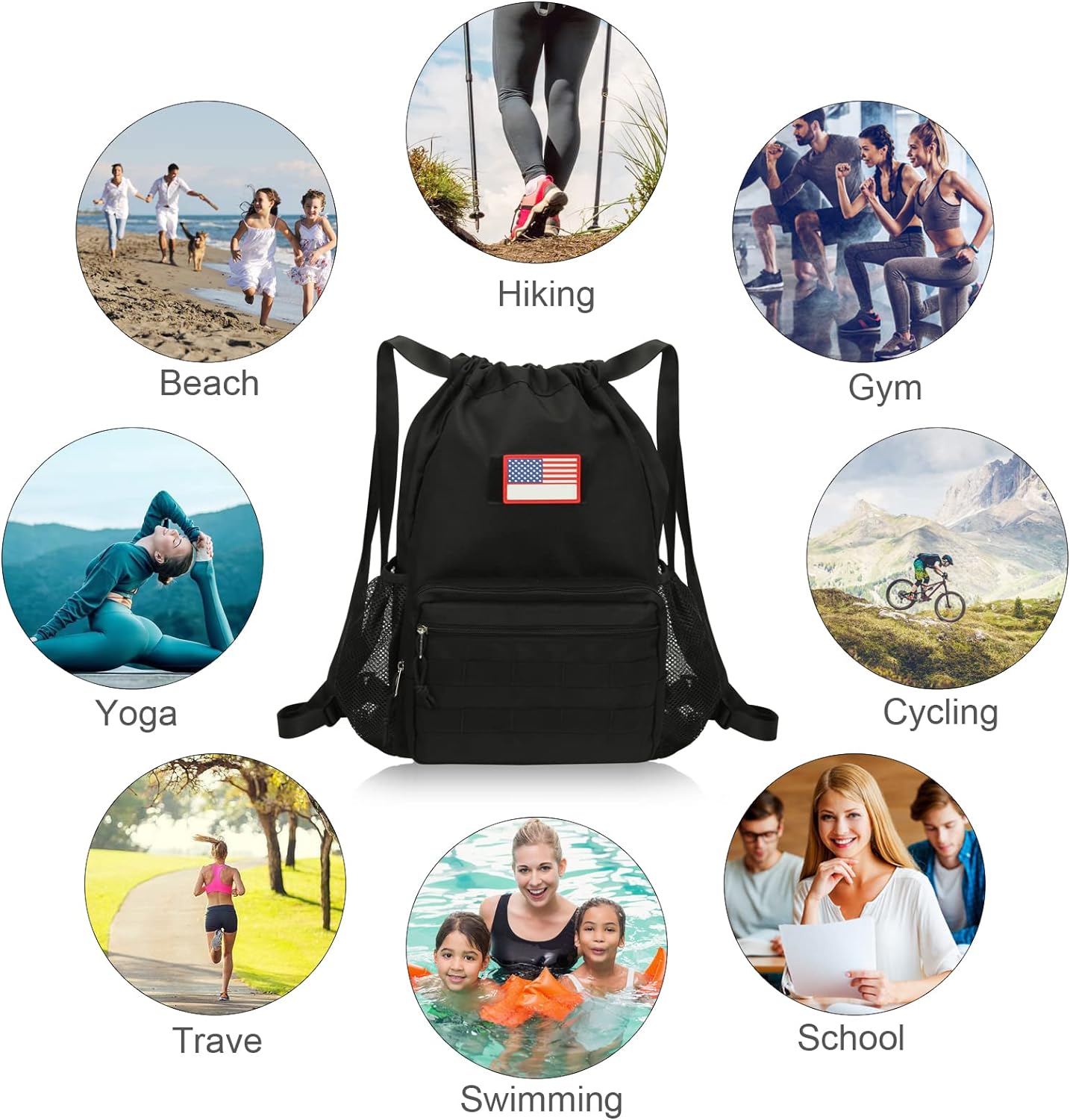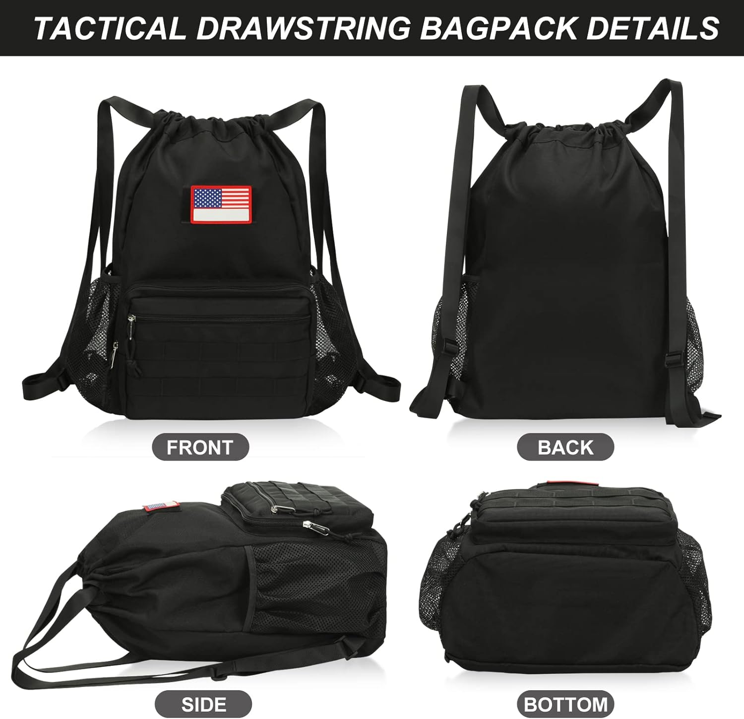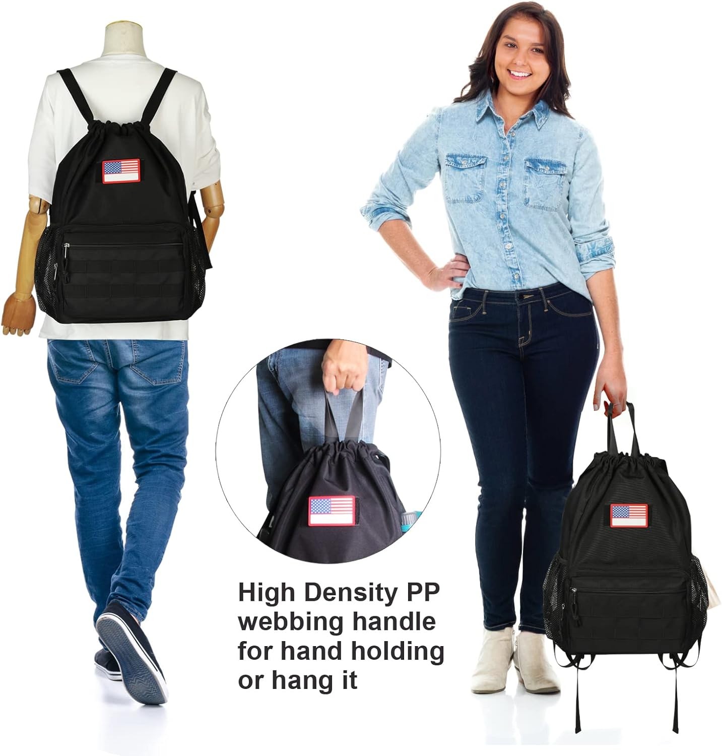 • 【WATER-RESISTANT MATERIAL& HANDLE DESIGN】 Drawstring sports bag is made of High-Density 900D Oxford, water-resistant Material that can protect your stuff in rainy days. With molle on the front, designed for conveniently attaching storage pouches, keys, carbines, sunglasses, knife A velcro area can patch different patches you like.The drawstring bookpack has 2 handy carry handles that allow for hand holding or hang it on the wall or door.Machine Washable.