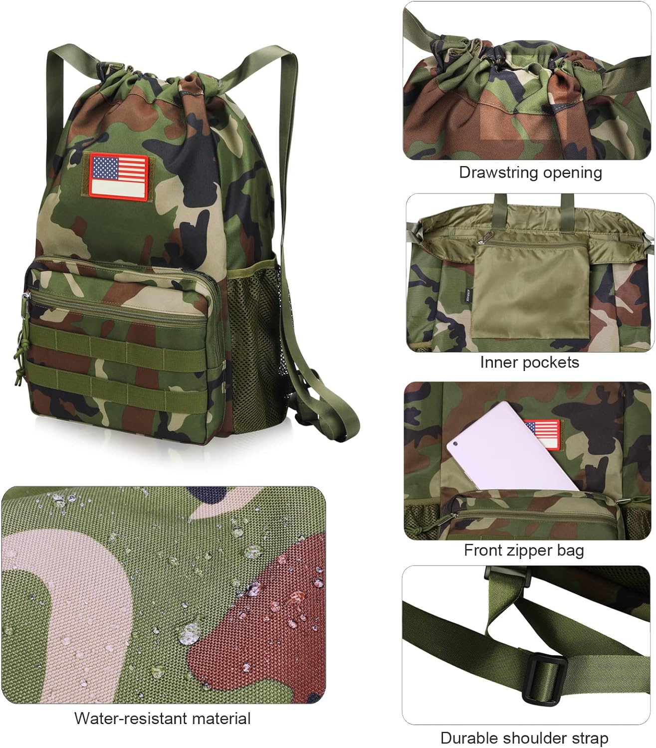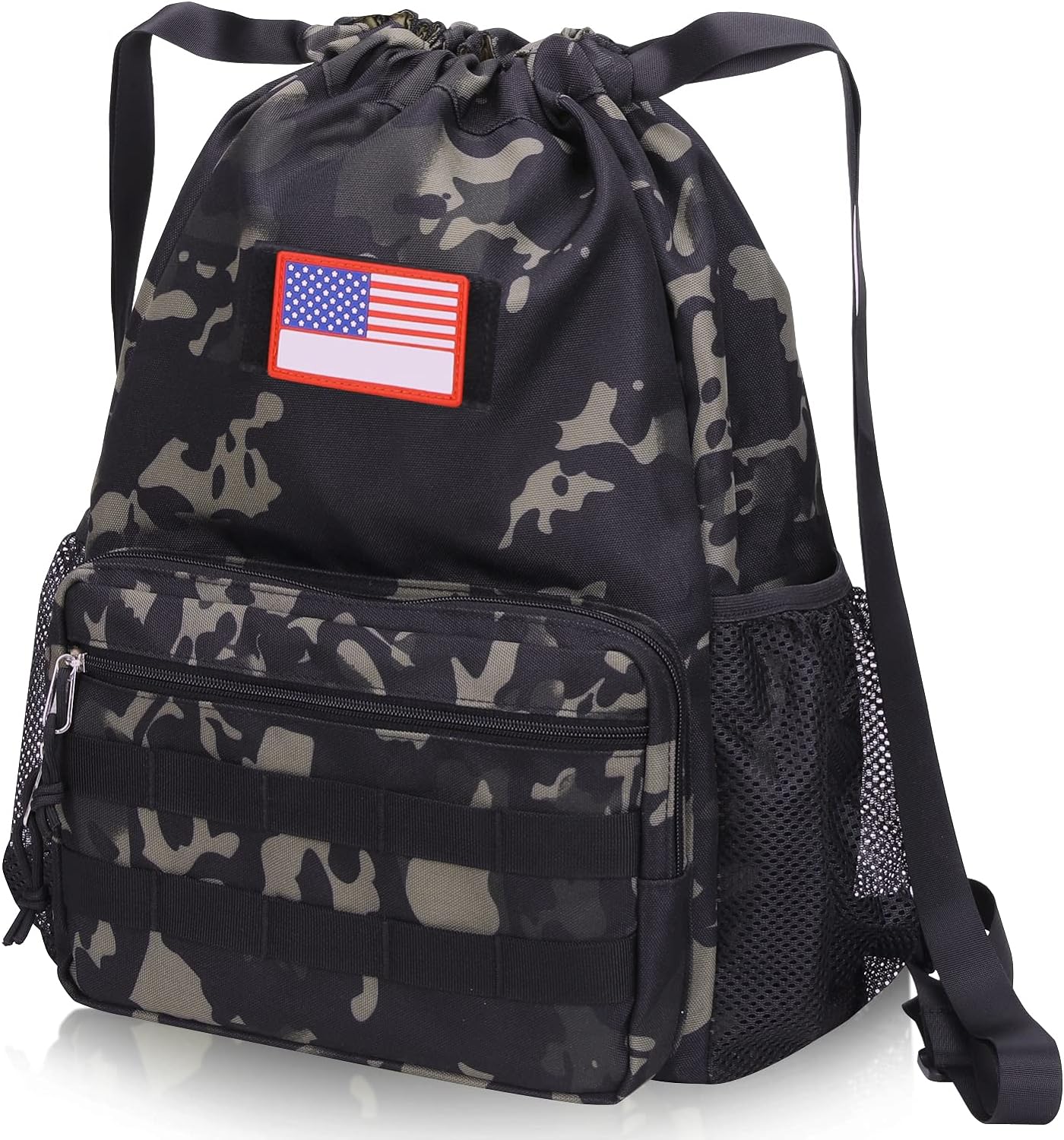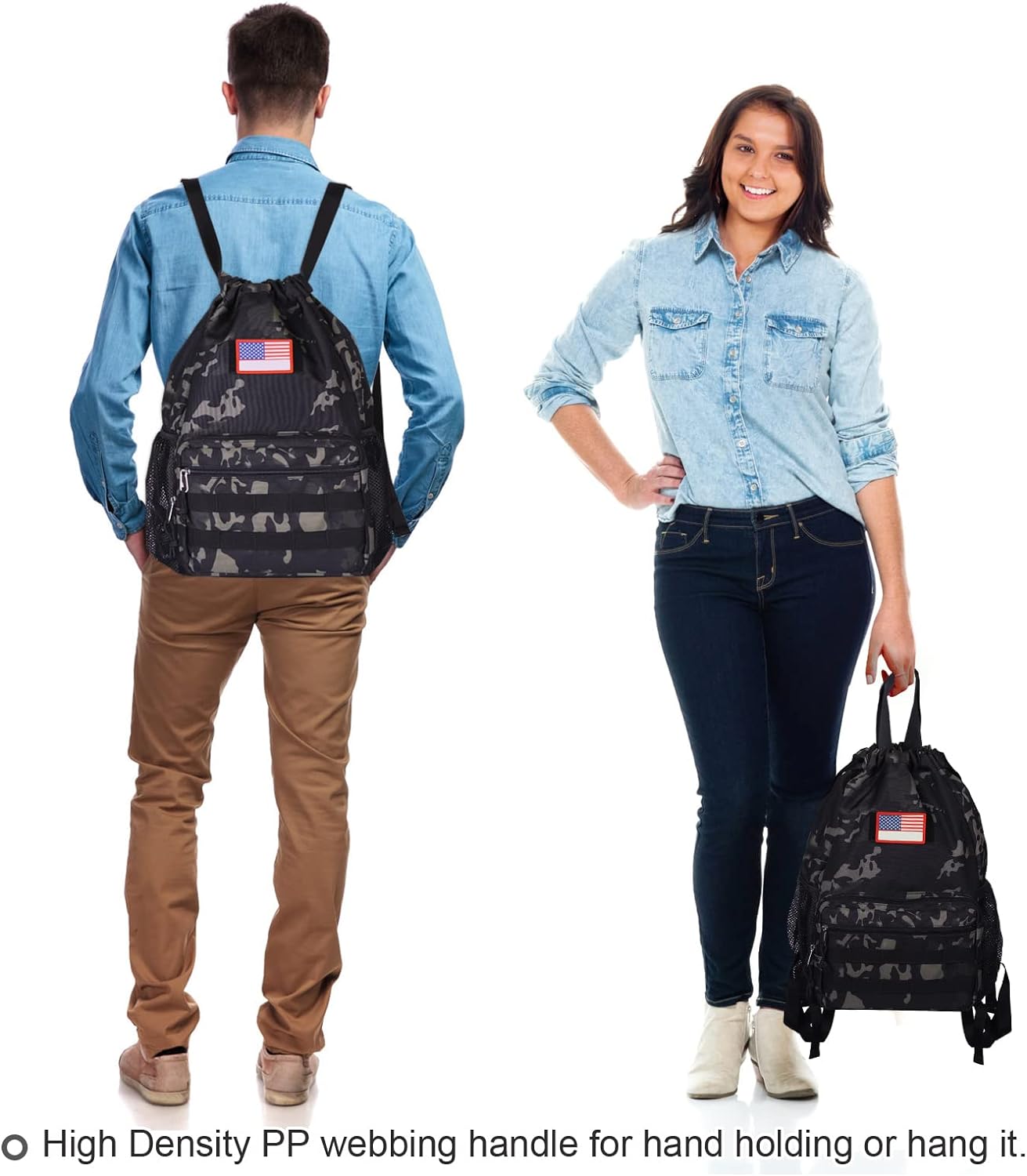 ATRIPACK Tactical Drawstring Backpack, Water-Resistant Swim Bag String Bag Sandproof Beach Backbag American Flag Cinch Sack Bookbag for Men Women Basketball,Swim, Gym, Sports(Black Camo
