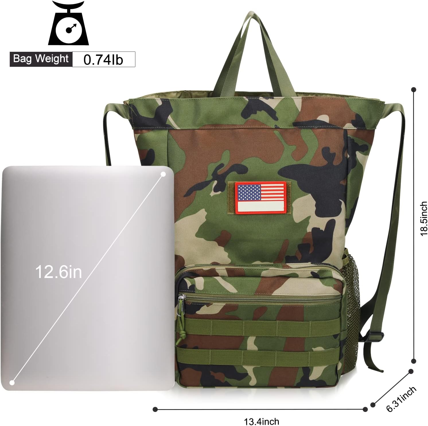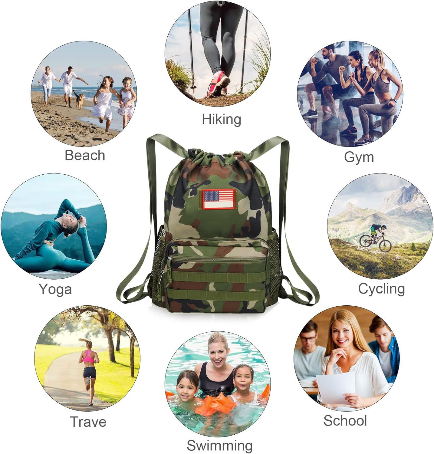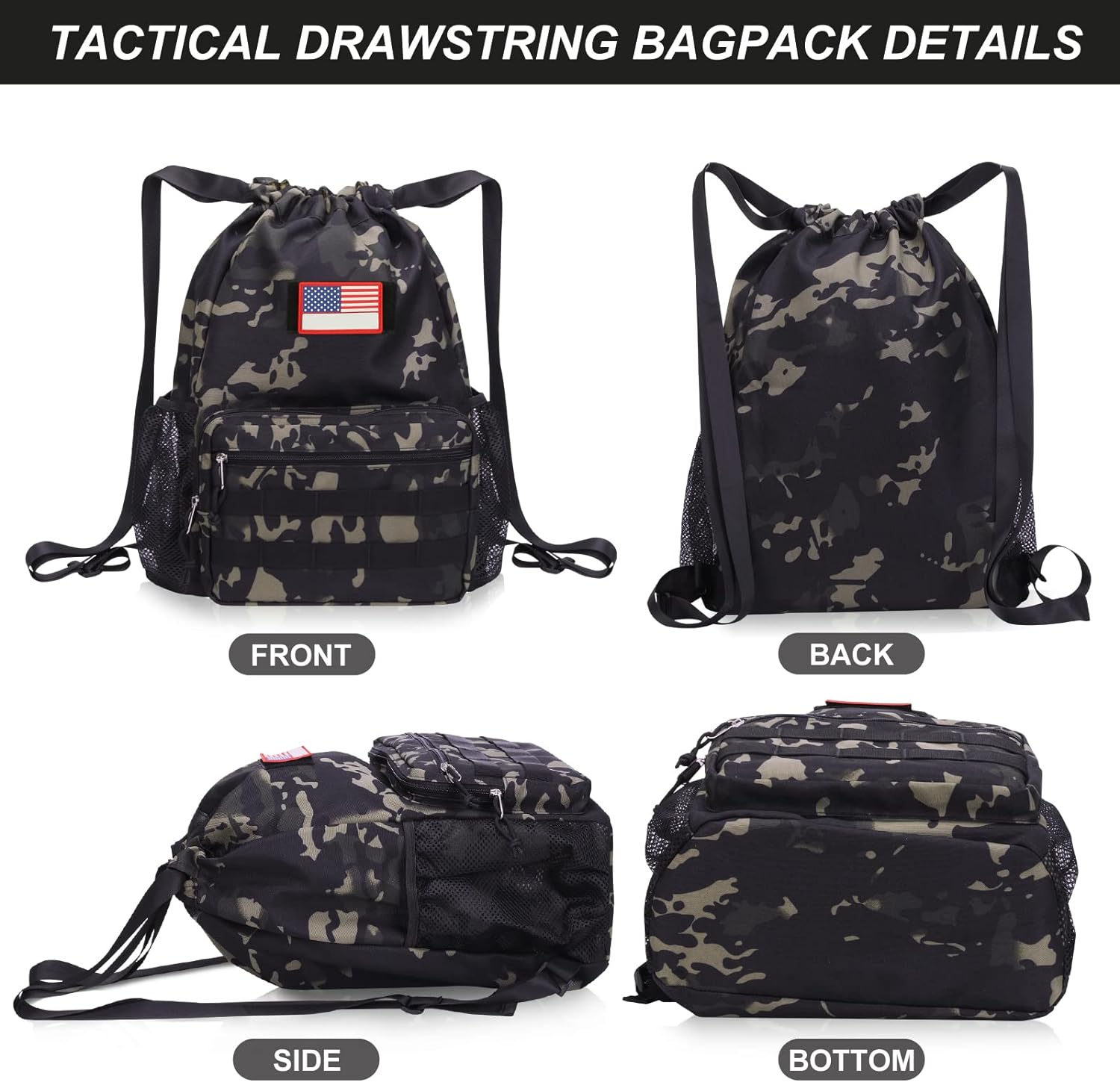ATRIPACK Tactical Drawstring Backpack, Water-Resistant Swim Bag String Bag Sandproof Beach Backbag American Flag Cinch Sack Bookbag for Men Women Basketball,Swim, Gym, Sports(Black Camo
