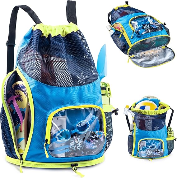 Drawstring Backpack Sandproof - Mesh Backpack Beach Bag with Shoe Compartment - Swim Bag for Beach, Pool - Pool Bag with Pockets for Toiletries - Wet Bag for Swimsuit - Summer Camp Essentials