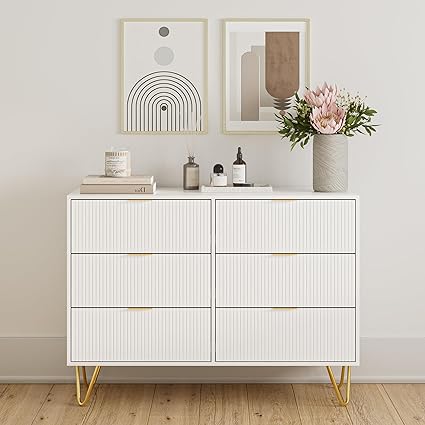6 Drawer Dresser, Drawer Chest, Tall Storage Dresser Chest Cabinet Organizer Unit with Metal Legs, Big Dresser for Bedroom, Living Room, Closet, Hallway White Stripe