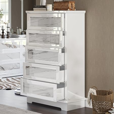 AMERLIFE Luxury 49.2" H High-Gloss 5 Drawer Dresser, Natural Marble Chest of Drawers No Handles for Bedroom, Living Room, Modern, White