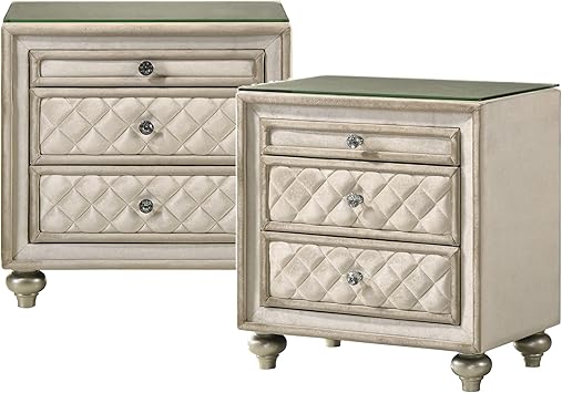 Luxury Upholstered Nightstand with 3 Drawer - Diamond Night Stand with Tempered Glass Top Crystal Button Tufted Beige Velvet Fabric Modern End Table Bed Side Table Bedroom Bedside Table (2)