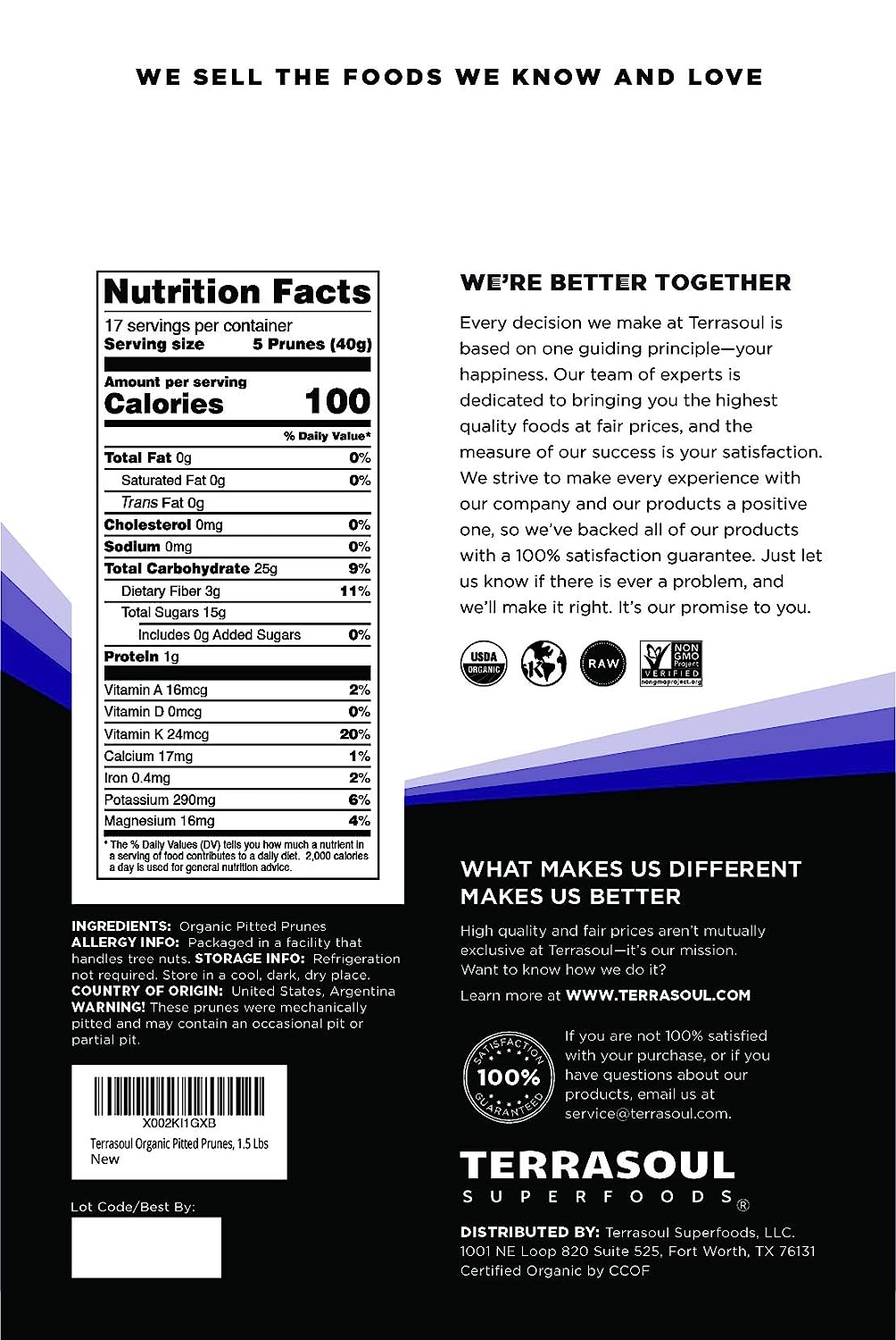 Terrasoul Superfoods Organic Dried Plums Pitted Prunes, 1.5 Lbs - Fiber | Vitamin K | Preservative Free