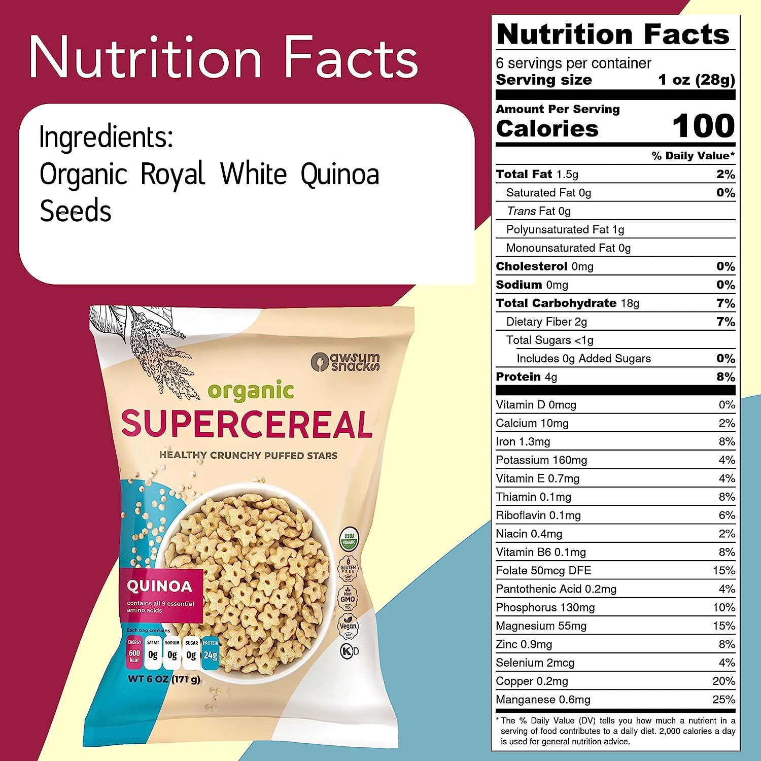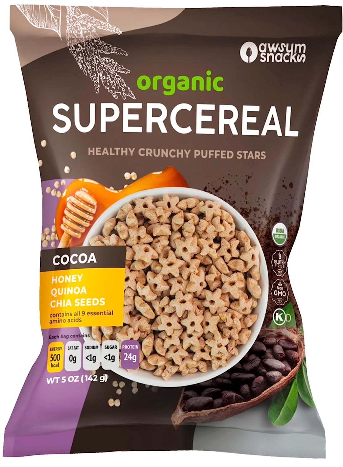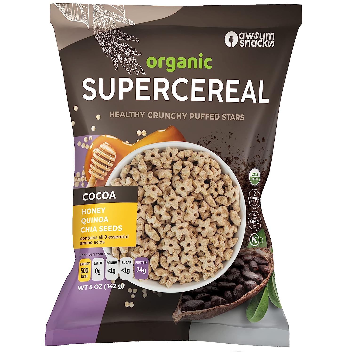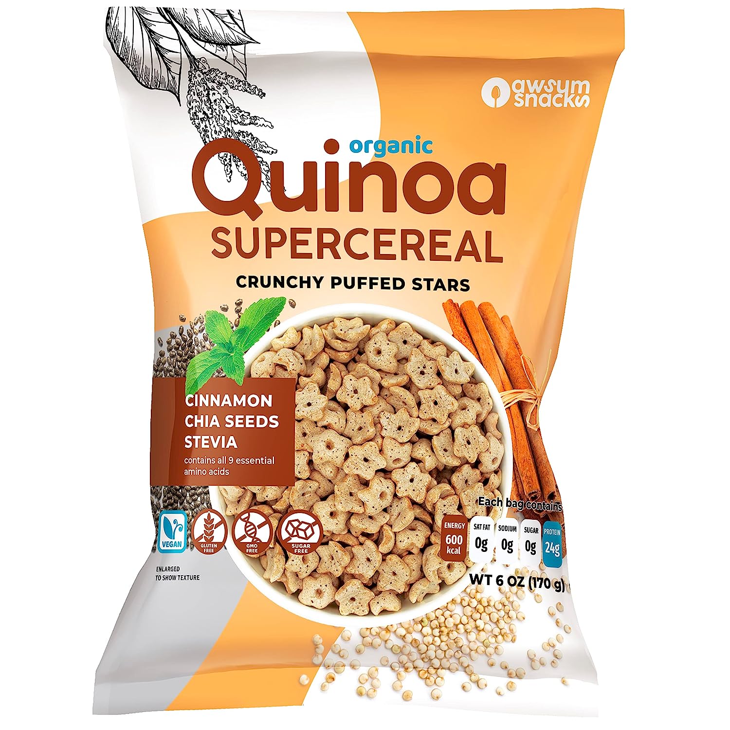 • Awsum Snacks Quinoa SUPERCEREAL Cold Cereal is a delicious diet-friendly cereal made with no artificial ingredients and no added sugars. This breakfast cereals is perfect for dieters who no longer want to miss out on their favorite quinoa puffs.