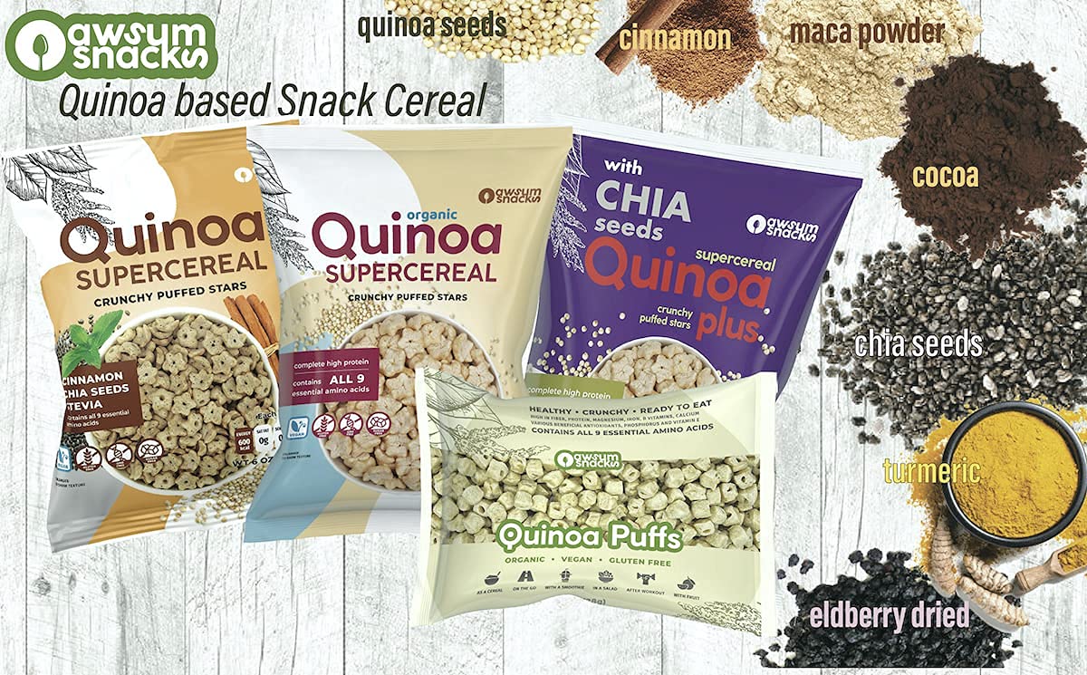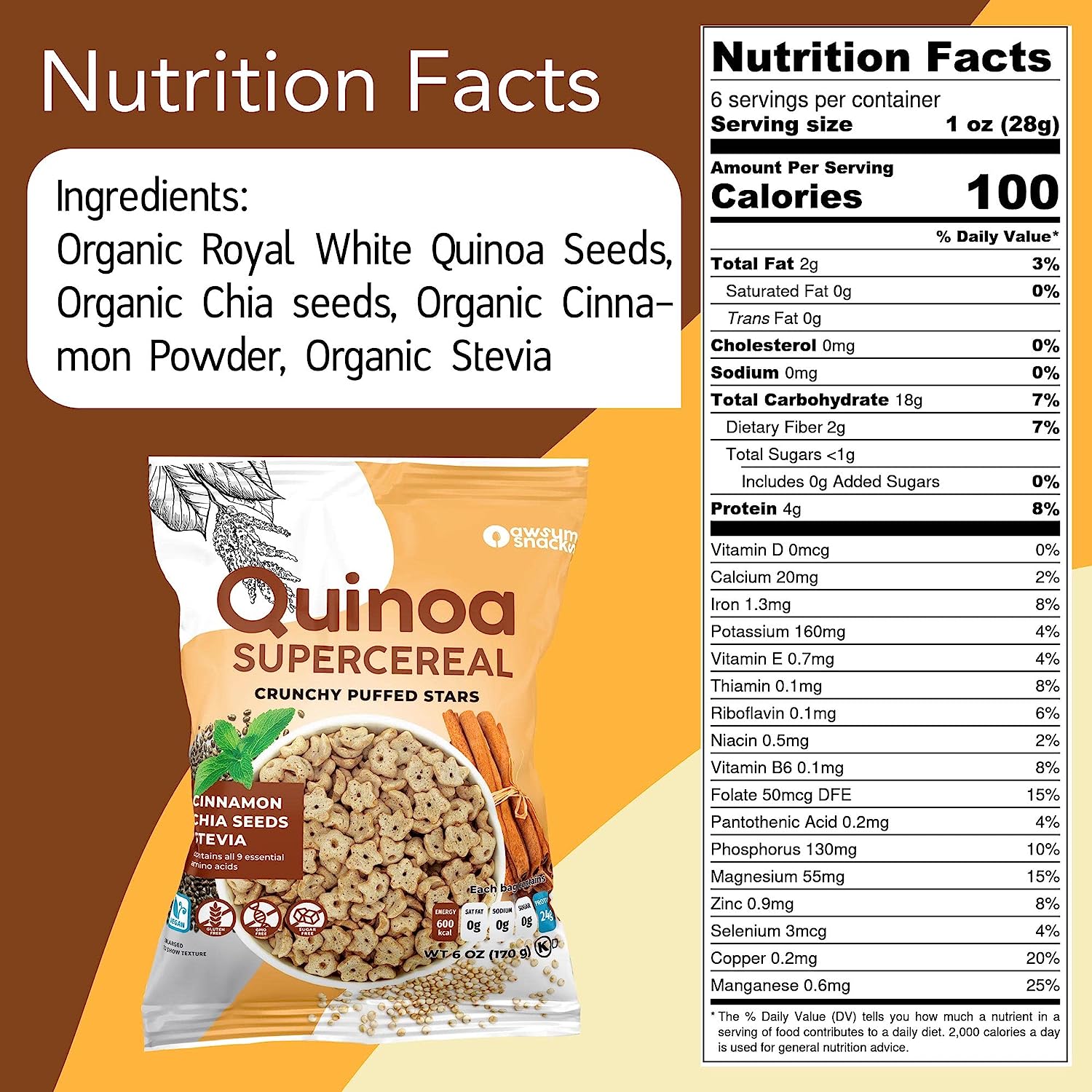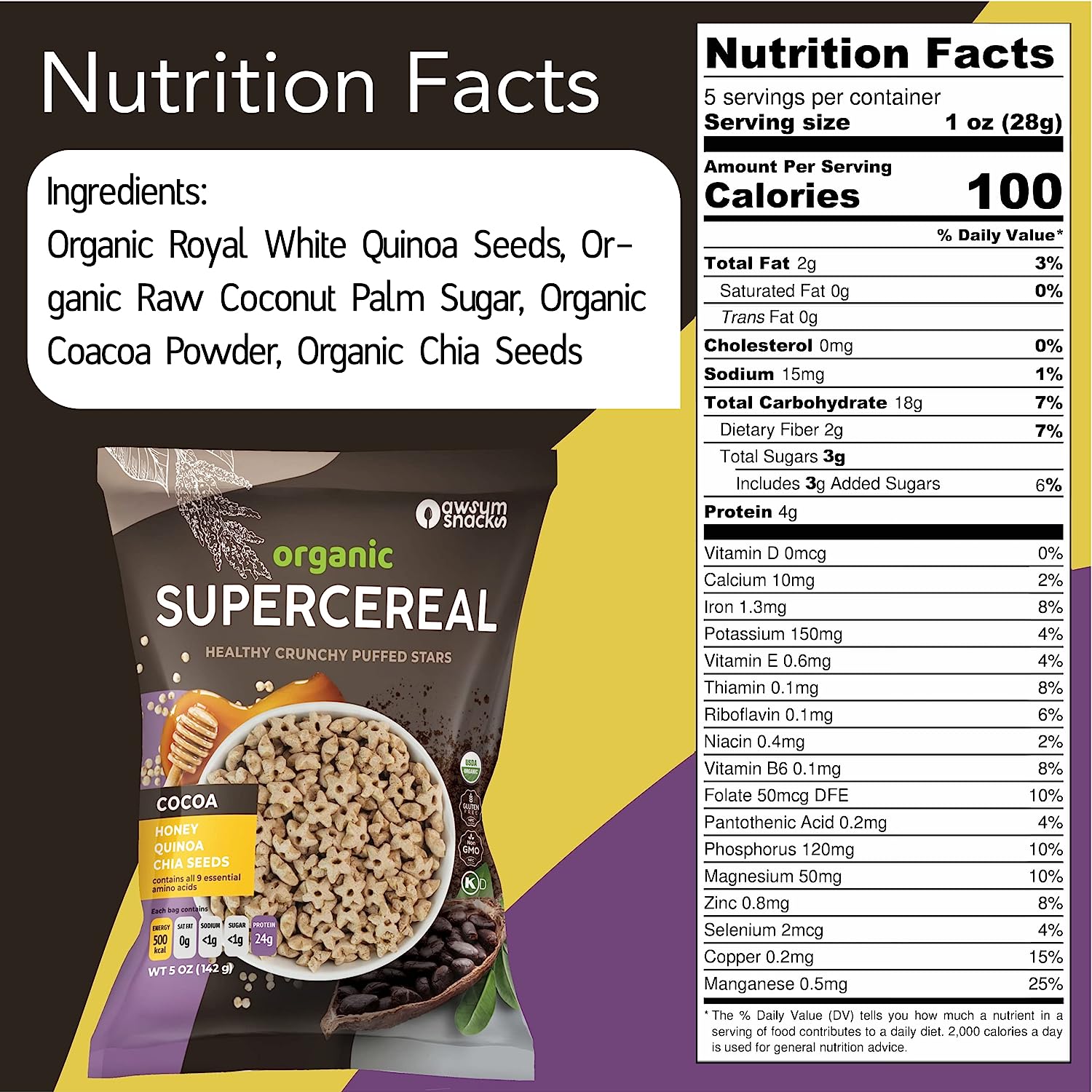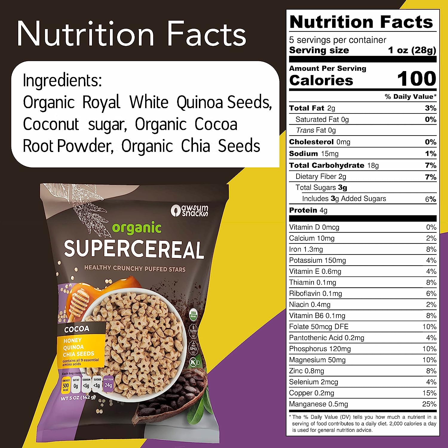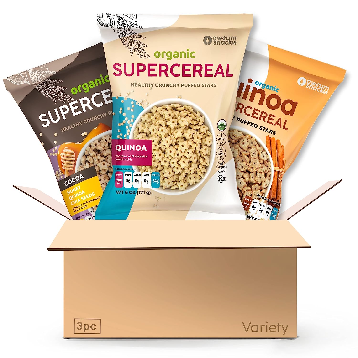 • Awsum Snacks Quinoa SUPERCEREAL Cold Cereal is a delicious diet-friendly cereal made with no artificial ingredients and no added sugars. This breakfast cereals is perfect for dieters who no longer want to miss out on their favorite quinoa puffs.