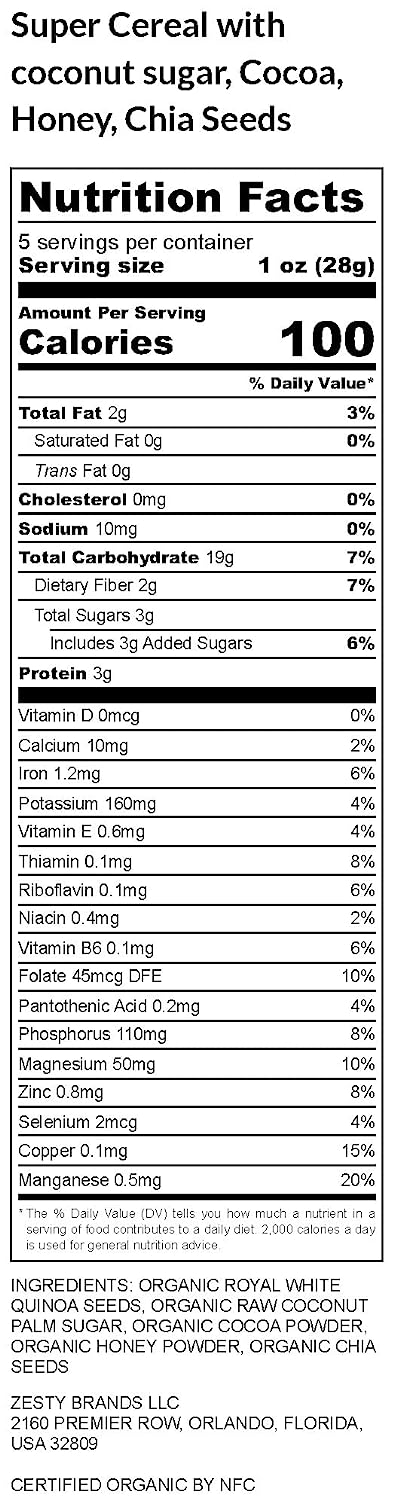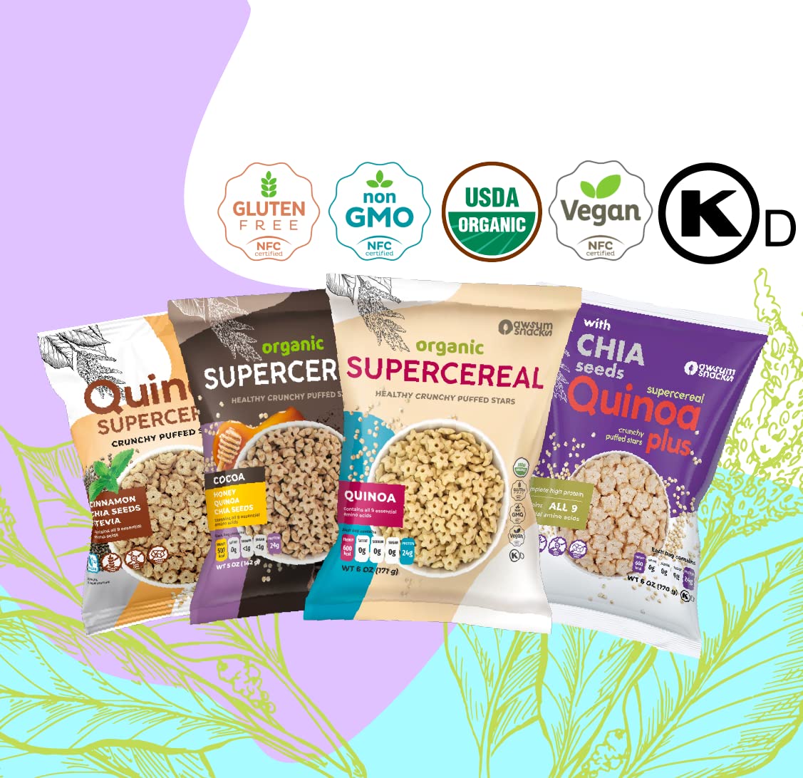 • Certified Kosher, USDA Organic, Gluten-Free and Non-GMO Cereal Snacks Perfect for People With Gluten Intolerance. Superfoods cereal is a Low Calorie Vegan snacks . Perfect snack for baby and kids.