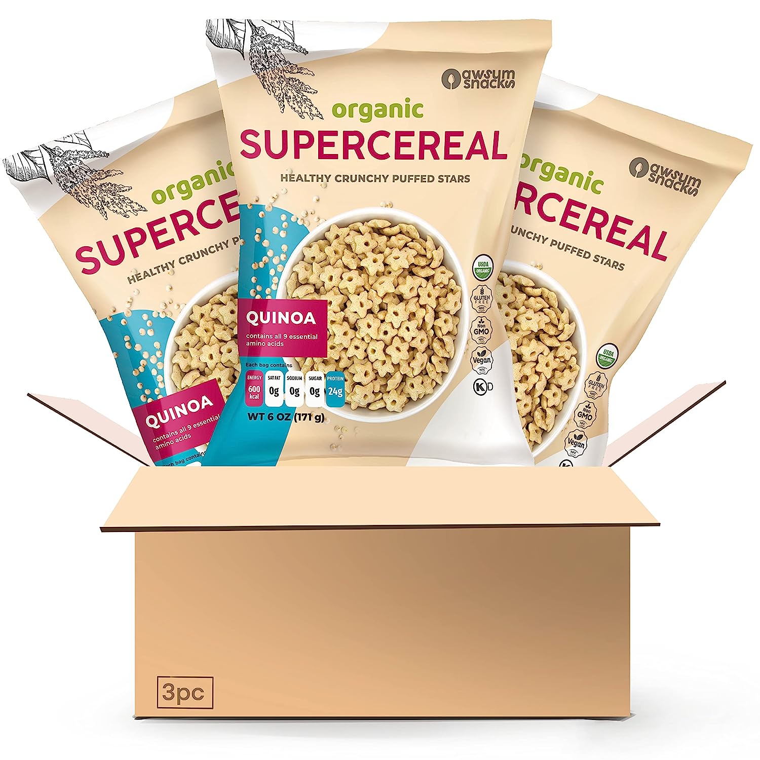 Awsum Snacks SUPERCEREAL 6oz - Certified USDA Organic - Vegan Gluten Free Non GMO Kosher Snack - Natural Plant Based High Protein - Grain Dairy and Sugar Free Cereals - Diabetic Healthy Cereal - Puffed Quinoa Plain