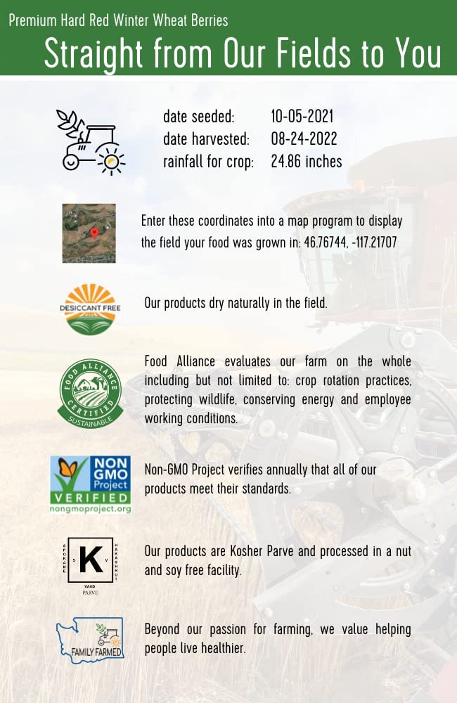 • CERTIFIED PREMIUM QUALITY & NON-GMO: Our Hard Red Winter Wheat Berries are proudly certified Non-GMO Project Verified, Sustainable by the Food Alliance, Kosher Parve and Desiccant Free.