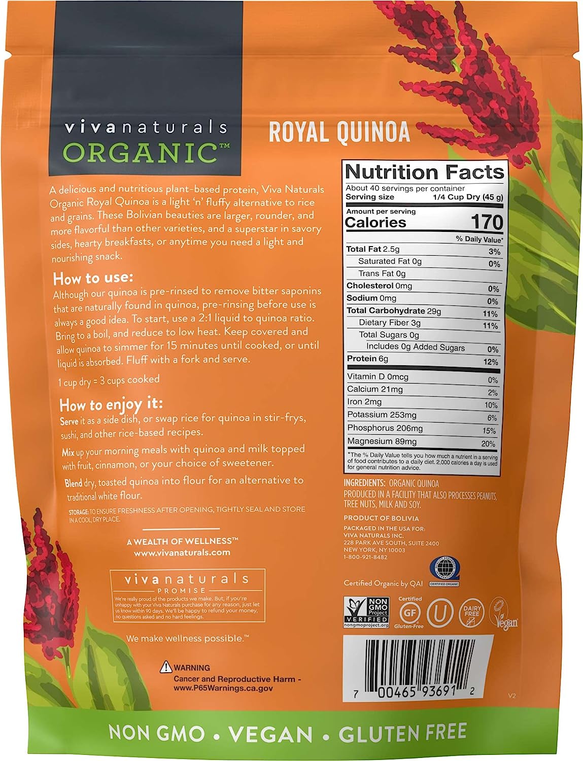 A delicious and nutritious plant-based protein, Viva Naturals Organic Royal Quinoa is a light ‘n’ fluffy alternative to rice and grains. These Bolivian beauties are larger, rounder, and more flavorful than other varieties, and a superstar in savory sides, hearty breakfasts or anytime you need a light and nourishing snack. Naturally a good source of fiber, Viva Naturals Organic Quinoa is a complete vegan protein source, making it perfect for vegetarians, or those looking for a gluten-free substitute for traditional grains. Quinoa has gained popularity as a nutritious grain that can be eaten for breakfast as a quinoa cereal, as a snack, or as a side dish for dinner. Use it in your meal preps to create quinoa microwaveable lunches. It can easily replace rice in your favorite vegan meal without changing the taste.