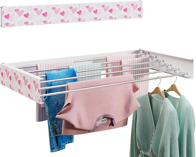 40 Inches Clothes Drying Rack with Pink Hearts, Wall Mounted Laundry Room Art Drying Rack, 6 Dryer Rods, 19.7 Linear Ft, Foldable and Space Saving, Gift for Wife (40.0", Love)