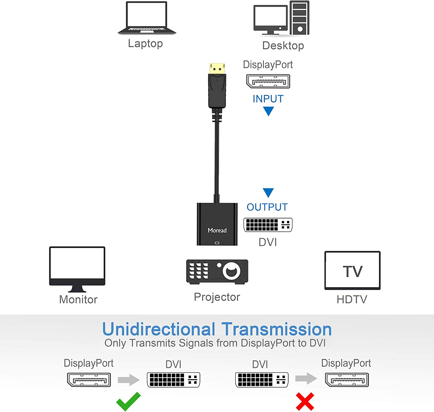 • COMPACT DESIGN - The portable Moread DP to DVI adapter connects a desktop or laptop with Display Port (DP, DisplayPort++, DP++) port to a monitor, display, projector, or HDTV with DVI input; Tuck this lightweight gadget into your bag or pocket to make business presentation, or extend your workspace to increase productivity; A DVI cable is required (sold separately)