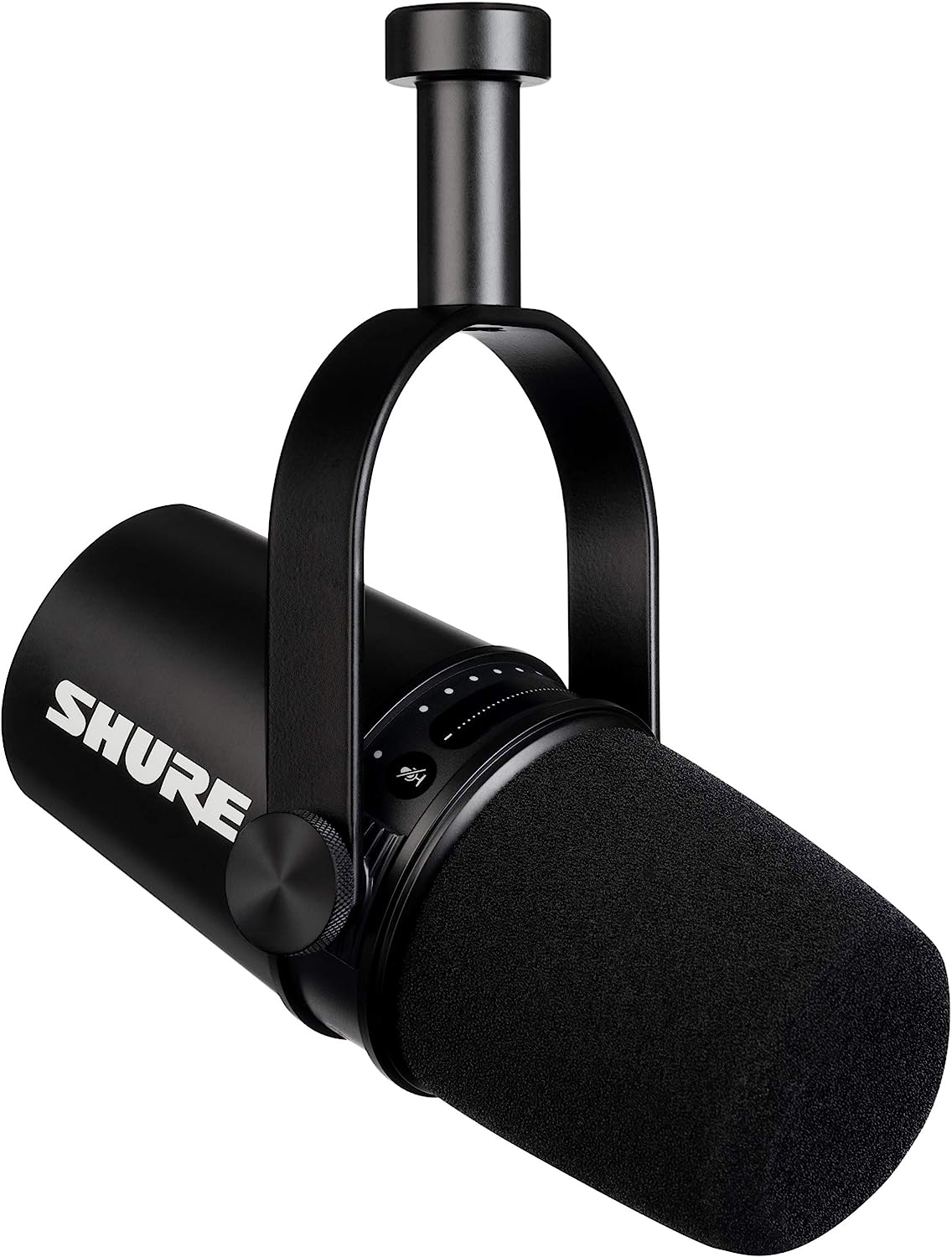 The Shure MV7 is a professional-quality USB/XLR dynamic microphone inspired by the legendary SM7B, ideal for close mic applications that require vocal intelligibility with a balanced tone. A touch panel interface on the microphone itself provides control over microphone gain, headphone level, monitor mix, and muting, and the ShurePlus MOTIV Desktop Application allows users to save their own presets or enable auto-gain, compression, and EQ presets for easy real-time audio processing. The attractive and durable all metal design features an adjustable yoke that can be mounted onto a variety of microphone stands for flexible placement options.