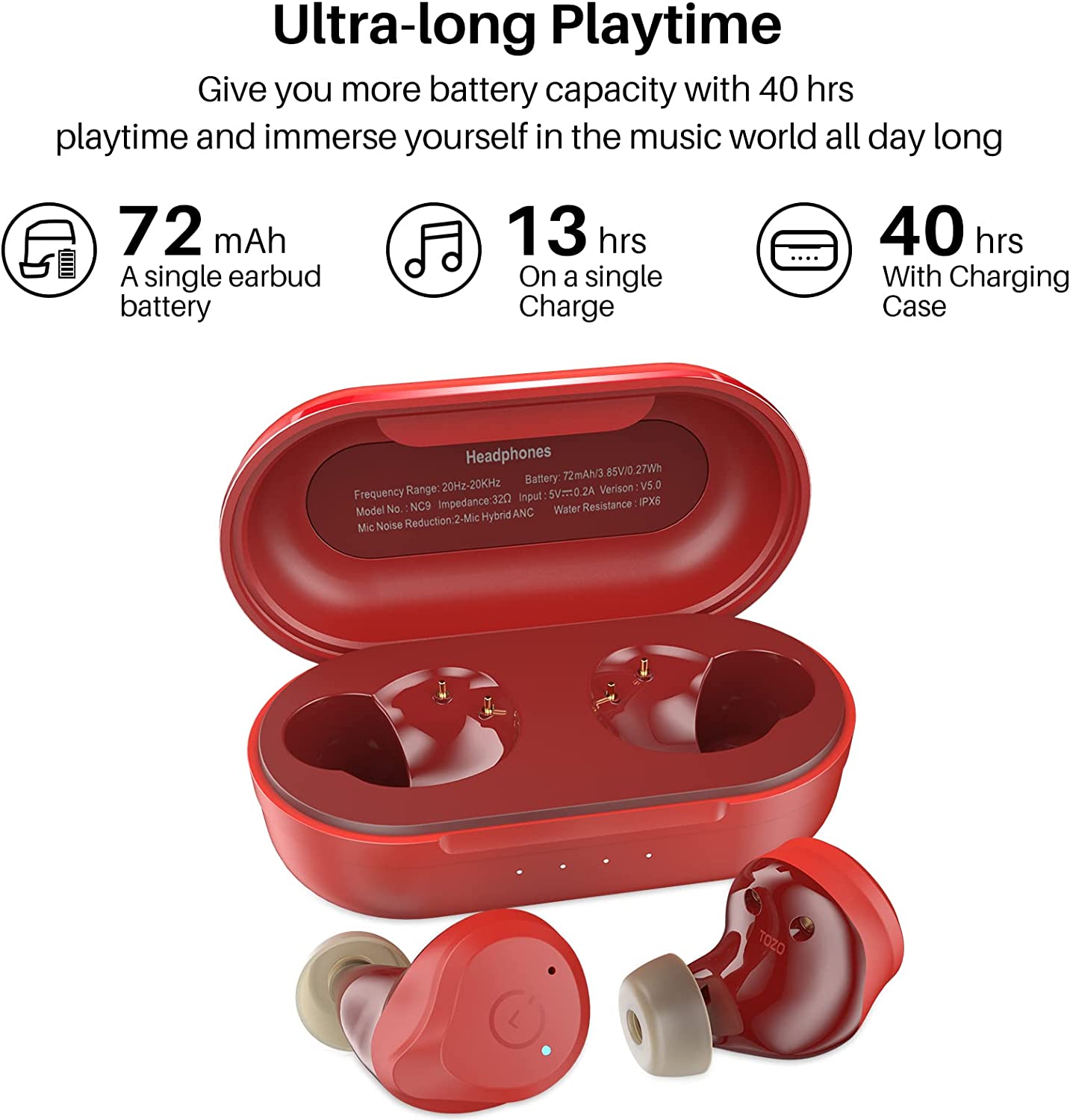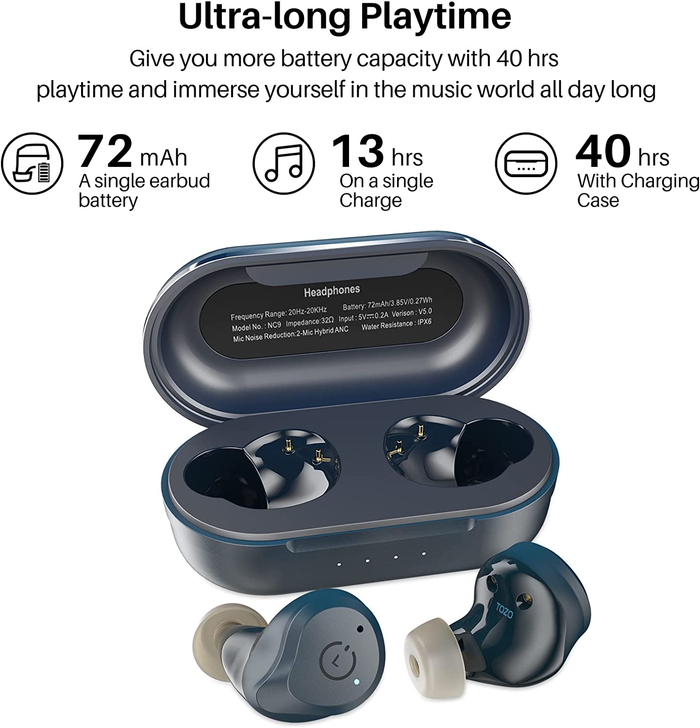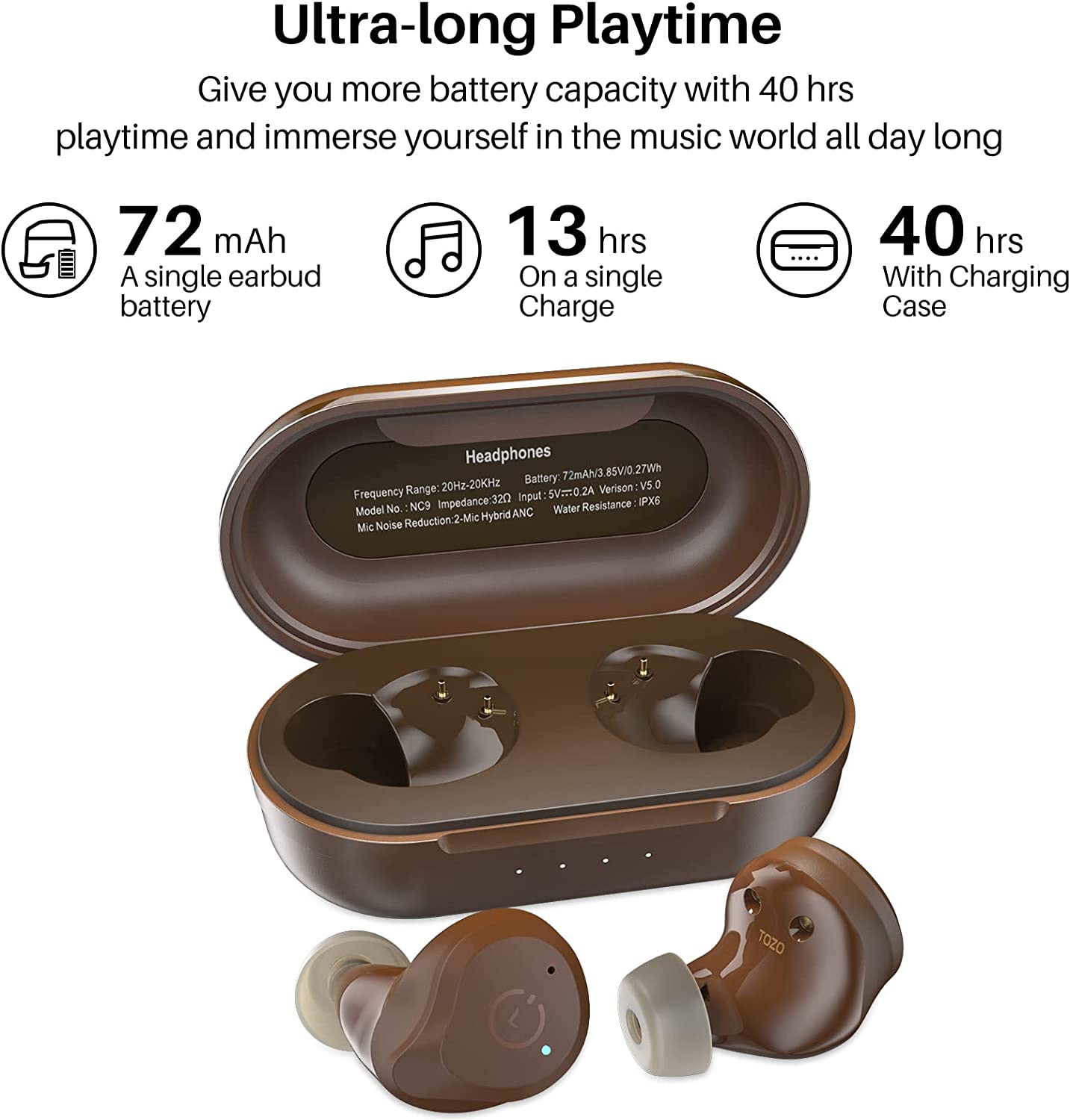• 【Charge on the Go】TOZO NC9 wireless earbuds can last for over 13 hours' playtime from a single charge and 27 extra hours in the compact charging case. In the Active Noise Cancellation mode can last for over 7 hours' play time. Providing convenient charging way with no strings attached.