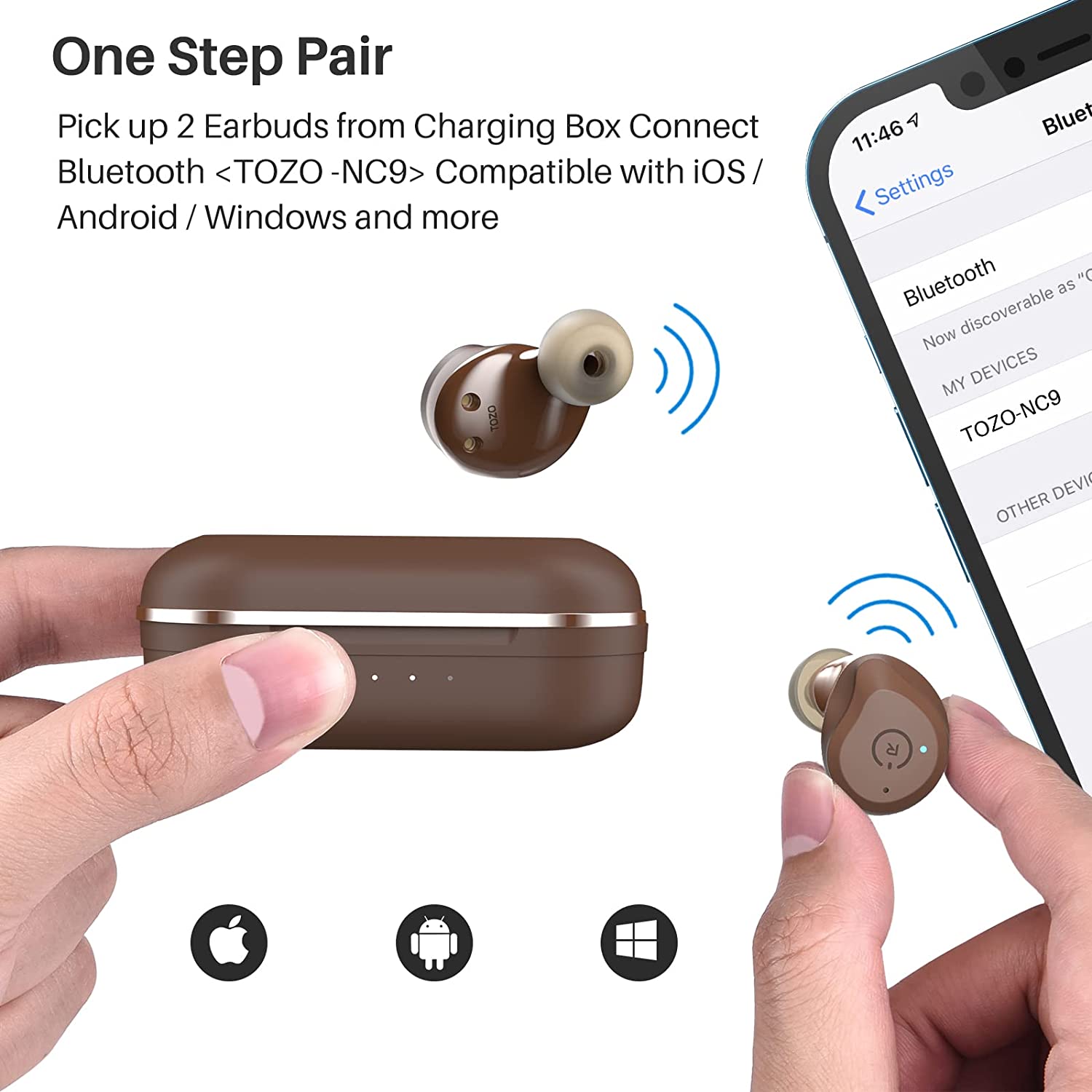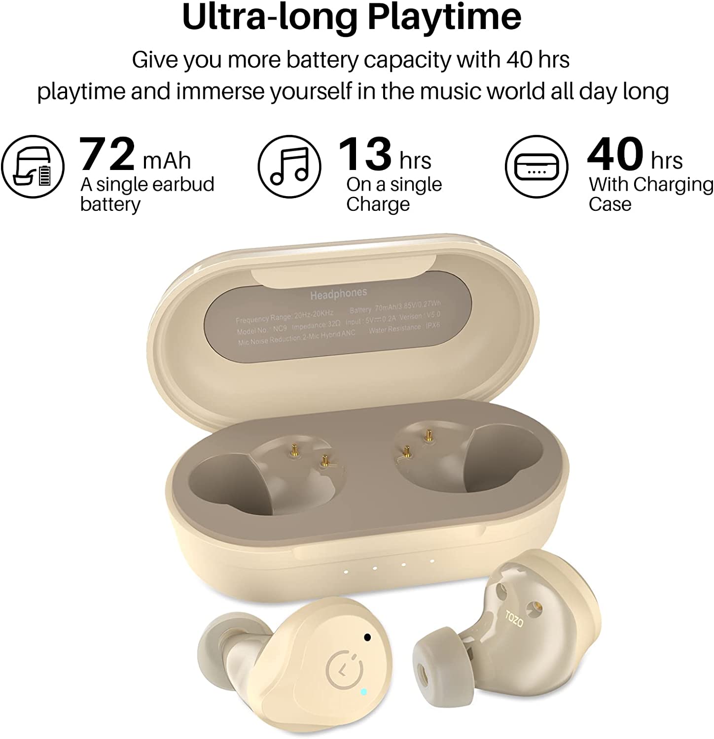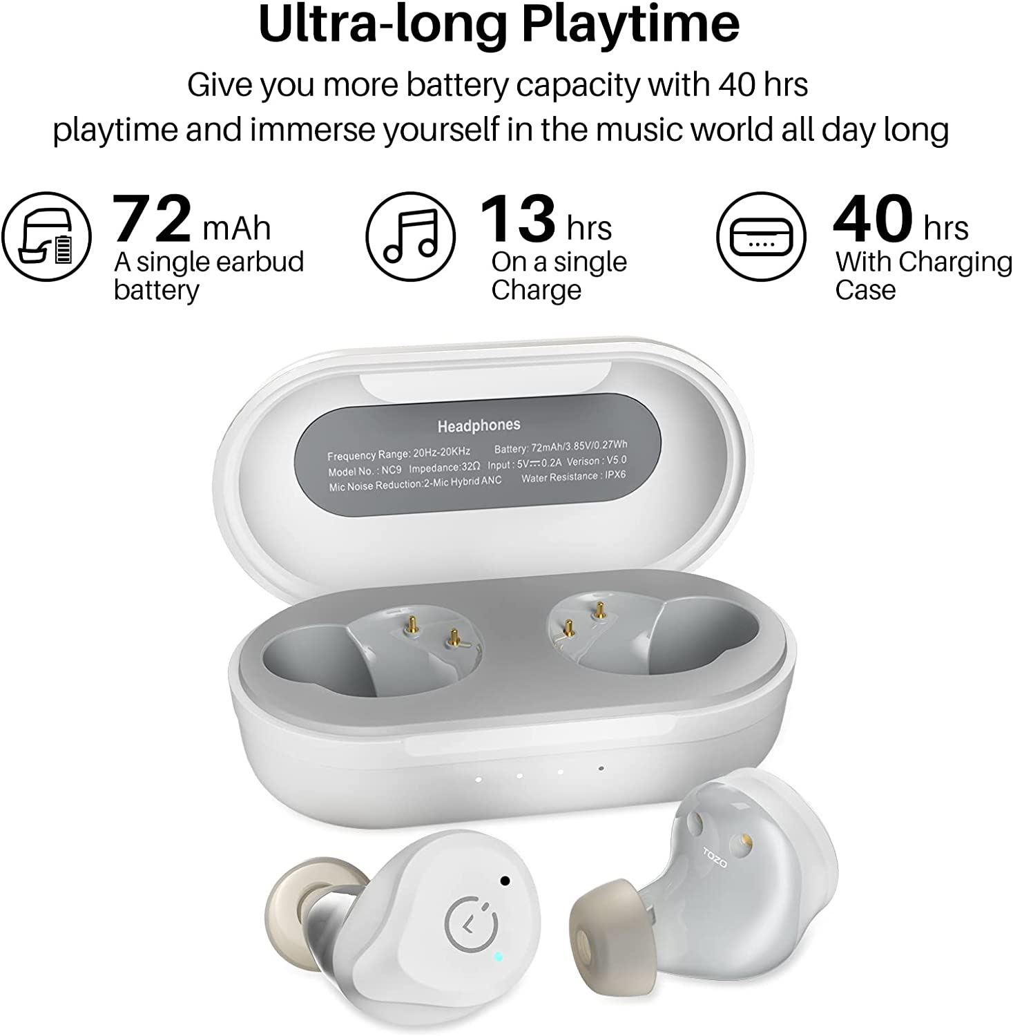 • 【Charge on the Go】TOZO NC9 wireless earbuds can last for over 13 hours' playtime from a single charge and 27 extra hours in the compact charging case. In the Active Noise Cancellation mode can last for over 7 hours' play time. Providing convenient charging way with no strings attached.