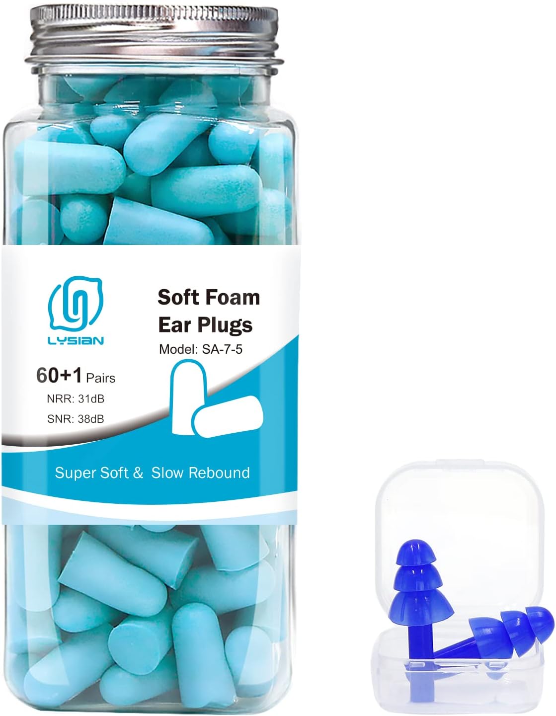 LYSIAN Ultra Soft Foam Earplugs Sleep, 38dB SNR 31dB NRR Sound Blocking Noise Cancelling Ear Plugs for Sleeping, Travel, Shooting and Working -60 Pairs Pack (Lake Blue)