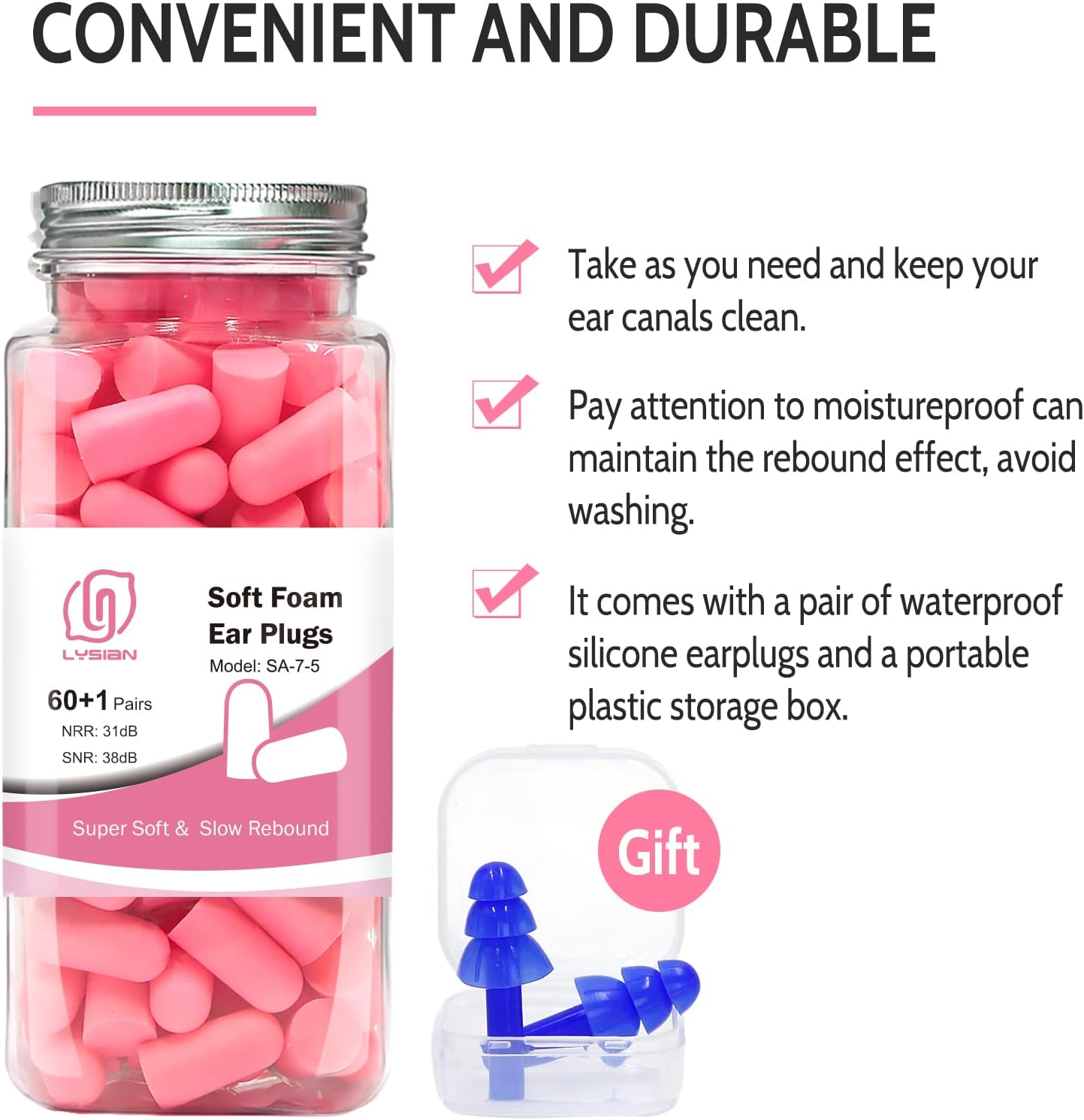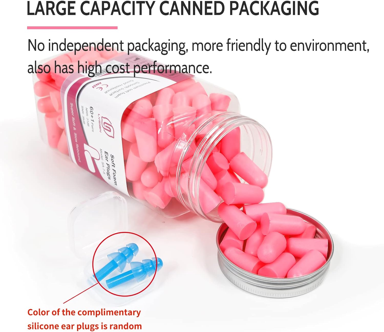 • ⭐ [LARGE CAPACITY--60 pairs]: One value pack contains 60 pairs (120 pcs) foam earplugs. Large capacity canned packaging can last 3-6 moths of usage for your family.