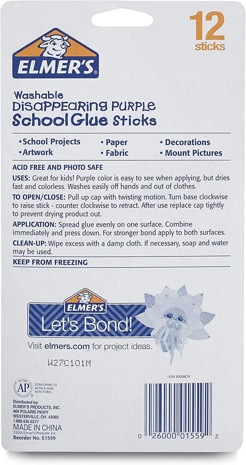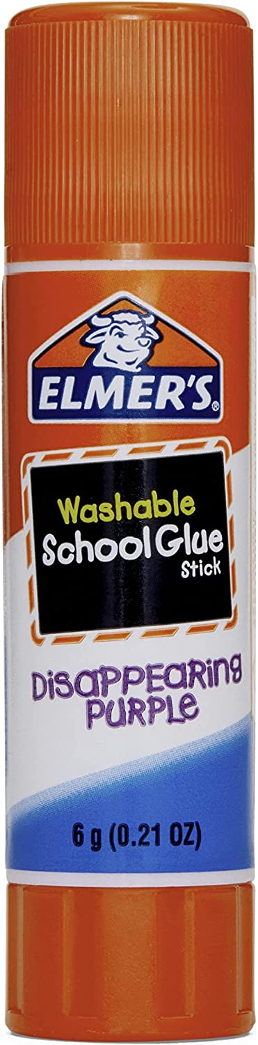 Elmer's Disappearing Purple School Glue Sticks--Elmer's Disappearing Purple School Glue Sticks go on smoothly and are great for kids. The Disappearing Purple formula goes on purple, so it is easy to see and dries clear. It is safe, non-toxic, and is a must-have for all students.