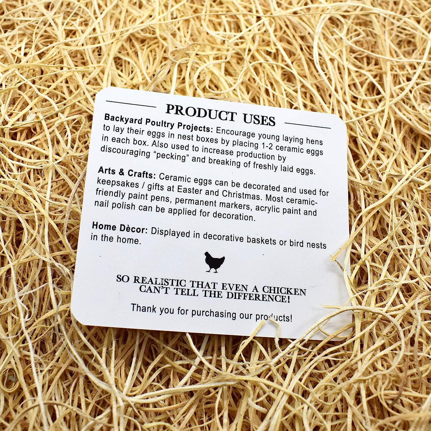 Our handcrafted ceramic eggs can be used as nest eggs, arts and crafts projects, or decor. BACKYARD POULTRY PROJECTS: Encourage young laying hens to lay their eggs in nest boxes by placing 1-2 ceramic eggs in each box. Also used to increase production by discouraging "pecking" and breaking of freshly laid eggs. ARTS & CRAFTS: Ceramic eggs can be decorated and used for keepsakes / gifts at Easter and Christmas. Most ceramic-friendly paint pens, permanent markers, acrylic paint and nail polish can be applied for decoration. HOME DECOR: Displayed in decorative baskets or bird nests in the home.