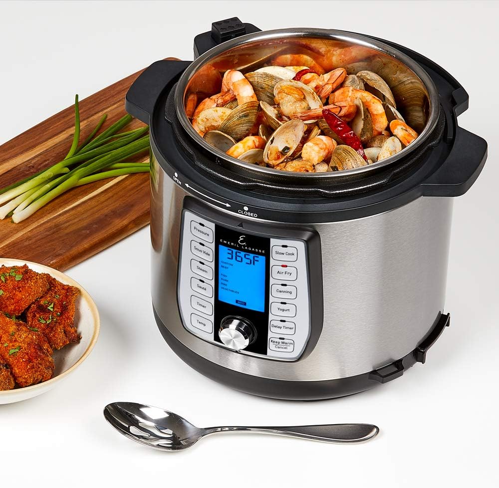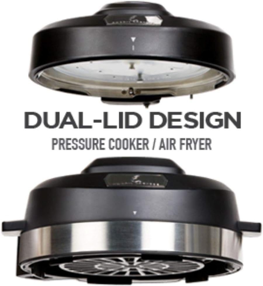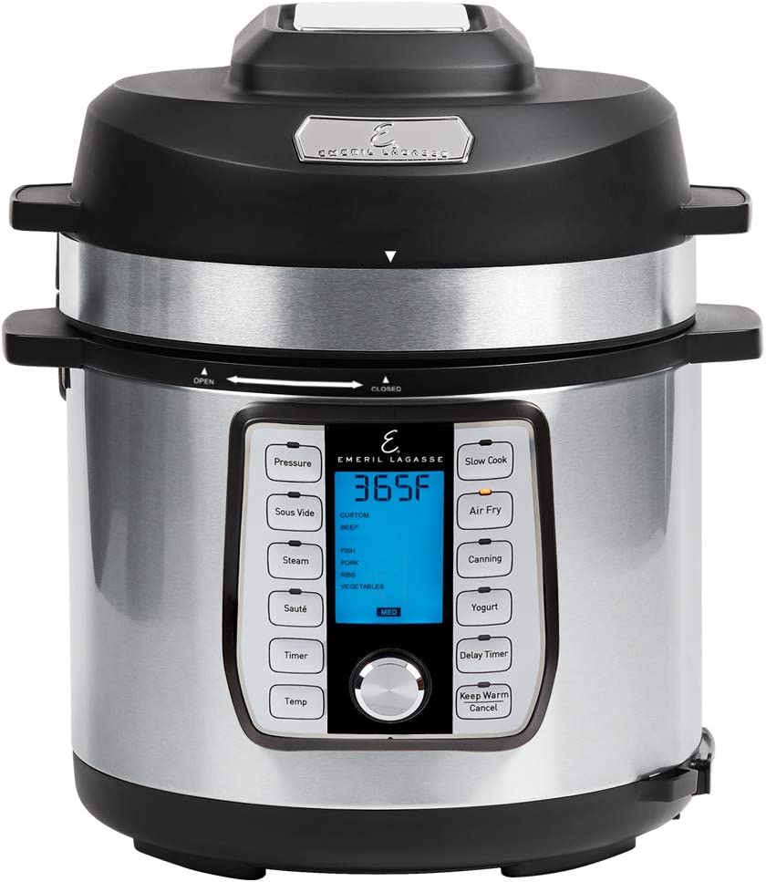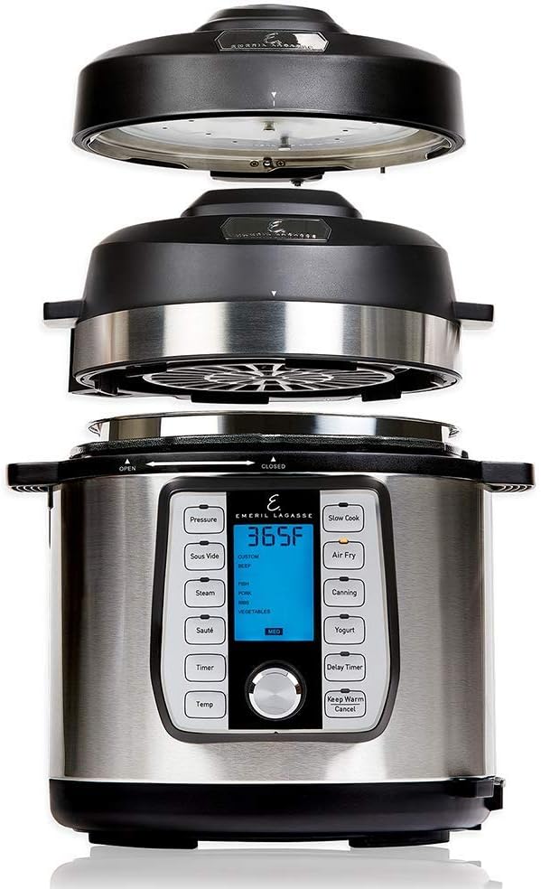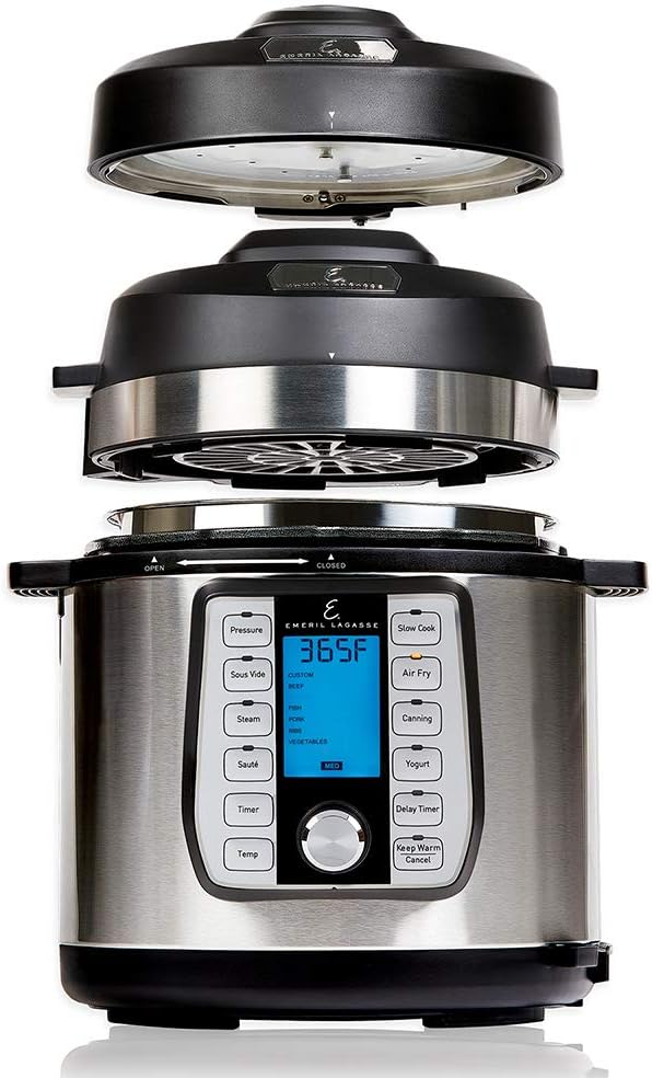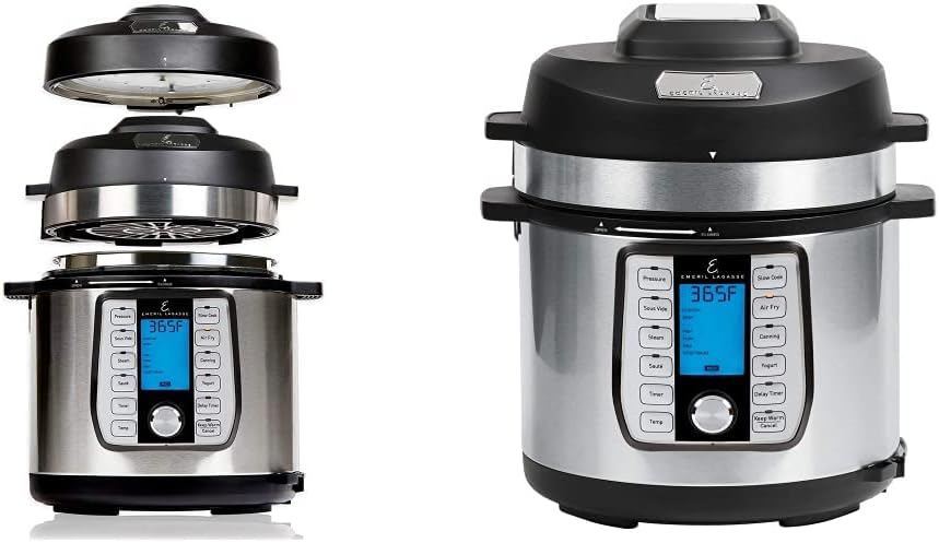 Pressure Cook Tender – Air Fry Crisp! The Pressure Air Fryer 6 Quart Deluxe by Emeril Lagasse is a pressure cooker and crisping air fryer – all-in-one stainless steel pot. Crisp almost any meal with the perfect caramelized, golden brown finish. First, pressure cook to tenderize, lock in juices, and infuse flavor – up to 70% faster vs. traditional ovens. Roast chickens are falling-off-the-bone juicy with the perfect crispy skin, macaroni and cheese gets a crunchy breadcrumb topping, serve chili with the perfect golden cheesy finish, or bake your favorite sweet dessert with a crisp crumble. Pressure Cook faster vs. traditional ovens with two pressure levels, even when you’re in a rush. technology calibrates the precise time, pressure, and temperature required. Greaseless fryer gives you up to 70% fewer calories from fat vs. a deep fryer, so you can enjoy healthier versions of the same French fries, blooming onions, onion rings, and more. Rapid Air Technology creates a whirlwind of superheated air for crisping on all sides – even from frozen! Perfect Crisping Outside – Juicy Stays Inside: Pressure cook for an extra-tender result full of moisture and flavor, then use the airfryer crisper lid for a crispy golden finish. Enjoy the perfect combination of pressure cooking and air frying – all in one pot. 44 Programmable Cooking Functions – LCD Digital Display: Pressure Cook – custom (with recipes), beef, poultry, fish, pork, ribs, vegetables, beans, egg, barley, quinoa, risotto, white rice, brown rice, bake. Air Fry – custom (with recipes), beef, poultry, fish, bake, vegetables, dehydrate. Slow Cook – beef, poultry, pork, ribs, vegetables. Steam – fish, eggs, vegetables. Sauté – beef, poultry, fish, pork, ribs, vegetables. Sous Vide – beef, poultry, fish, pork, vegetables, egg. Canning – Default Cook Time: Short 10 min. /Med. 1h/Long 2h. Yogurt Maker – Default Cook Time: Short 5h/Med 7h/Long 9h.