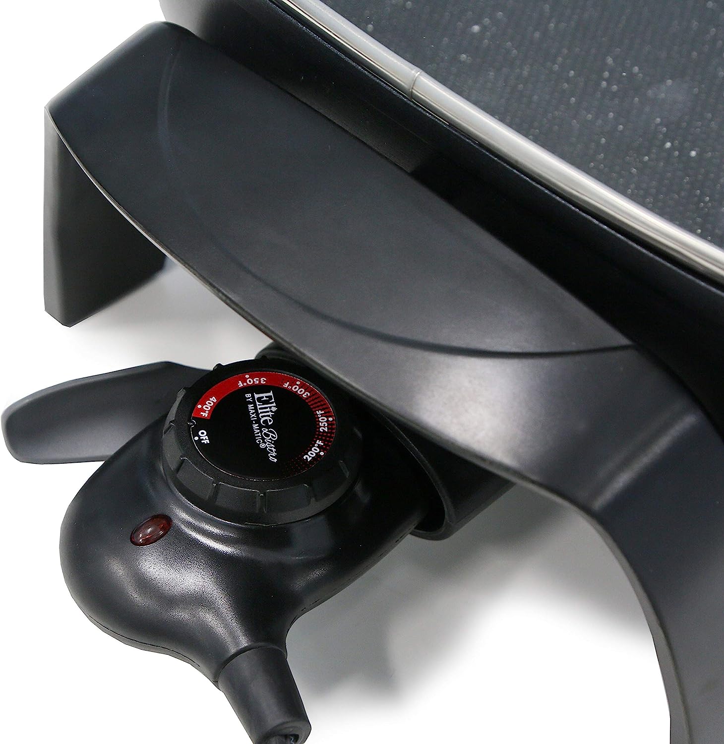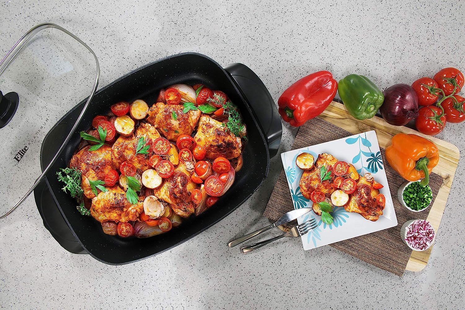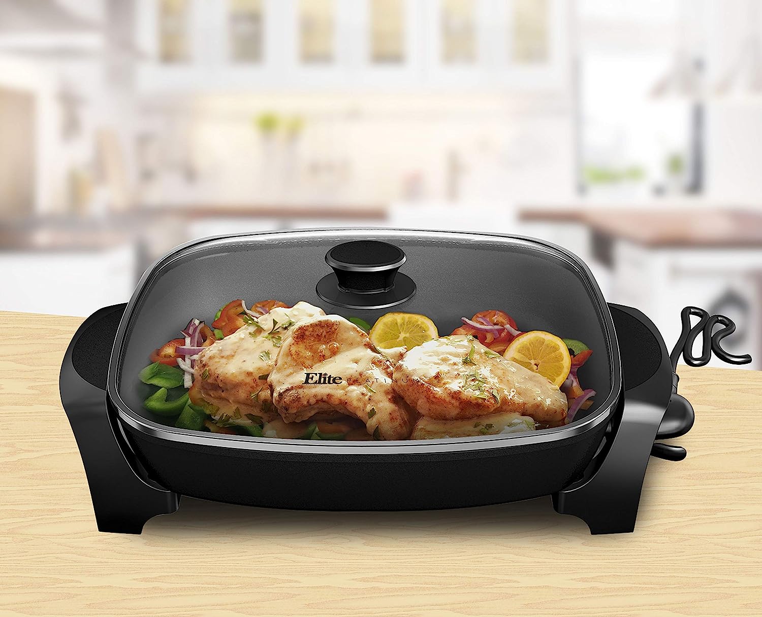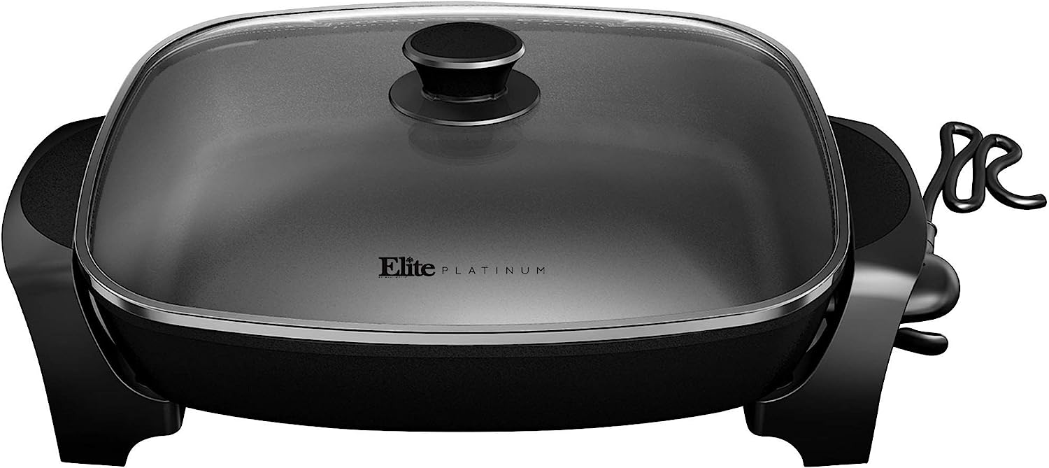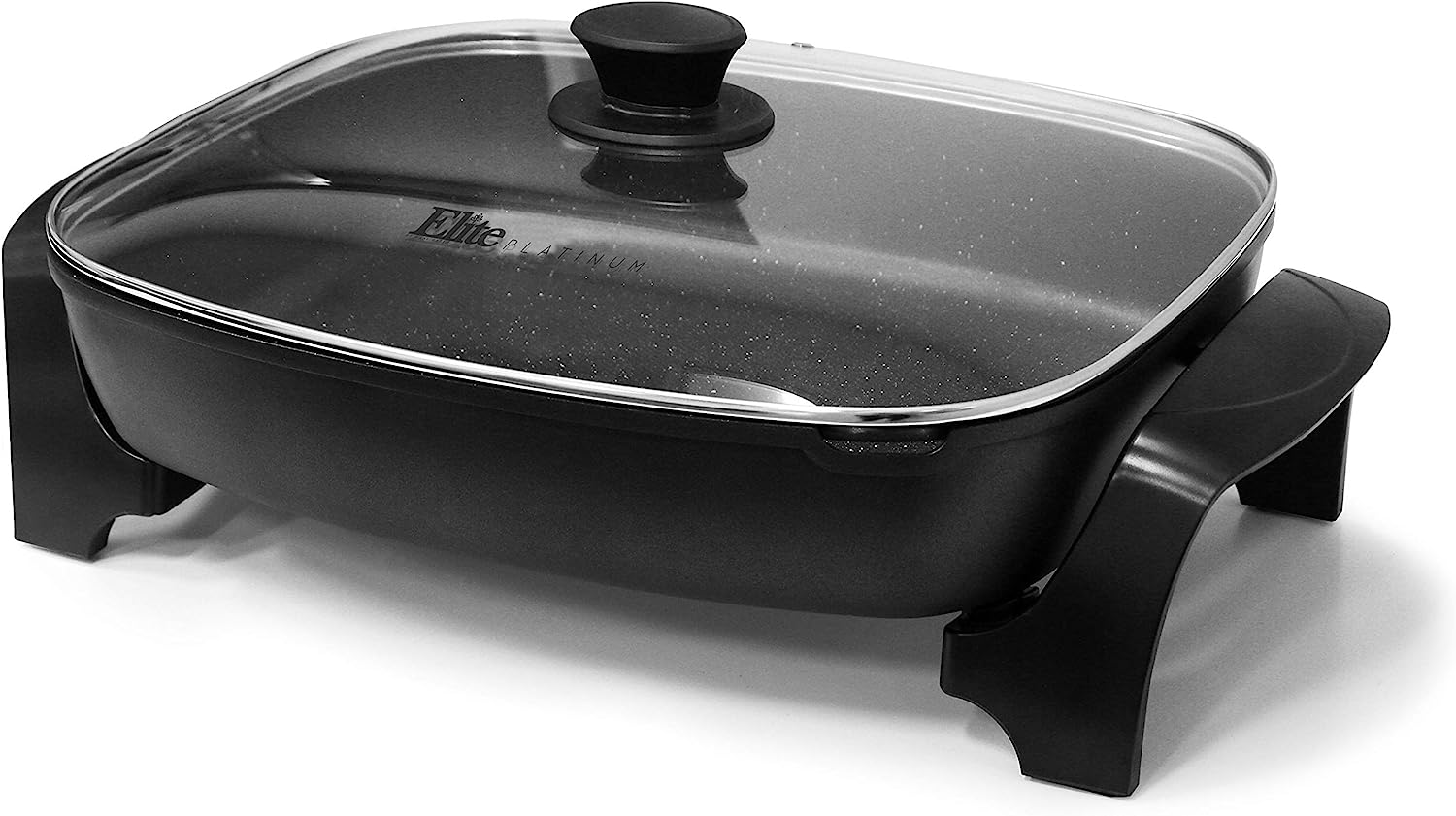 The Elite Platinum 16-inch x 13-inch Jumbo Electric Skillet sears, fries, grills, roasts, stews, and more making it easy to cook your favorite food in just one appliance. With its heavy duty non-stick stone finish, clean up is easy. The fully embedded M-Shaped heating elements are superior in heating faster and more evenly. Use it to cook anything from eggs and sausage to hamburgers and steaks, even sauté your favorite vegetables. Features a tempered glass lid and cool-touch handles for safe and easy servingcook and serve directly out of the skillet! Designed for both style and function, the heavy durable cast aluminum base prevents any warping from high temperatures and the high side walls prevent food spillage. Using the Easy-Pour spout, you can easily pour contents out of the skillet for serving sauces or soups without having to use a ladle or spoon. Also includes a stainless steel wire rack perfect for steaming or grilling!