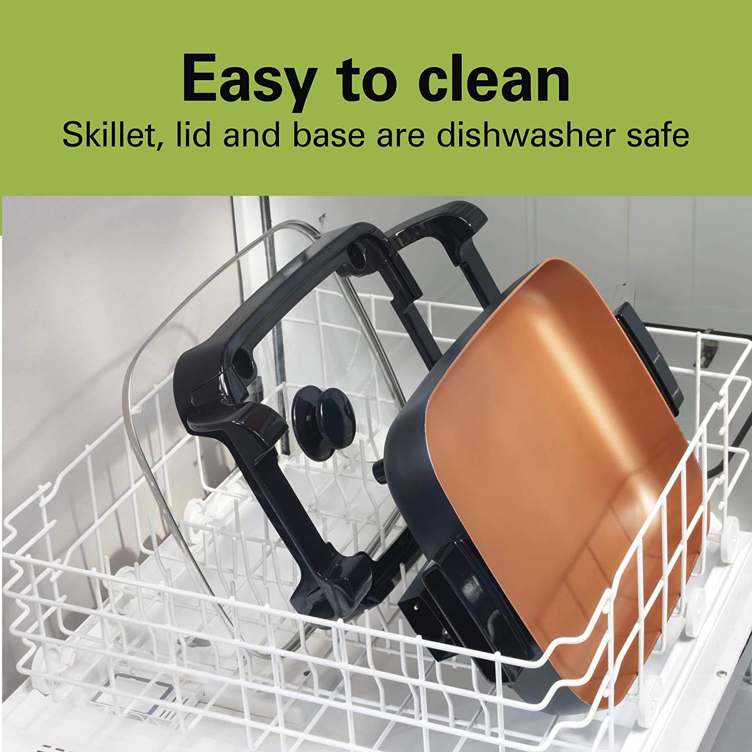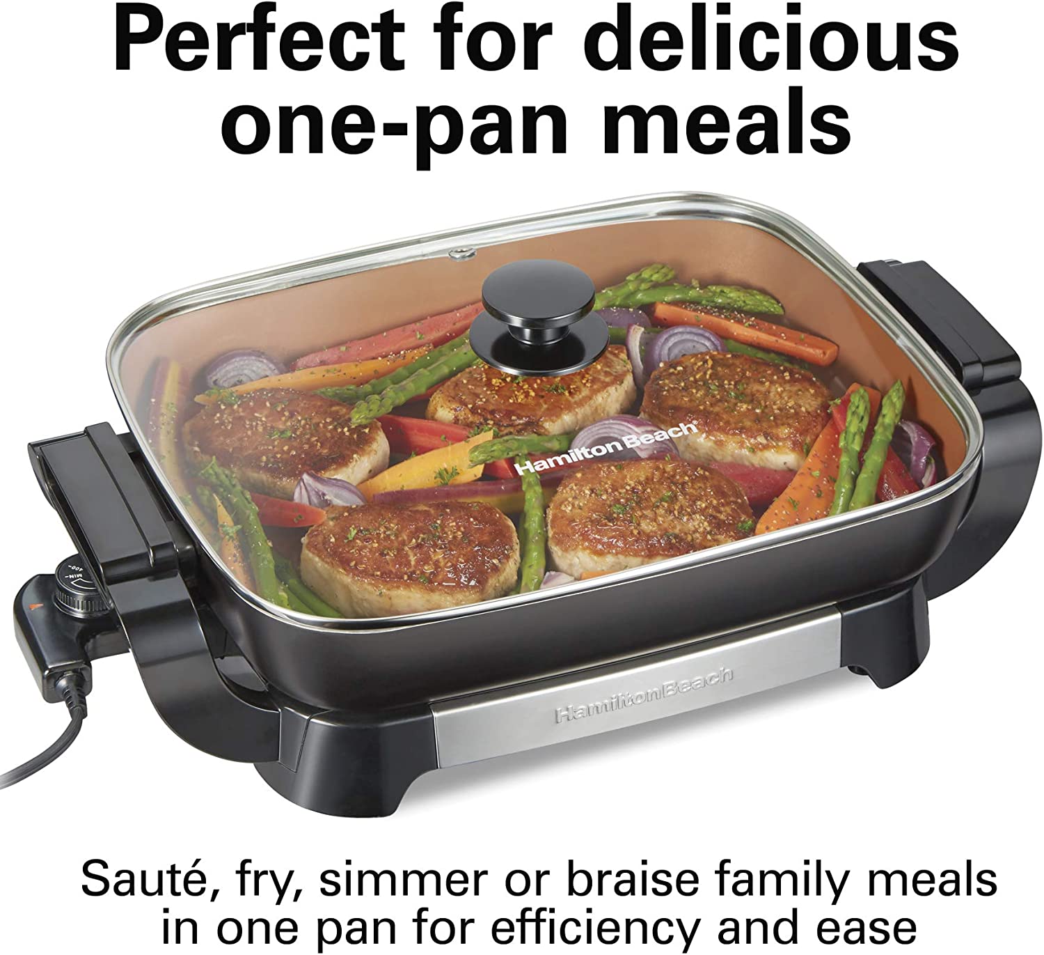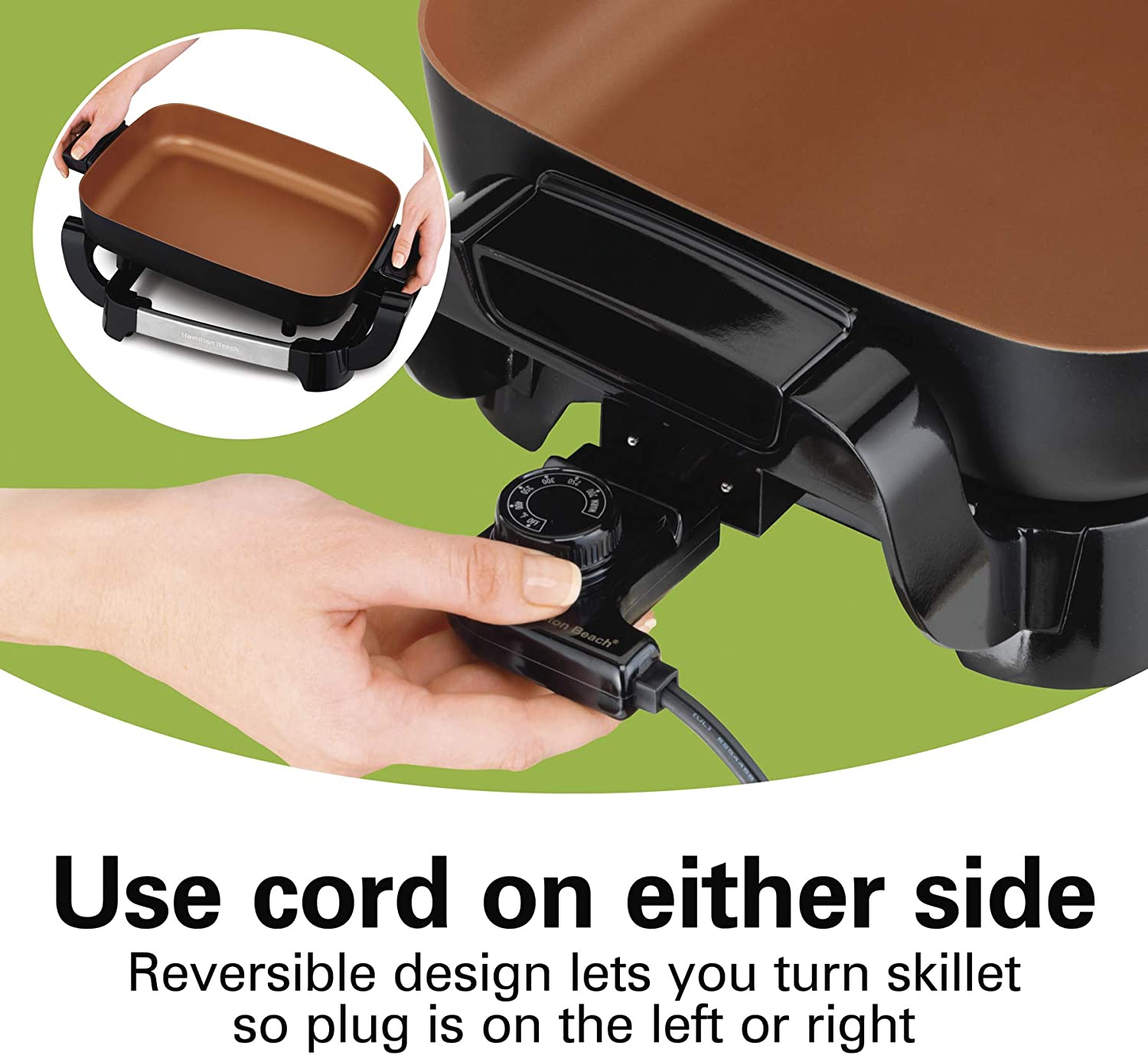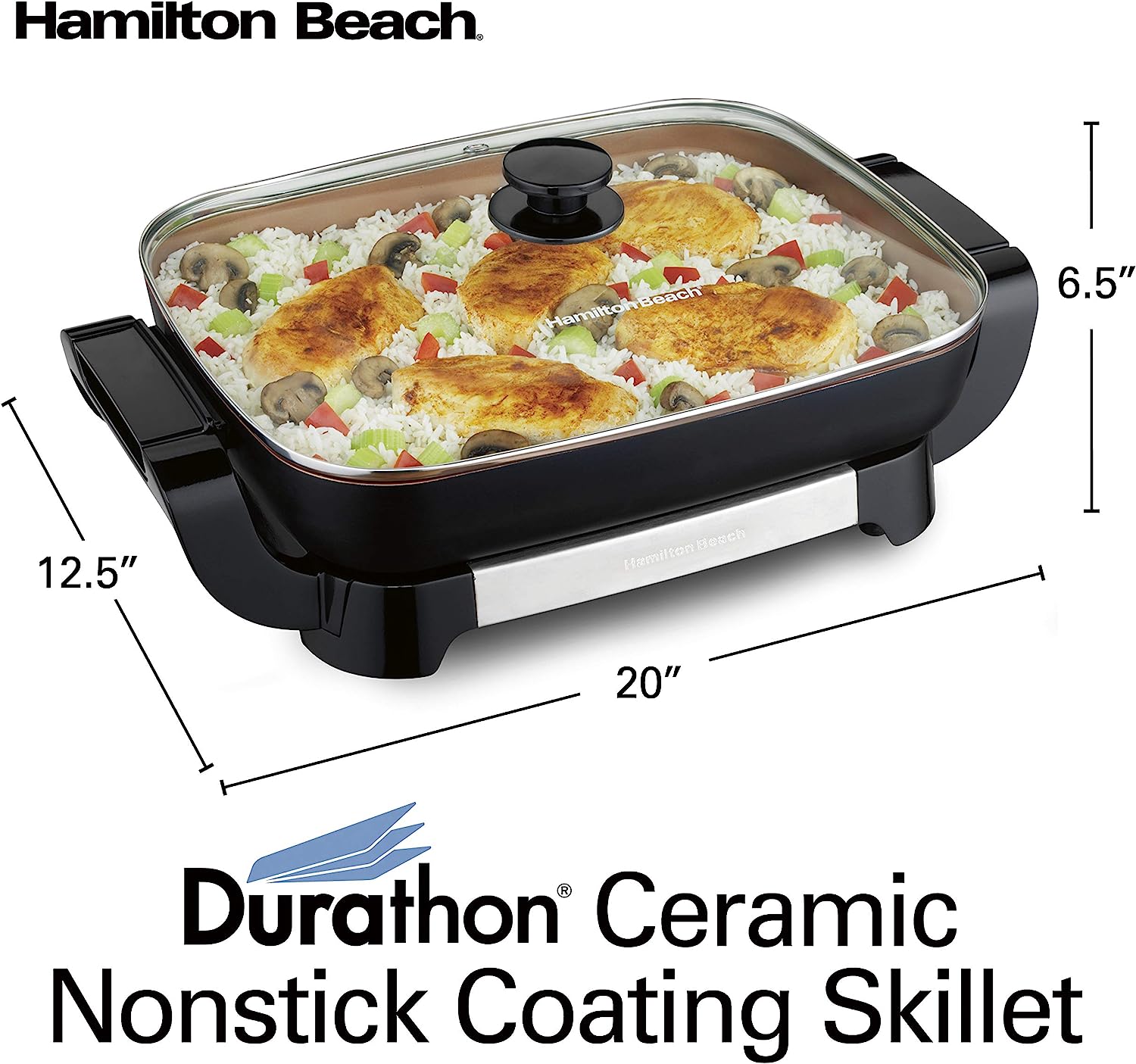 The Hamilton Beach® Durathon® Ceramic Skillet comes with a removable 12"x15" skillet for easy serving and cleanup, plus it is reversible so the cord can be used on either side. Nonstick ceramic surface is four times more durable than traditional nonstick.