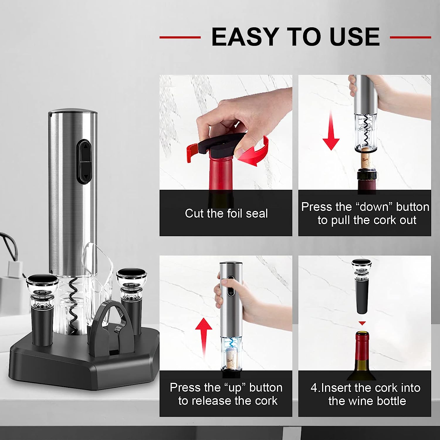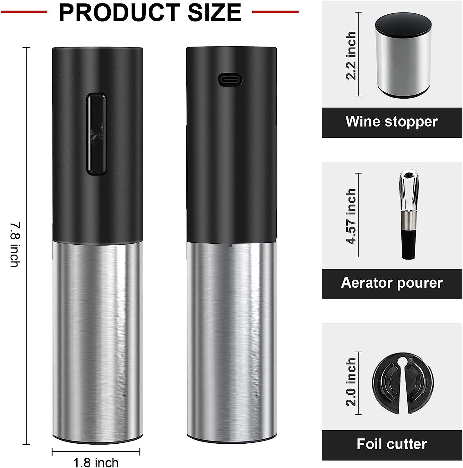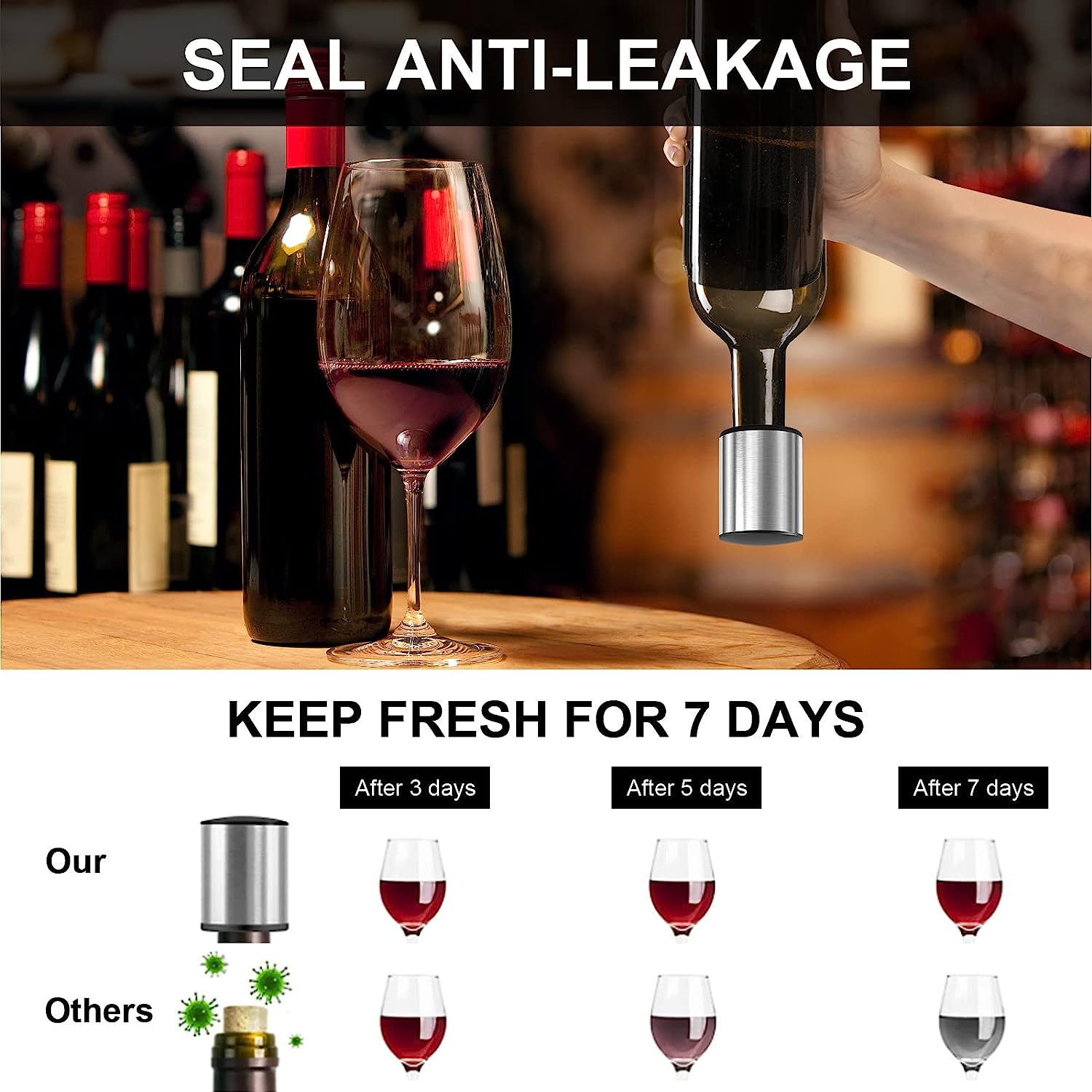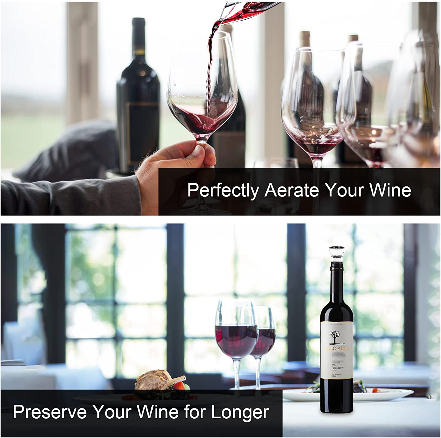 • 🍷🎁【EFFORTLESS USAGE】 Remove the foil seal with the foil cutter.Then,easy to pop open a bottle just in 6 seconds with the wine opener and it has longer using life than other battery operated opener. Dispenser makes wine pouring smooth and aerate wine quickly with the press of a button. And when the party comes to an end, simply seal up the bottle with the bottle stopper, which can keep wine fresh up to seven days.This process provides a first-class wine-drinking experience at an affordable price.