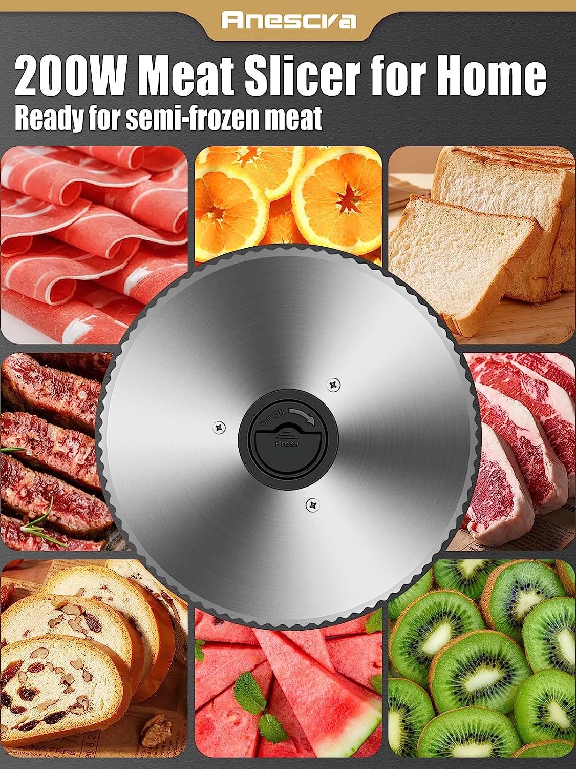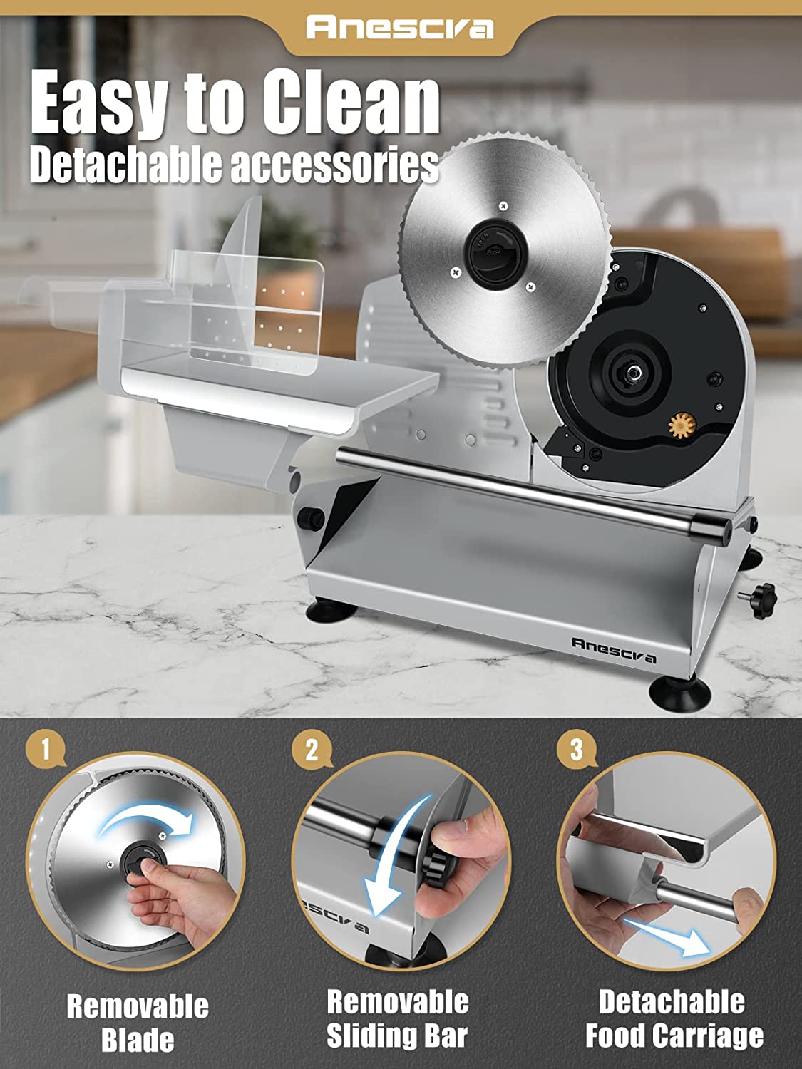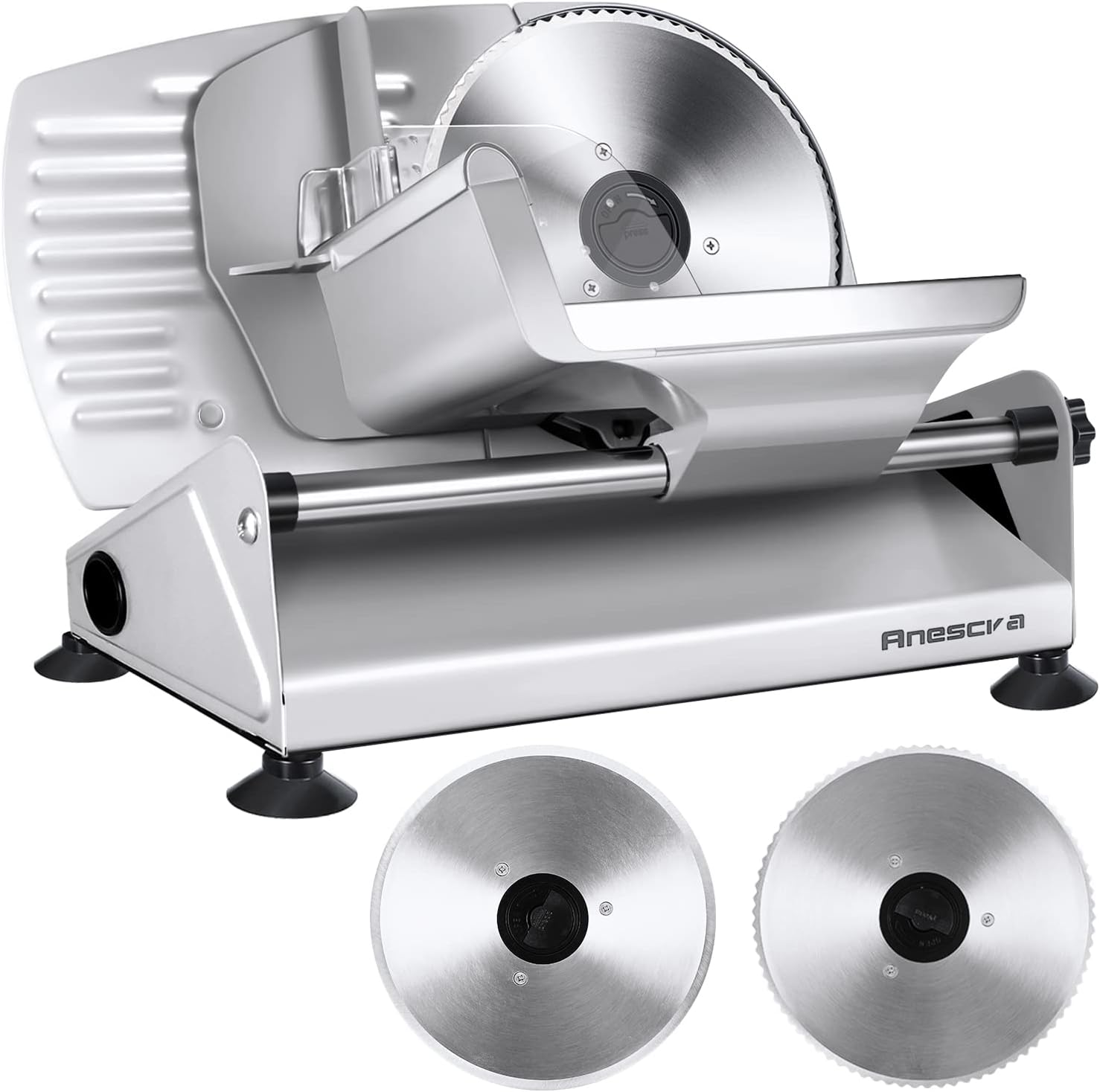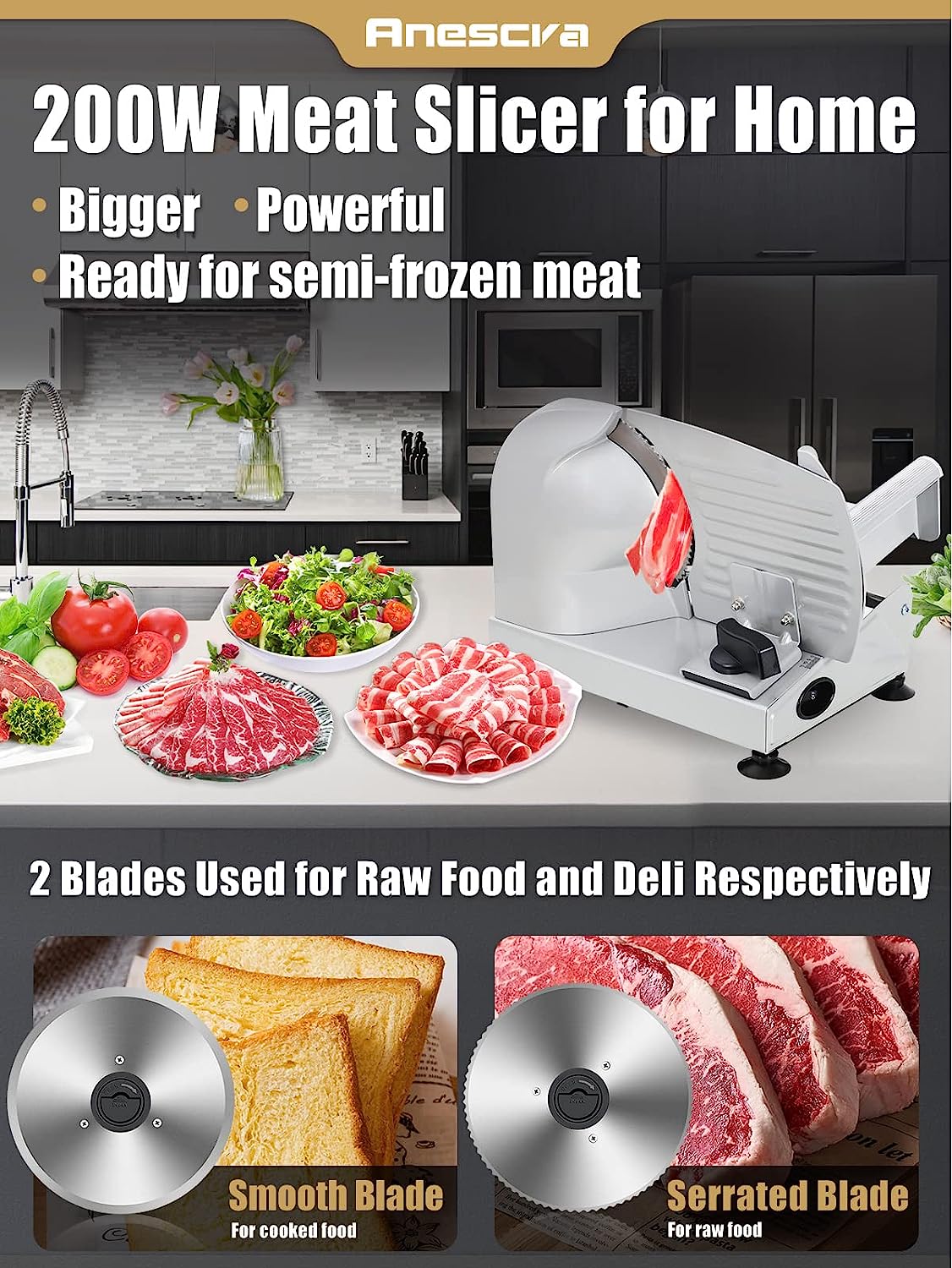 Meat Slicer, Anescra 200W Electric Deli Food Slicer with Two Removable 7.5’’ Stainless Steel Blades and Food Carriage, 0-15mm Adjustable Thickness Meat Slicer for Home, Food Slicer Machine- Silver