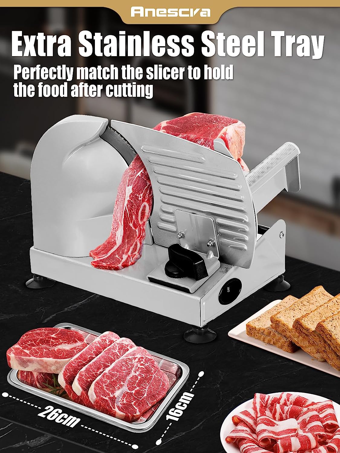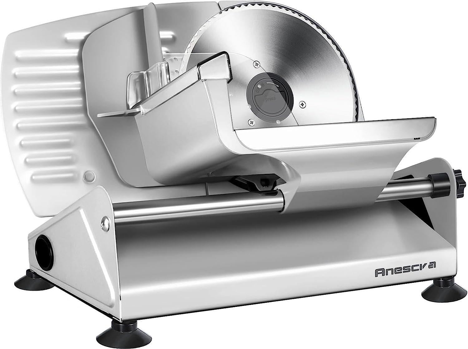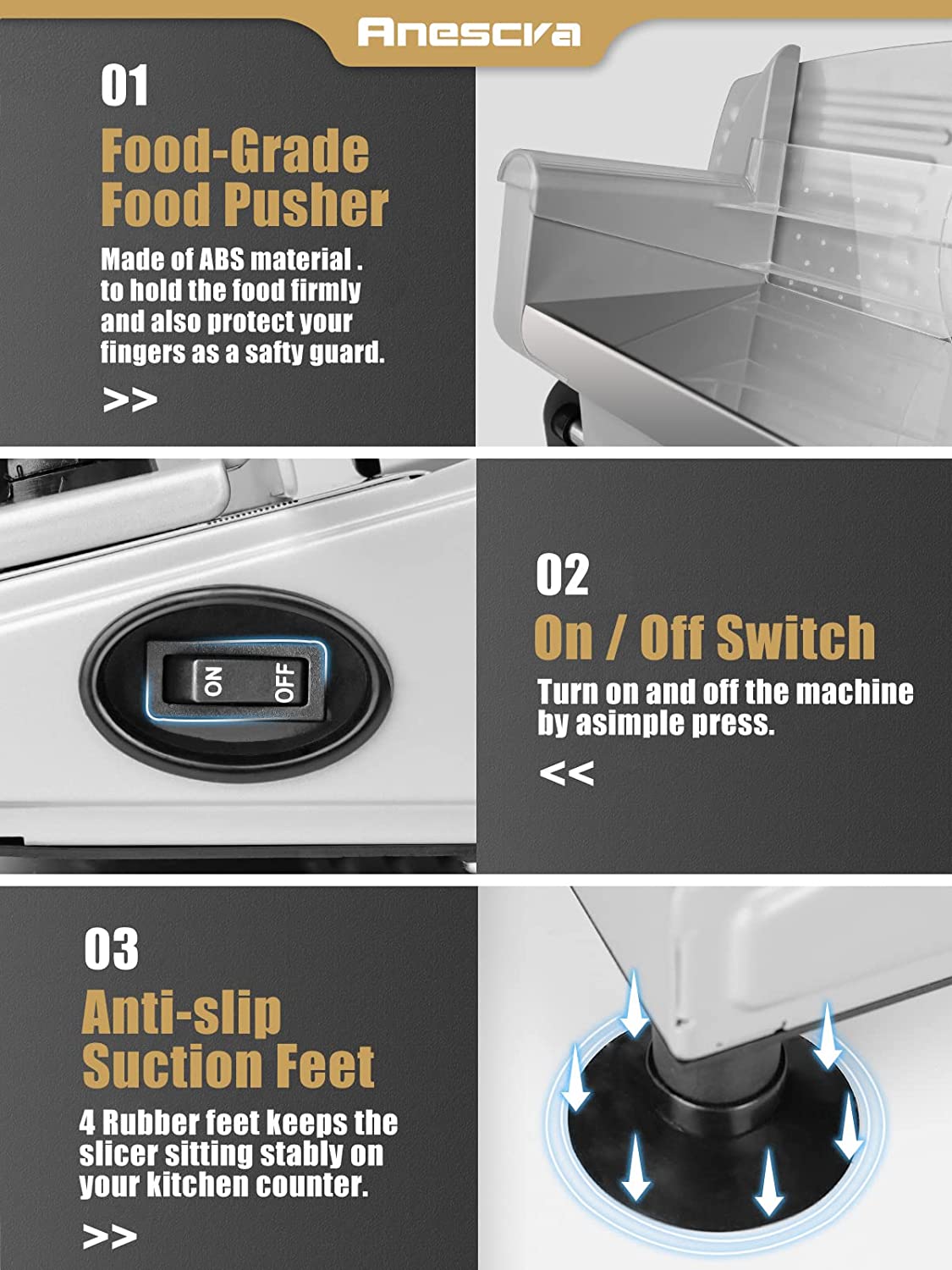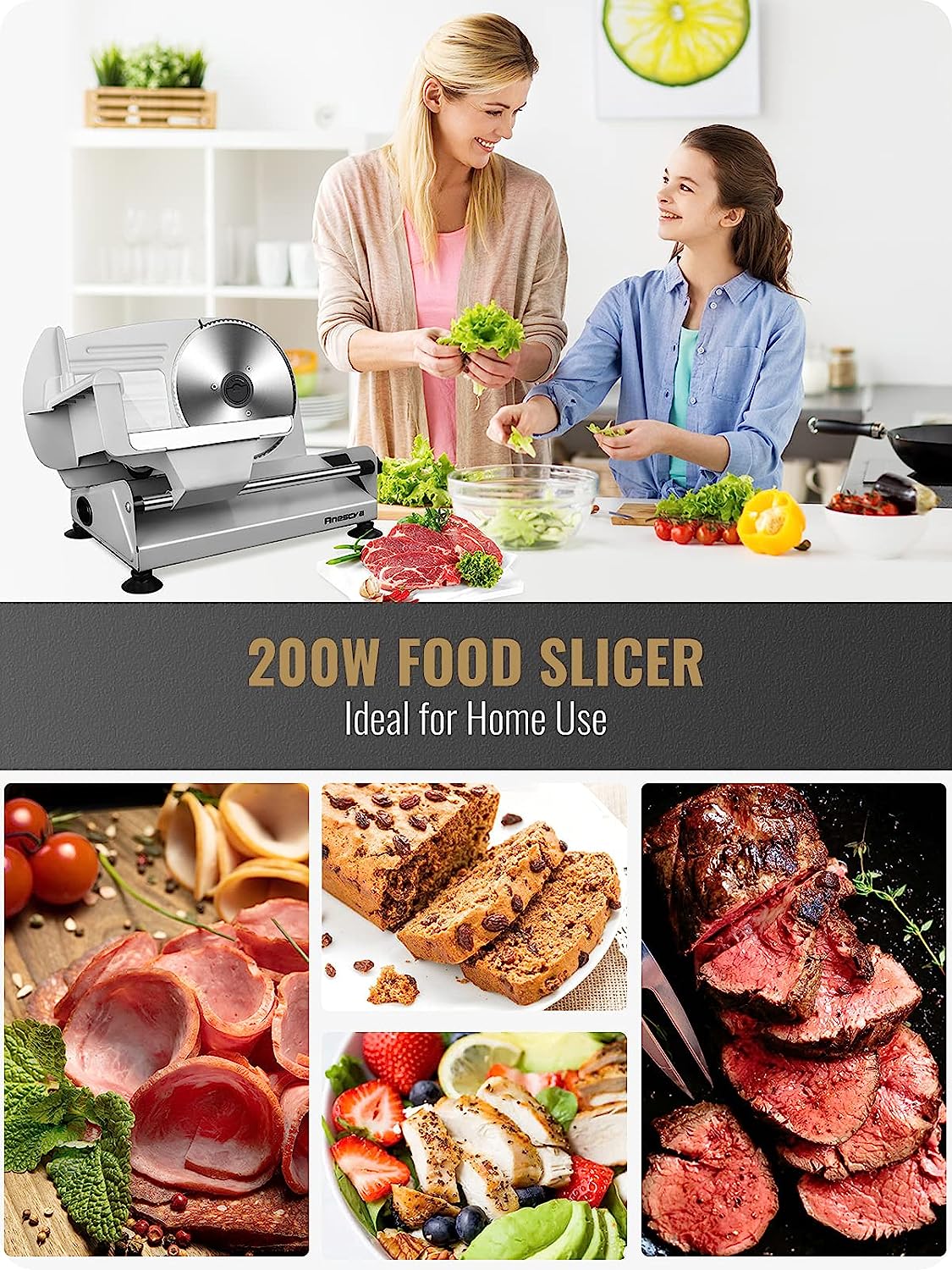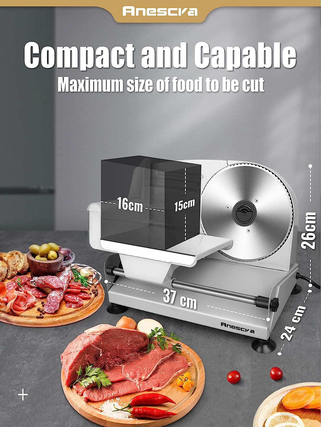 • ✔ Compact and Durable Design: The construction is solid cast aluminum, which should give you a long lasting and durable body that can take a lot of abuse. With a sleek, compact lightweight design, this deli slicer is small enough for most cabinets and countertops. Perfect for weekday lunch prep or crafting gourmet meals.