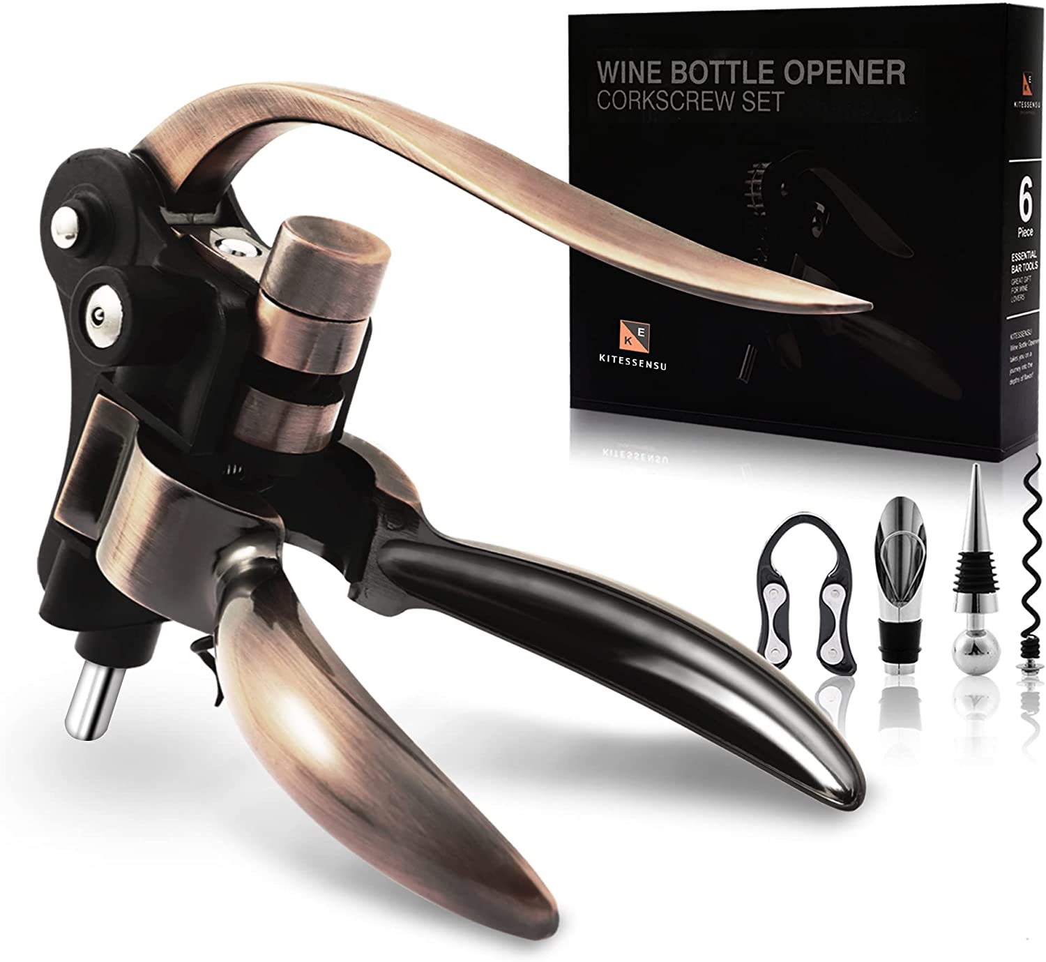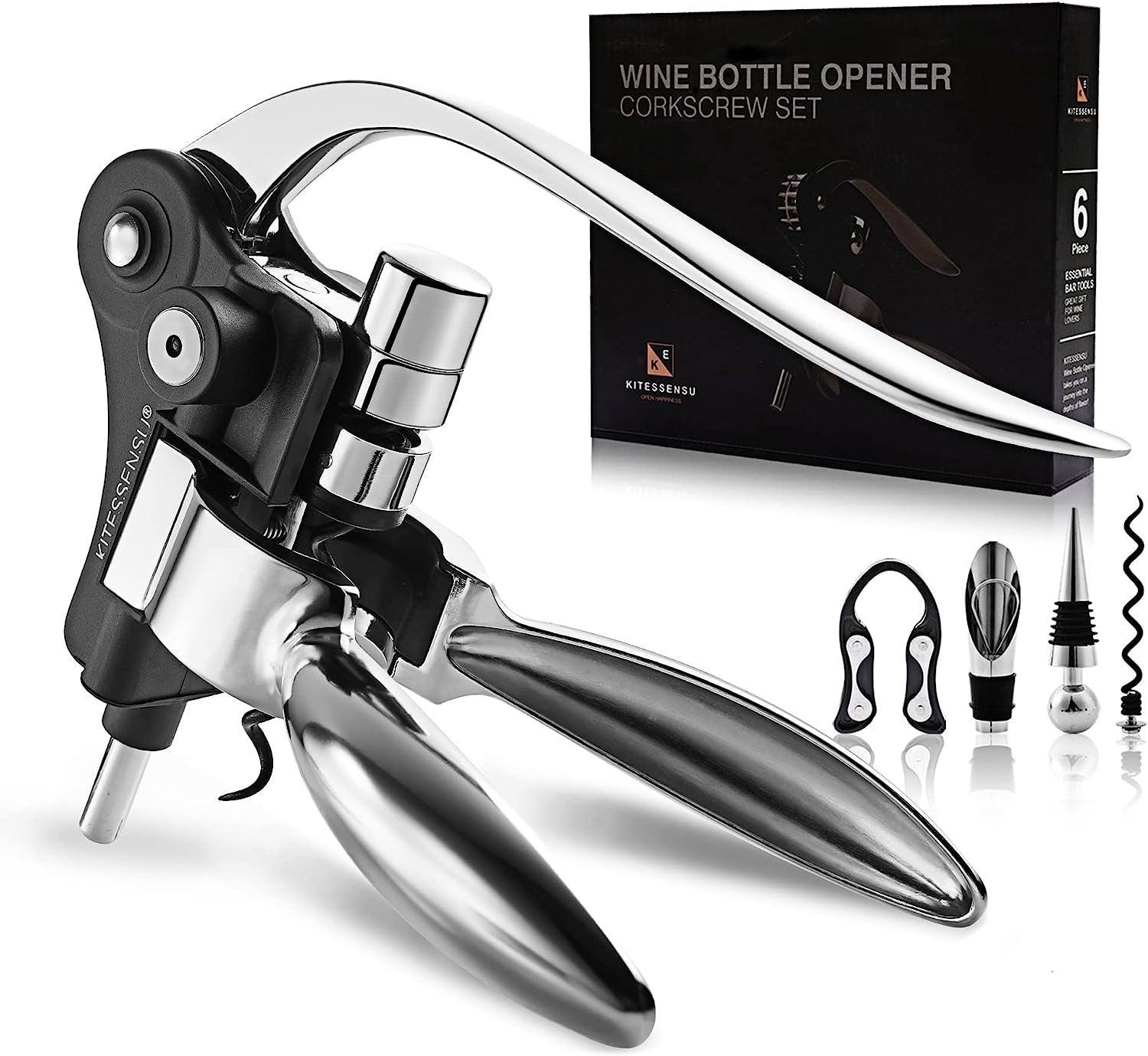 Wine Opener, KITESSENSU Easy Lever Wine Corkscrew with No-Stick Worm, 6-Piece Wine Bottle Opener Set with Foil Cutter, Bottle Stopper, Pourer, Extra Cork Screw and Base, Silver