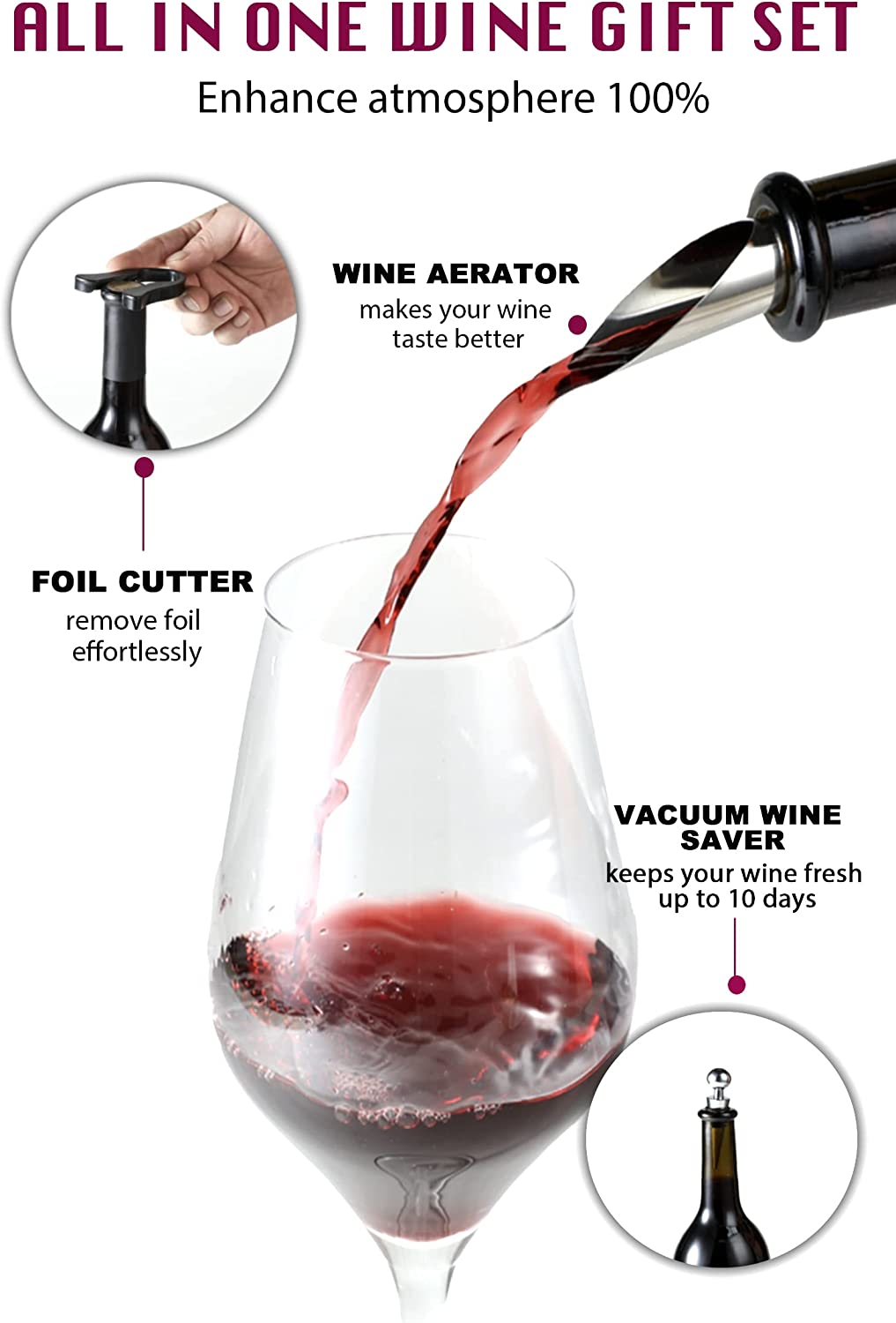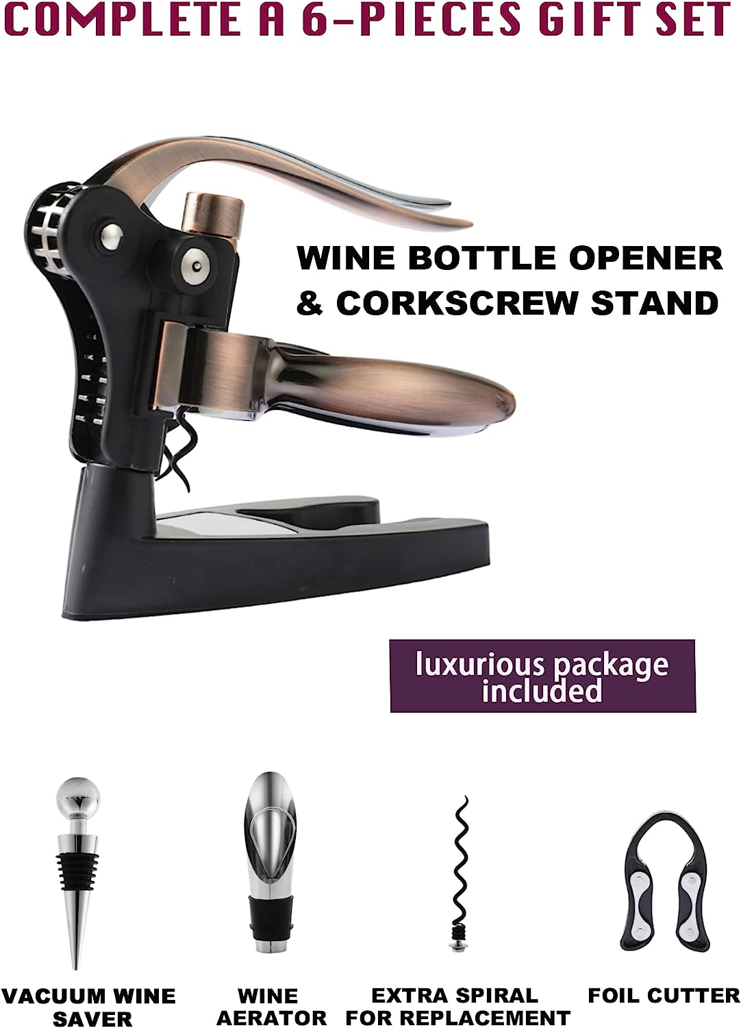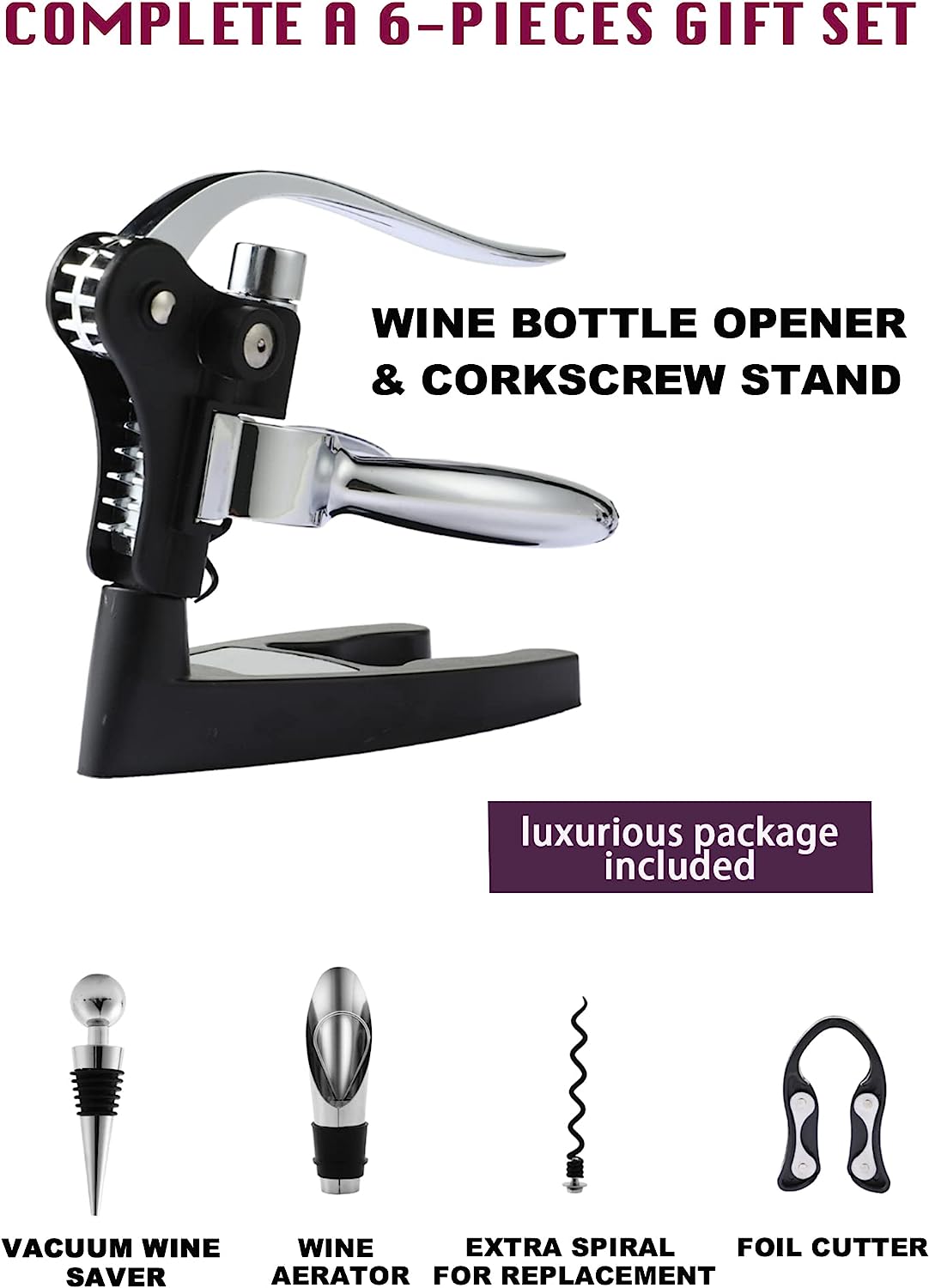 • Ultimate Wine Opener Set - These wine opener kits will take your sip experience to a whole new level, thanks to the inclusion of a foil cutter that will guarantee easy cork access, while the aerator pourer helps to enhance the flavor of your wine and the bottle stopper ensures your wine bottle is fully-sealed after open, one extra non-stick screw included for long-term use, and the base for display the beautiful wine opener