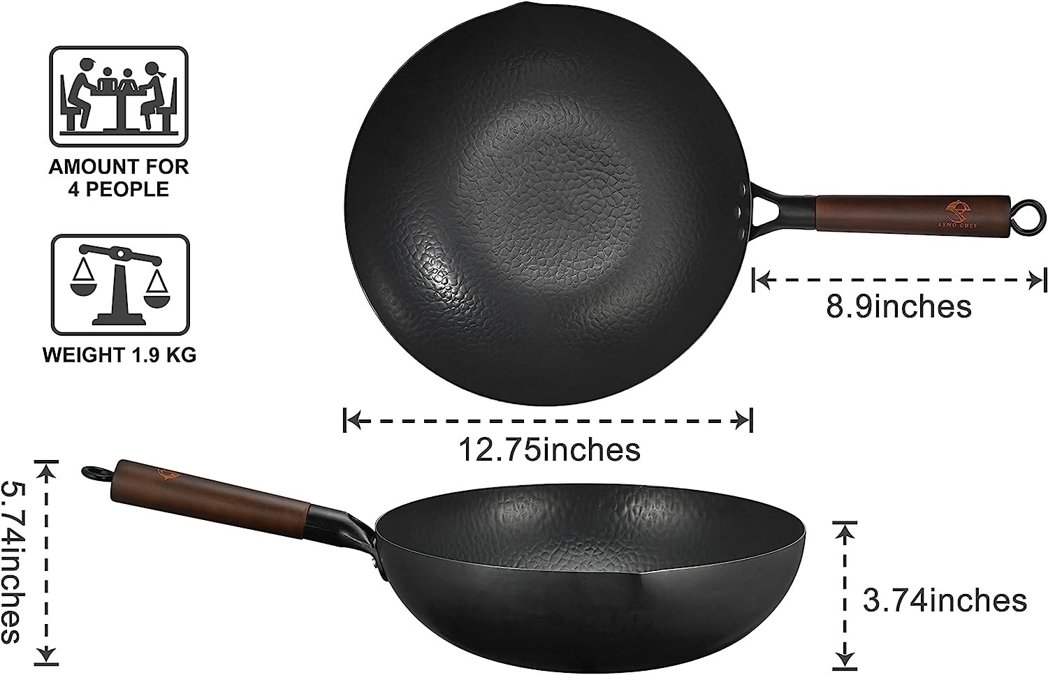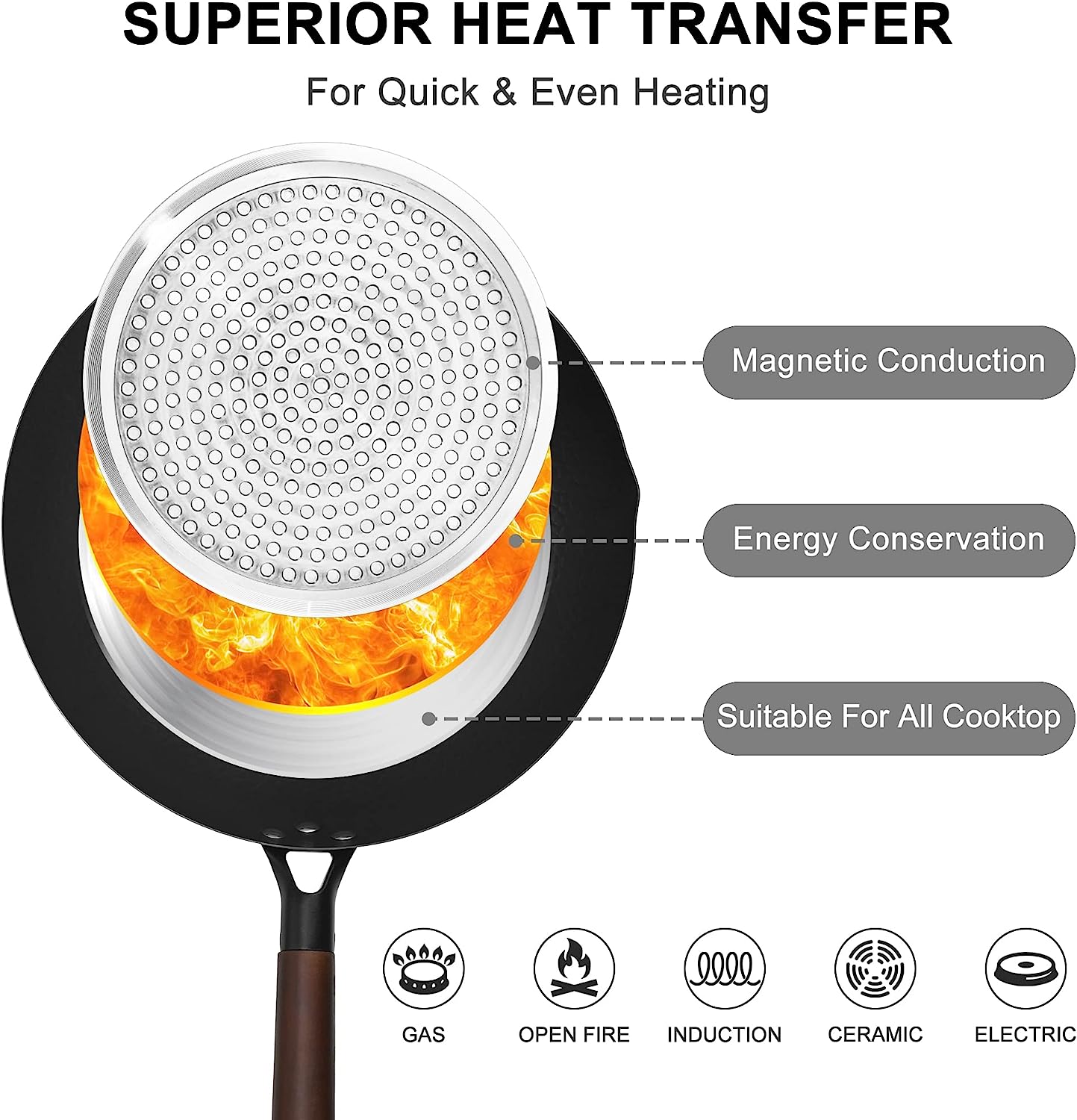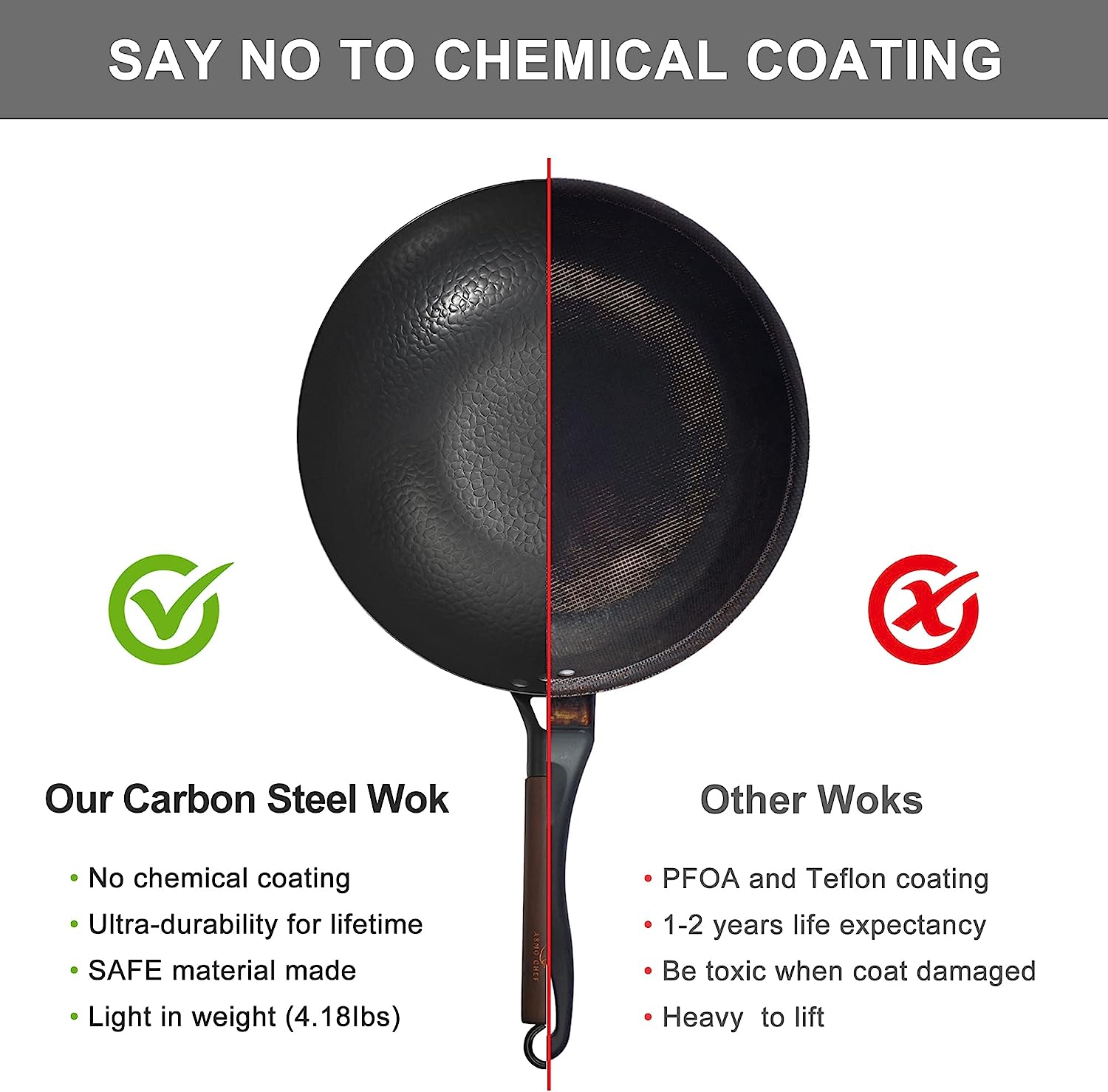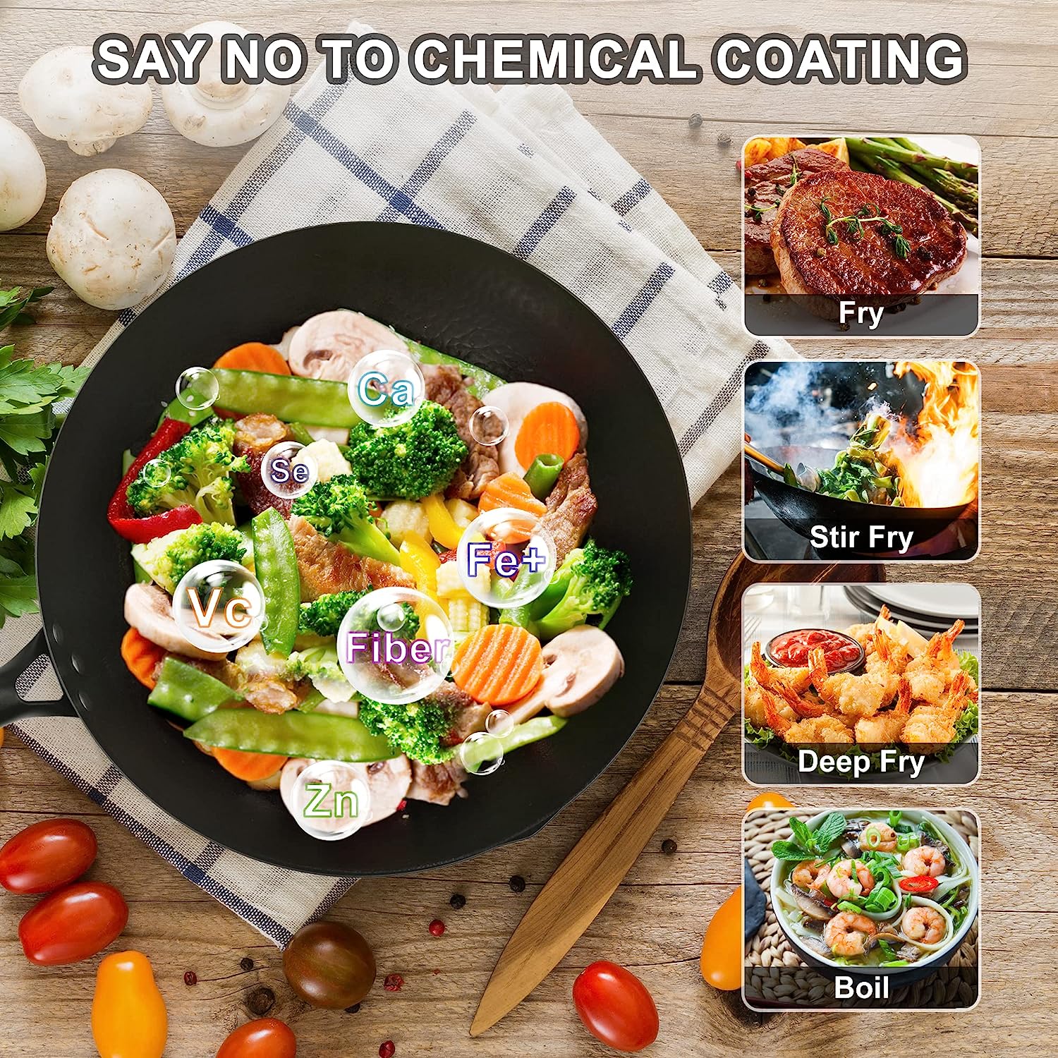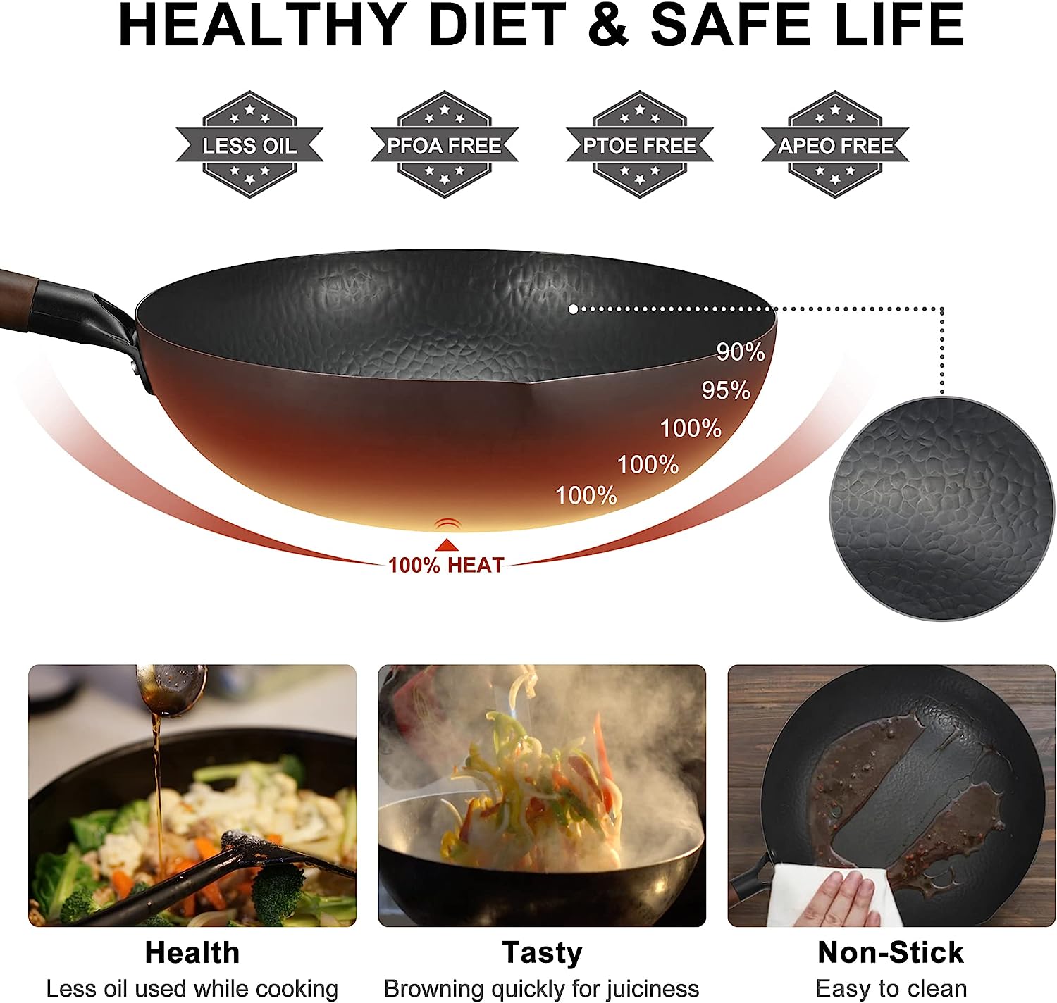 • [Health and diet] The use of carbon steel wok flat bottom can greatly reduce the loss of vitamin C in foods, which provides rich nutritious diet. Cooking with this big wok pan nonstick helps to reduce iron deficiency and strengthen your immunity.