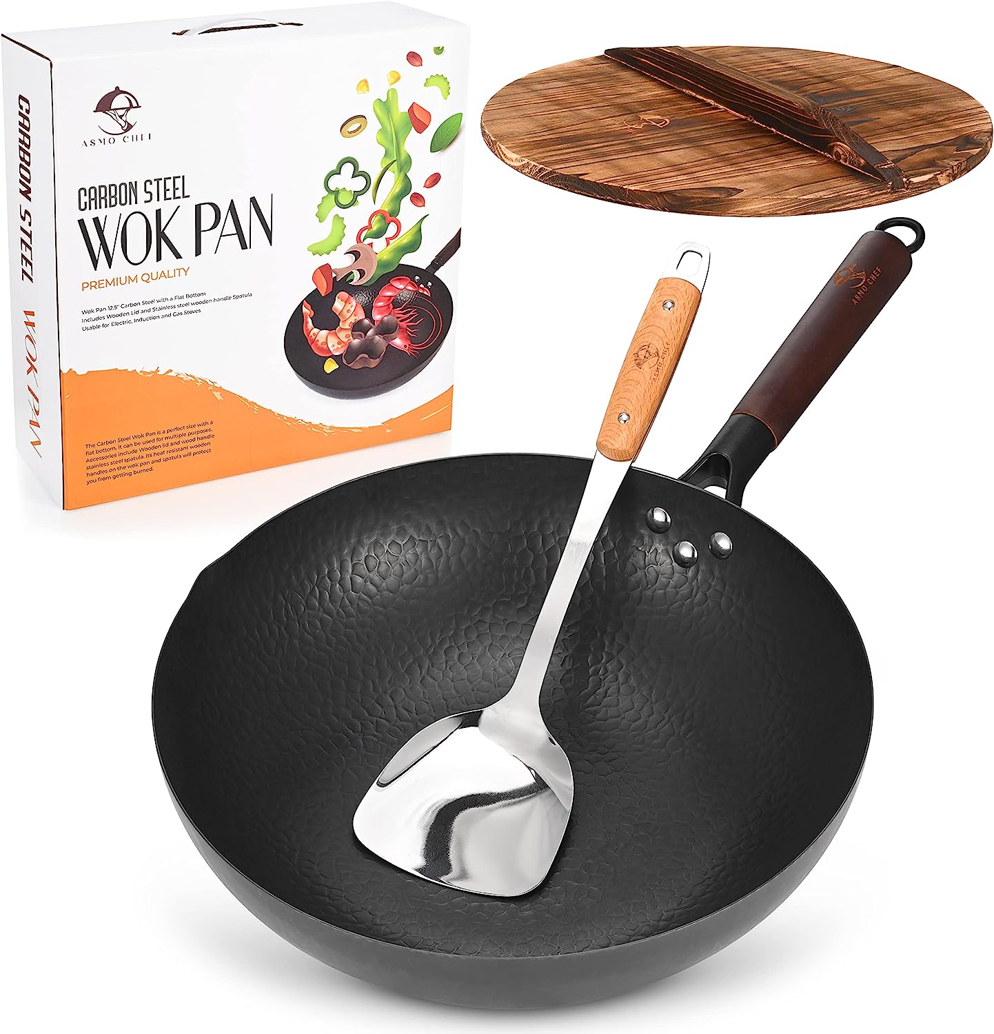 Asmo Chef Wok Pan 12.5” Carbon Steel Woks & Stir-Fry Pans Flat Bottom Wok with Lid and Spatula, No Chemical Coated Non-Stick Wok for Electric, Induction and Gas Stoves