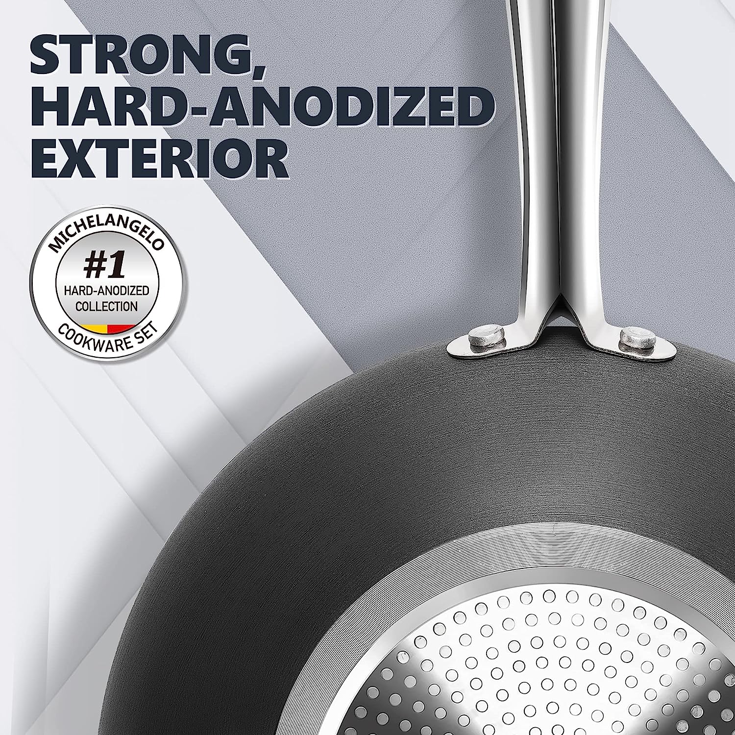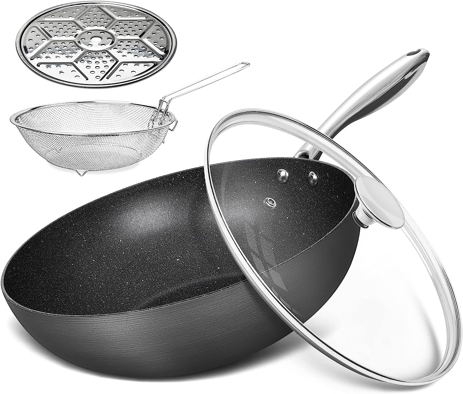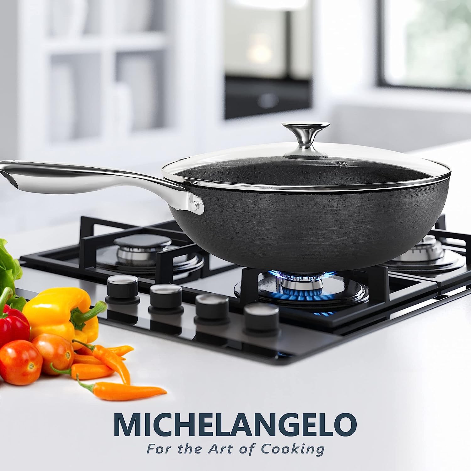 MICHELANGELO Hard Anodized Nonstick Wok with Lid, Cooking Wok Pan 12 Inch, Large Wok Pan with Flat Bottom, Induction Wok with Steamer Rack & Fry Basket, Woks and Stir Fry Pans - 5 Quart