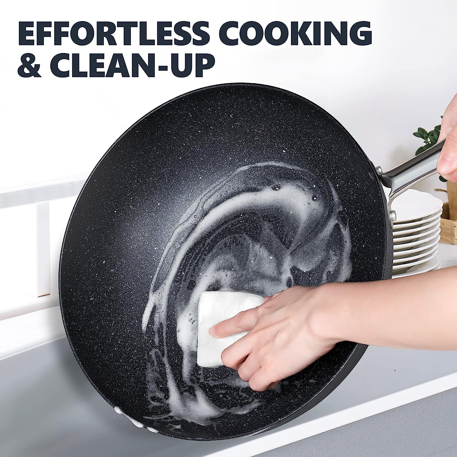 • Quick Heat Conduction - The non stick wok' heavy-duty, hard-anodized construction and stainless-steel bonded anti-warp base conduct heat quickly and evenly to help reduce hot spots that can burn foods.