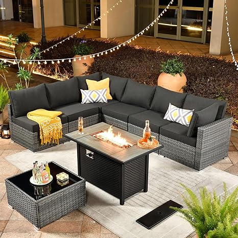 ovios Outdoor 8 Piece Patio Furniture Set with Fire Pit Table, Conversation Sectional Wicker Couch with Coffee Table, Modern Outside Sofa for Balcony Backyard, Black