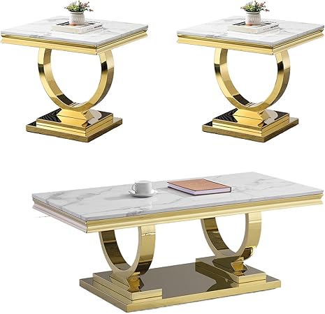 3 Pieces Living Room Table Set, Luxury Faux Marble Coffee Table Set with 2 Square End Side Tables, Modern Living Room Table Set of 3 with U-Shaped Stainless Steel Legs (White Gold)