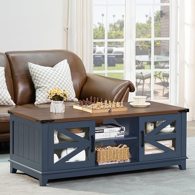 48" Farmhouse Coffee Table with Storage and Glass Sliding Barn Doors Modern Industrial Center Table with Adjustable Shelves Rustic Rectangular Table for Living Room, Blue-Double Sided Design