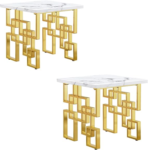 AUZ Gold End Table Set of 2, Modern Square Living Room Side Table with White Top and Gold Mirrored Metal Geometric Base
