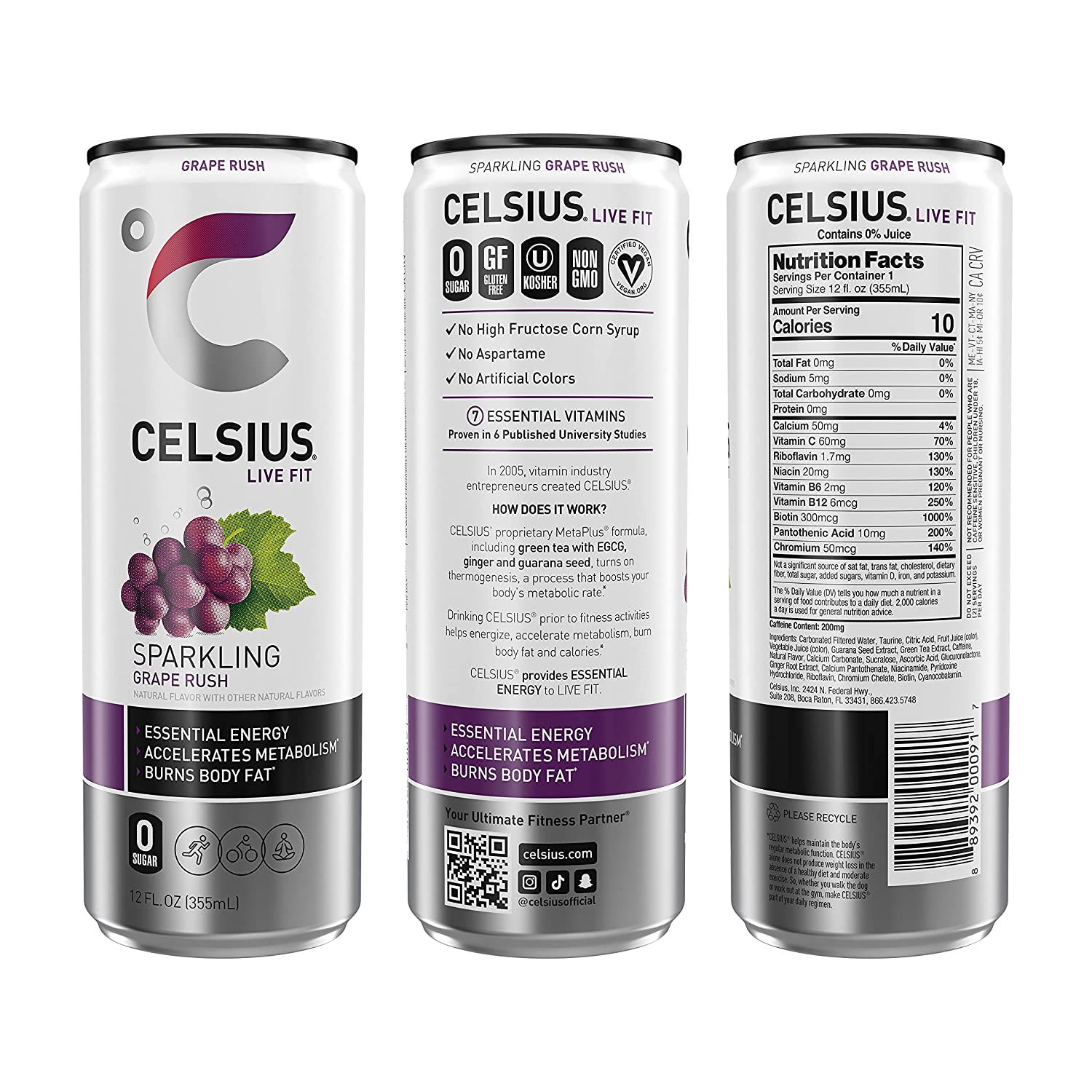 CELSIUS is functional, Essential Energy, a better-for-you, premium alternative to traditional energy drinks. As a global, lifestyle fitness drink, CELSIUS was created to help people LIVE FIT, exceed their goals and elevate their everyday lives. Made with proven, premium ingredients, 7 Essential Vitamins and zero sugar, no artificial colors, no aspartame, no high fructose corn syrup and non-GMO. CELSIUS is vegan, gluten-free and Kosher. Our proprietary MetaPlus blend contains green tea extract with EGCG. It also includes guarana seed extract, ginger root for flavor and digestion, vitamin C to help support your immune system, vitamin B for energy production, and chromium to help control hunger, making it an ideal pre-workout drink. Juicy, sweet, refreshing and a little nostalgic. Enjoy the flavor packed taste of CELSIUS Sparkling Grape Rush. Made with clinically proven ingredients, this carbonated flavor of CELSIUS has the perfect balance of flavor and energy that serves as an awesome pick-me-up for active lifestyles. Make CELSIUS your go-to choice for Essential Energy! CELSIUS is available in 12 oz. slim cans and sold in a 12-pack for convenience.