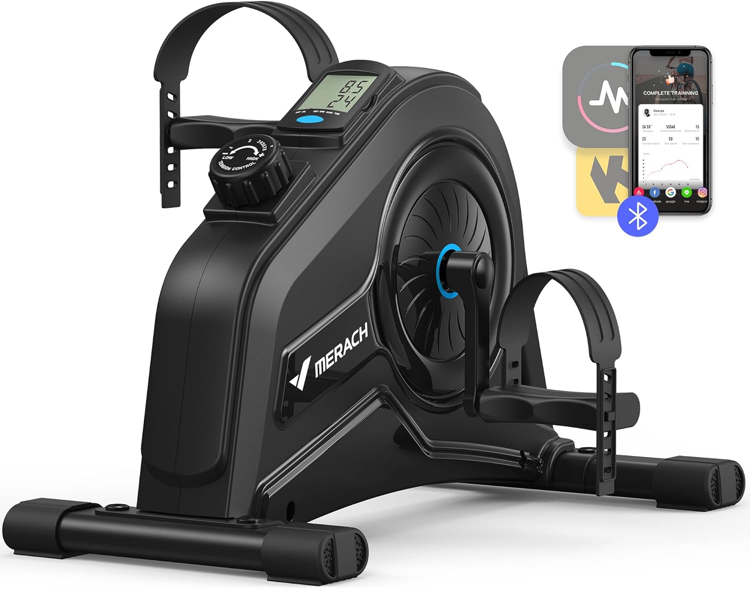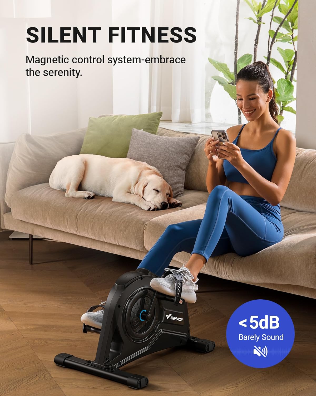 Under Desk Bike Pedal Exerciser, Quiet Magnetic Mini Exercise Bike with MERACH App for Arm, Leg Recovery, Physical Therapy, Smooth Foot Desk Cycle with 2 Resistance Bands & Non-Slip Mat