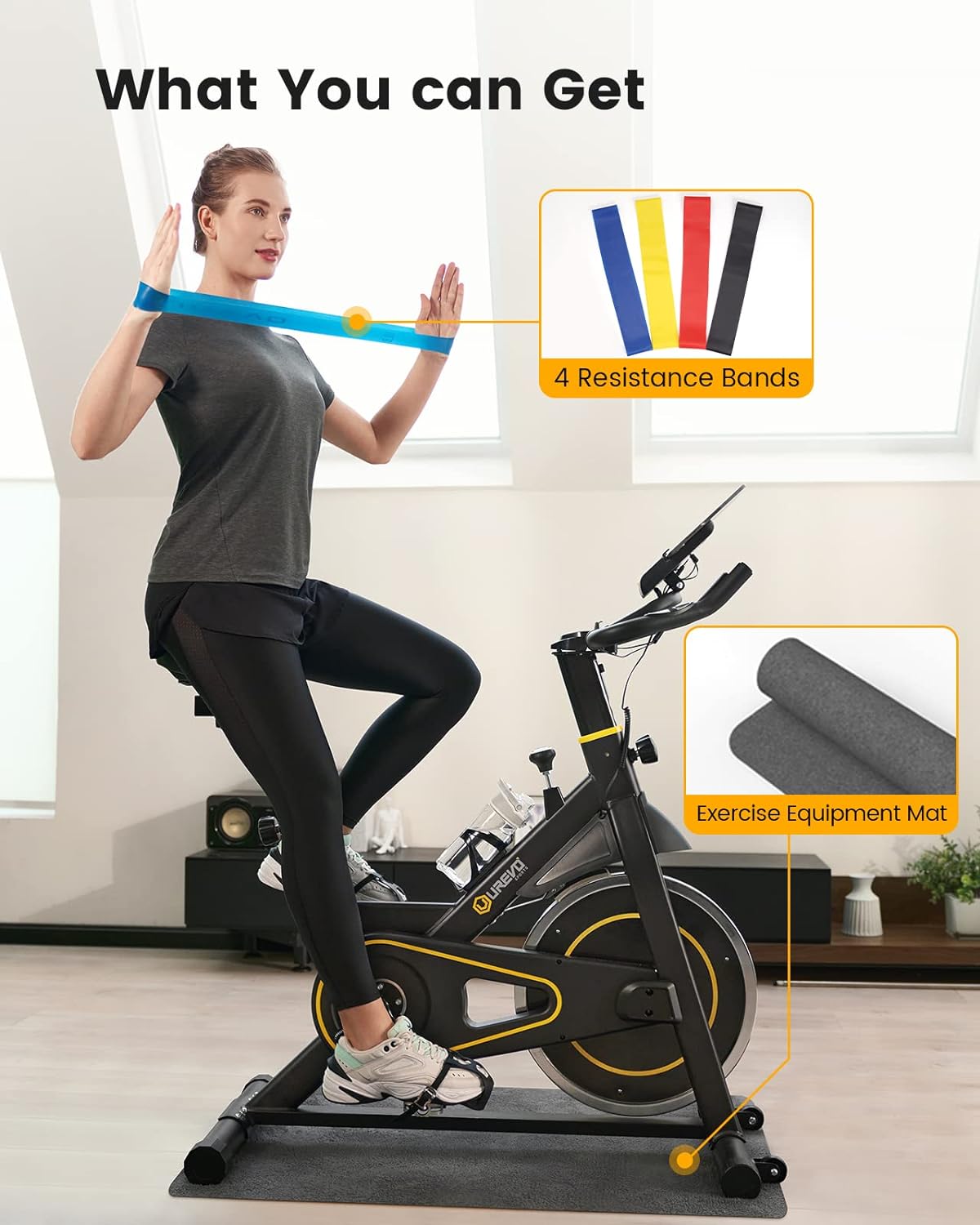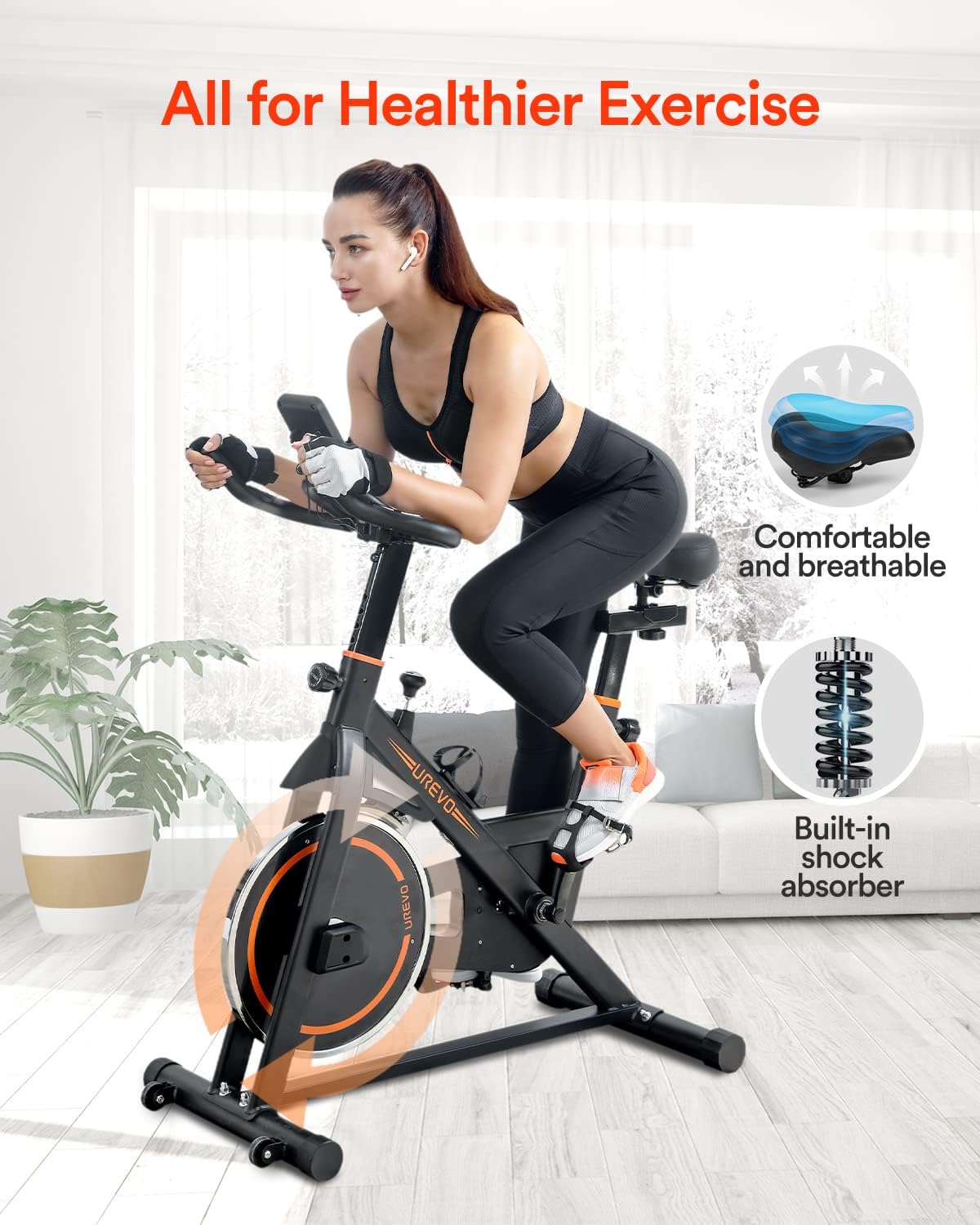 UREVO indoor Cycling Bike, Stationary Exercise Bike 350 lbs Weight Capacity,Ipad Mount, Comfortable Seat Cushion, Silent Belt Drive Cycle Bike for Home Workouts Gym