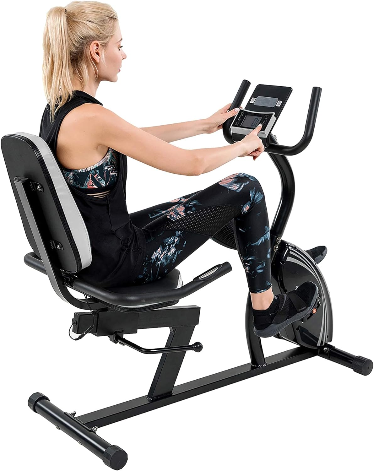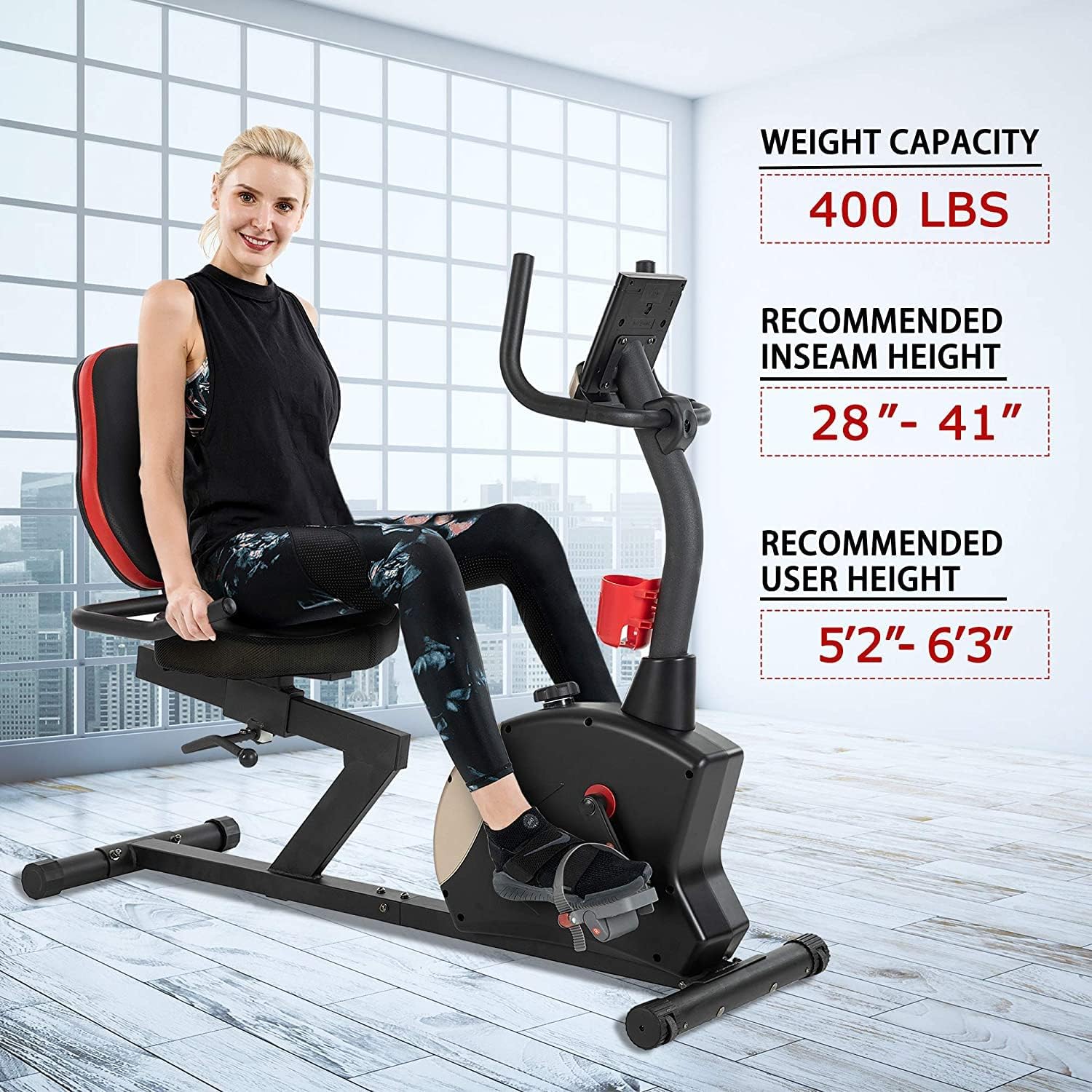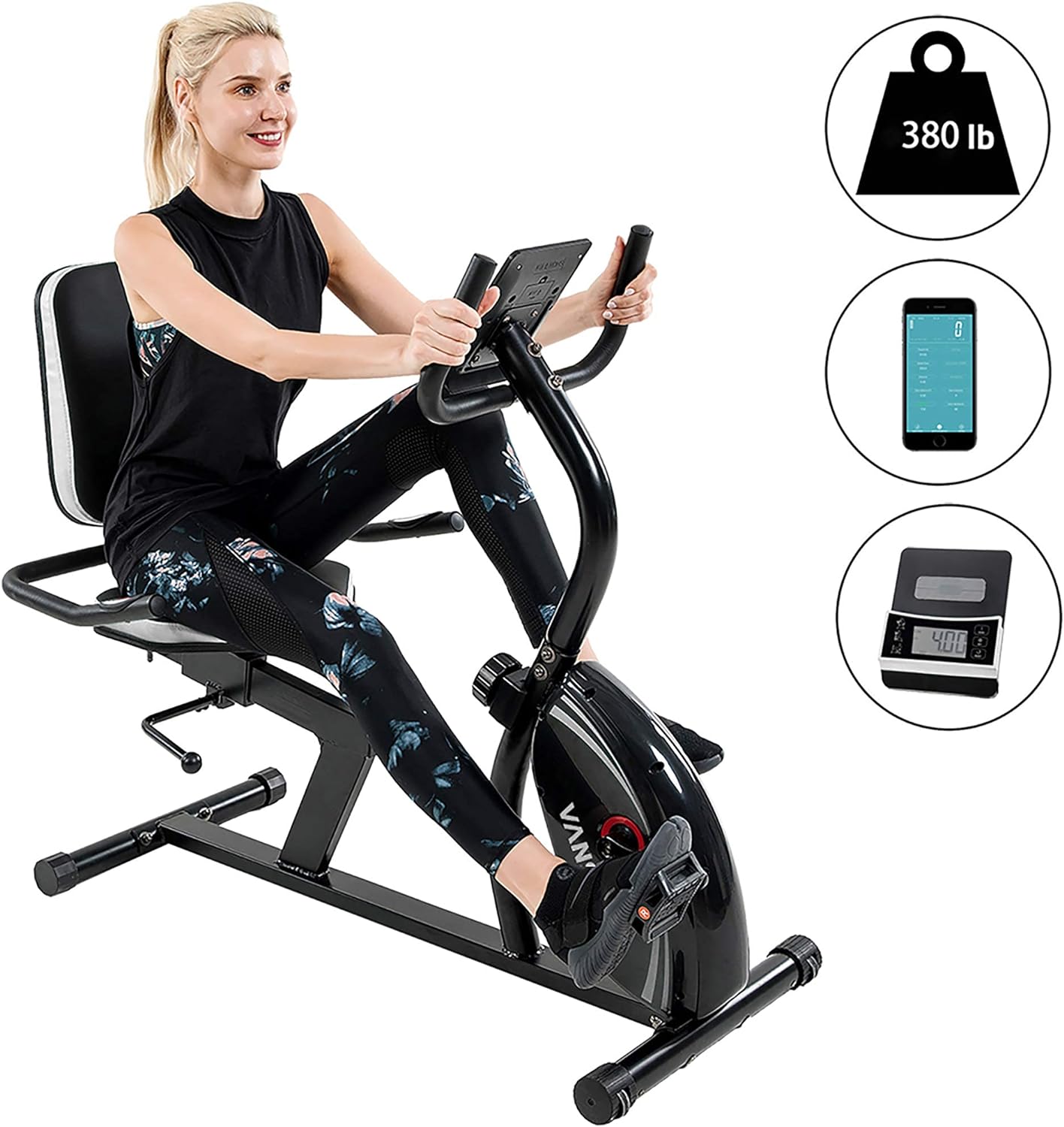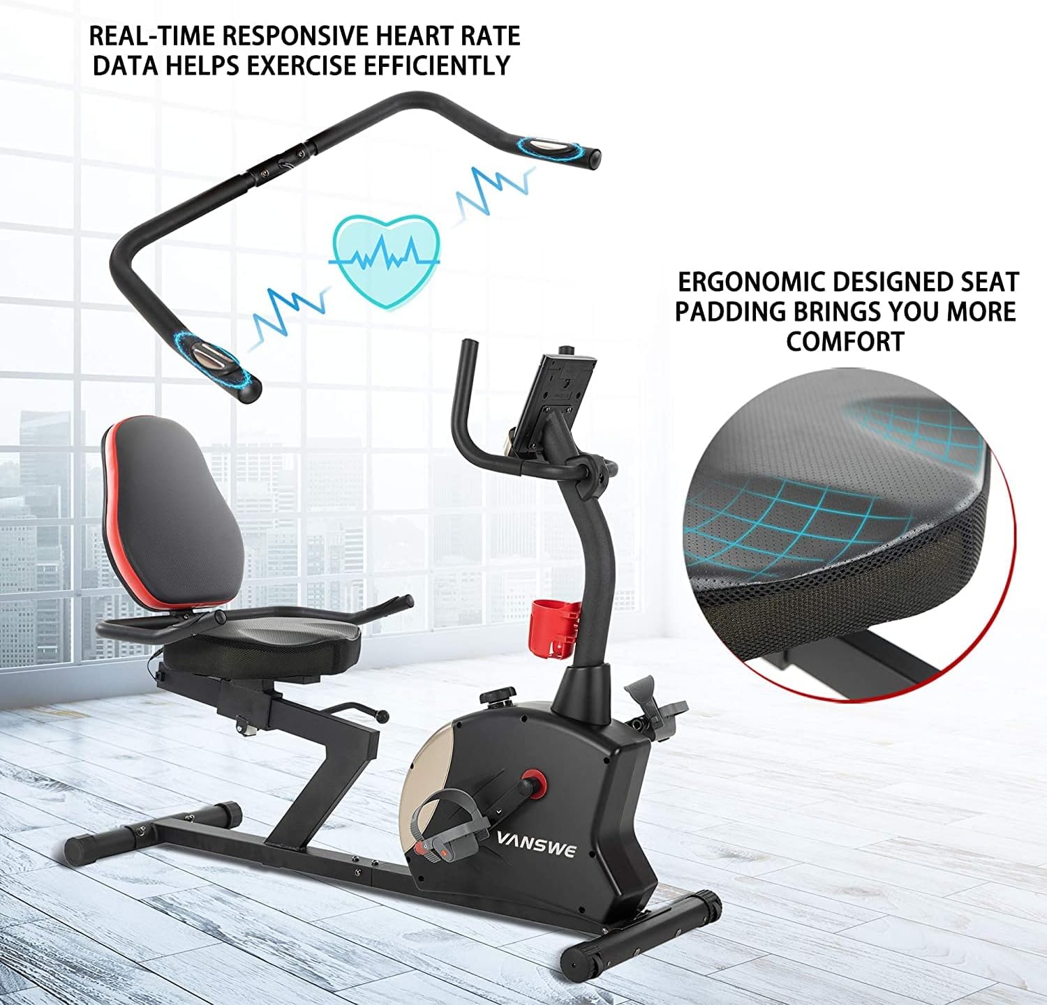 This Vanswe Recumbent Exercise Bike enables you to programme your workout goals while sitting in the comfort of your own home. With its 16 preset levels of smooth magnetic resistance, you can tailor your exercise to your own needs. This recumbent cycle has a weight capability of up to 380 lbs and is fitted with a broad and huge LED screen that shows time, distance, speed, odometer, pulse, and calories. The tablet support makes it easier to watch movies or perform training while riding on this bike.