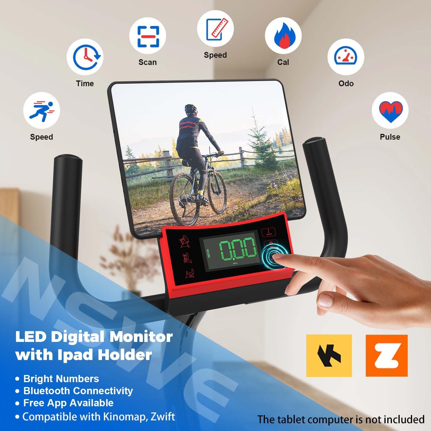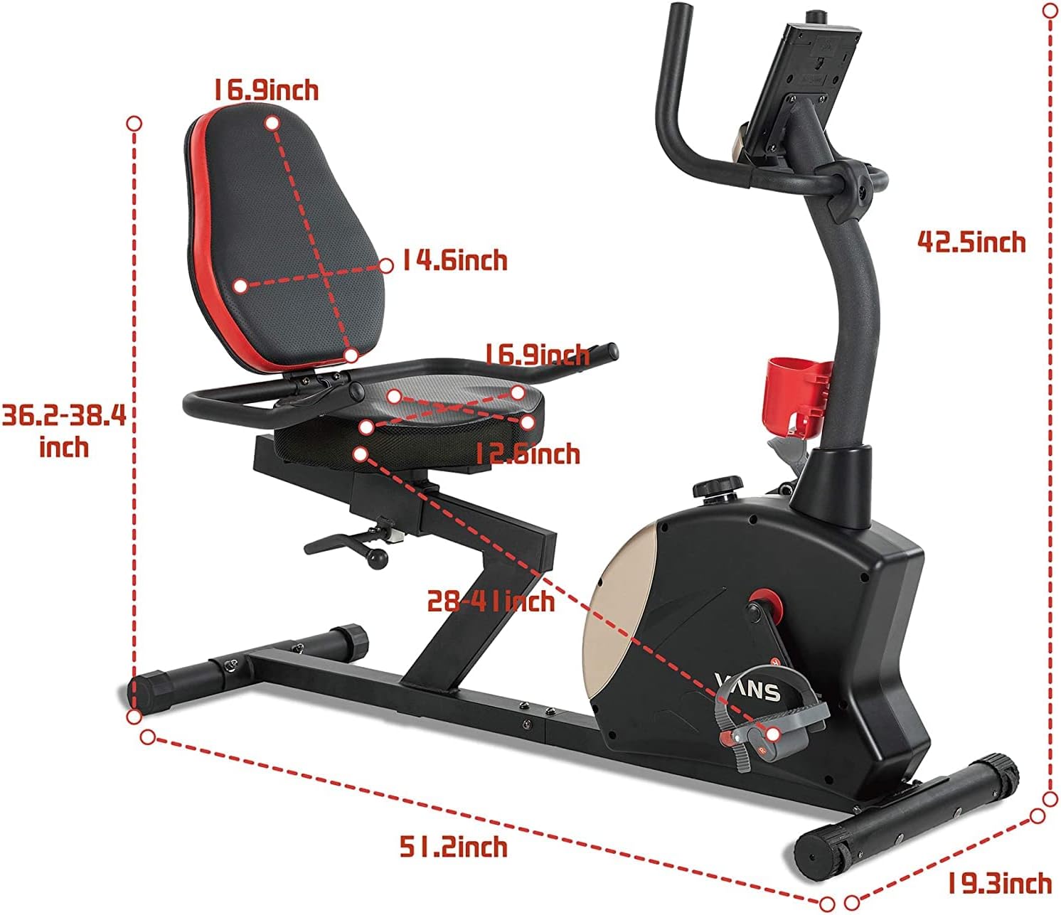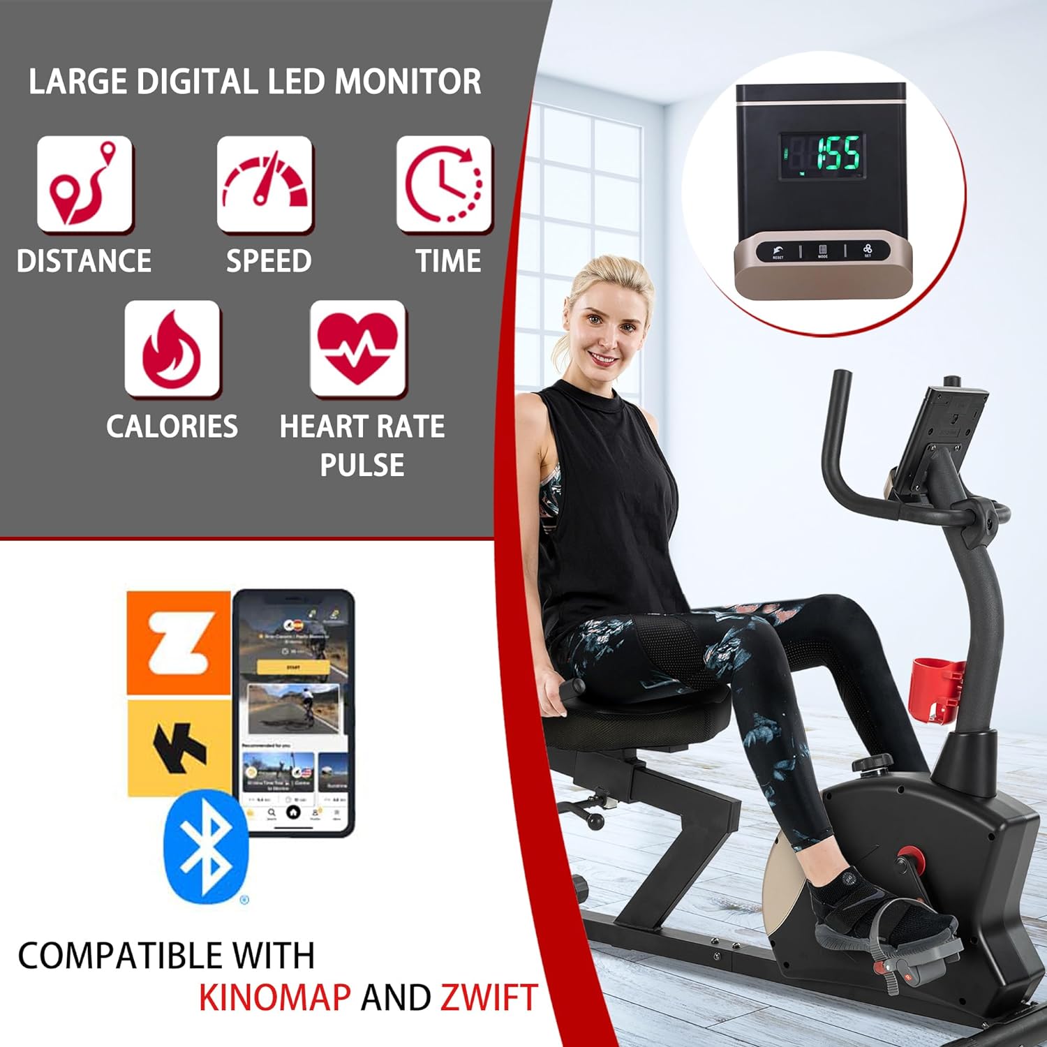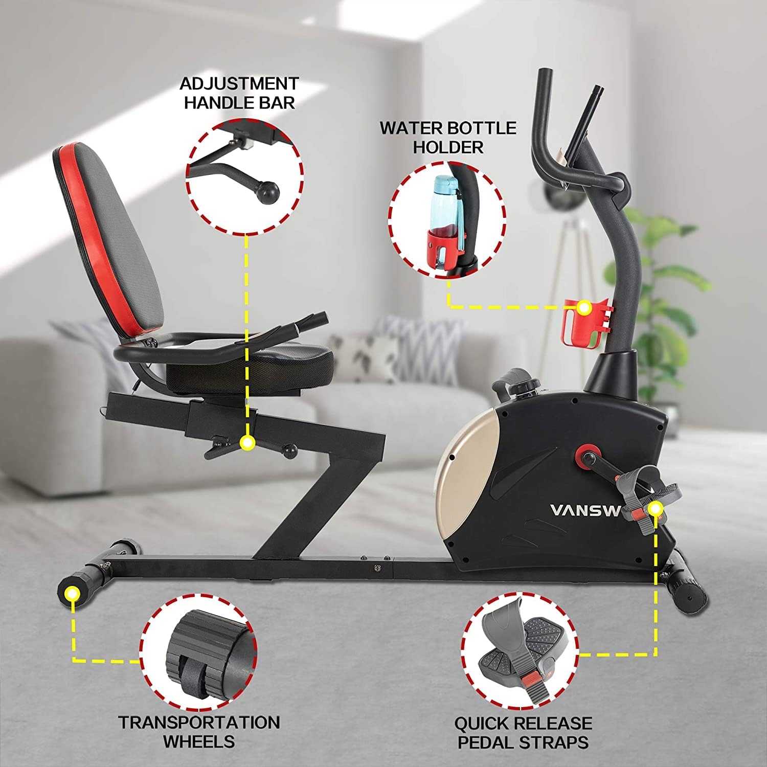 This Vanswe Recumbent Exercise Bike enables you to programme your workout goals while sitting in the comfort of your own home. With its 16 preset levels of smooth magnetic resistance, you can tailor your exercise to your own needs. This recumbent cycle has a weight capability of up to 380 lbs and is fitted with a broad and huge LED screen that shows time, distance, speed, odometer, pulse, and calories. The tablet support makes it easier to watch movies or perform training while riding on this bike.