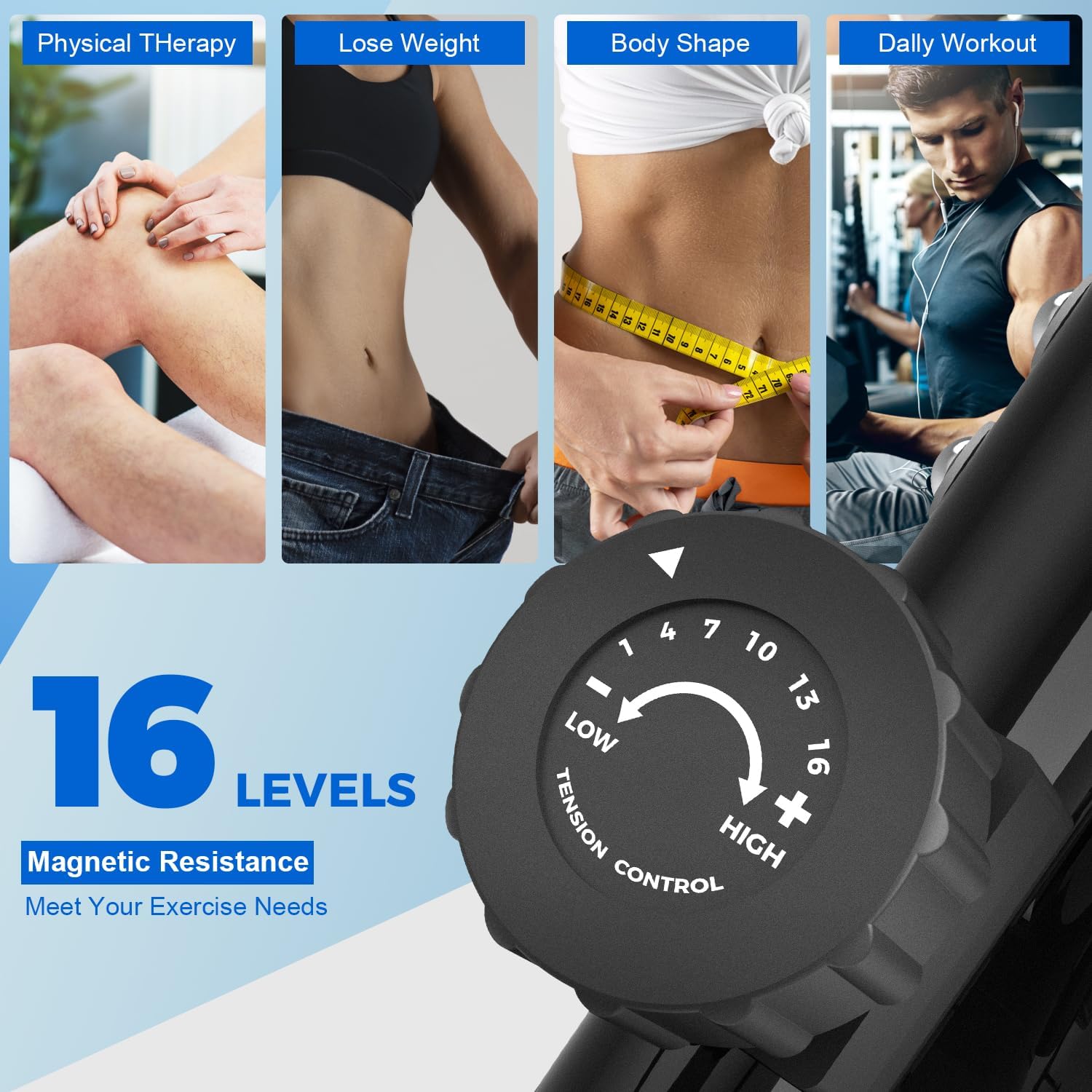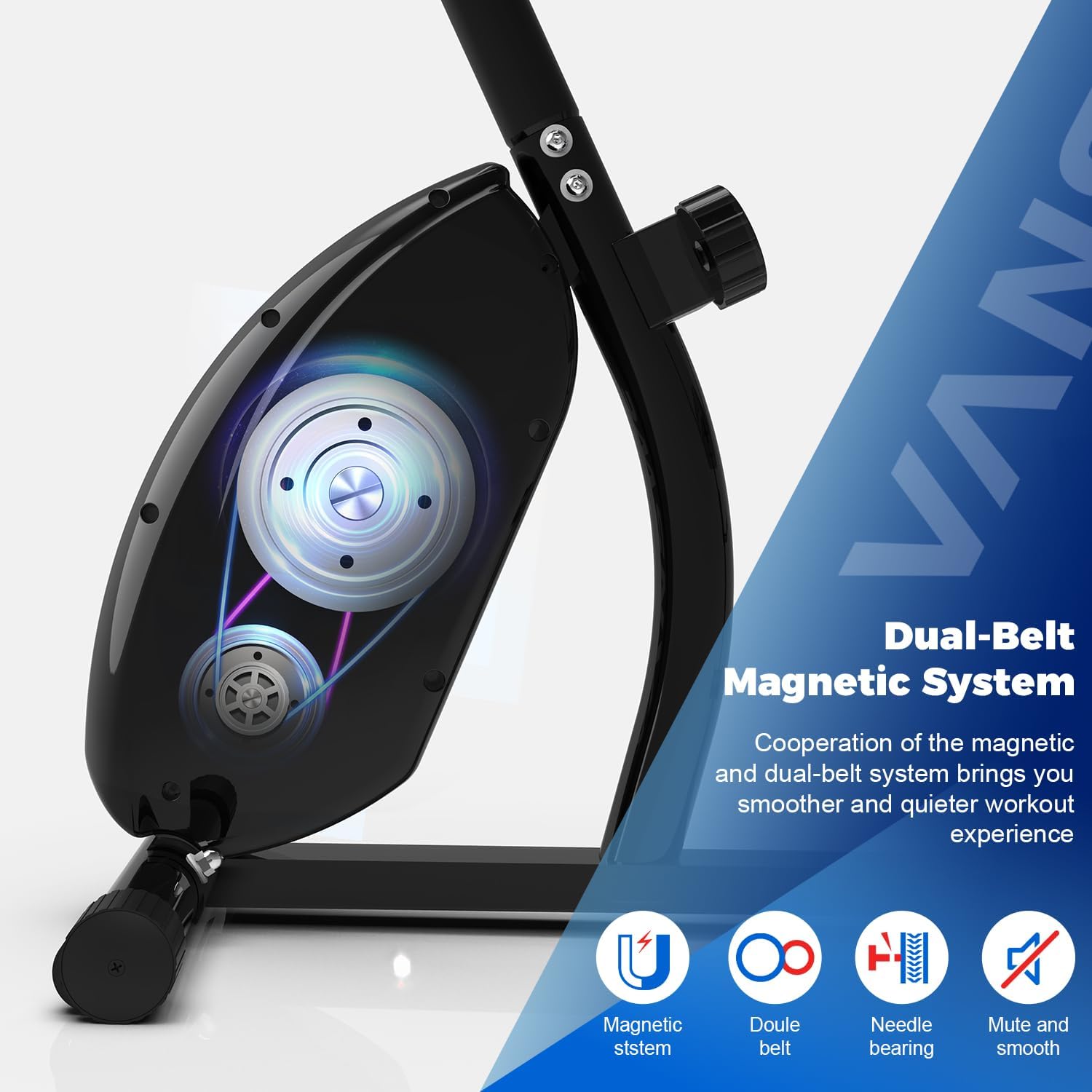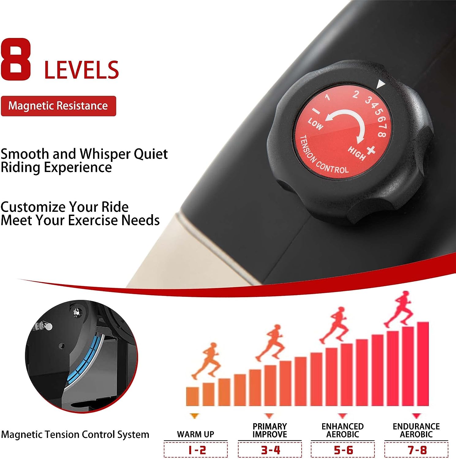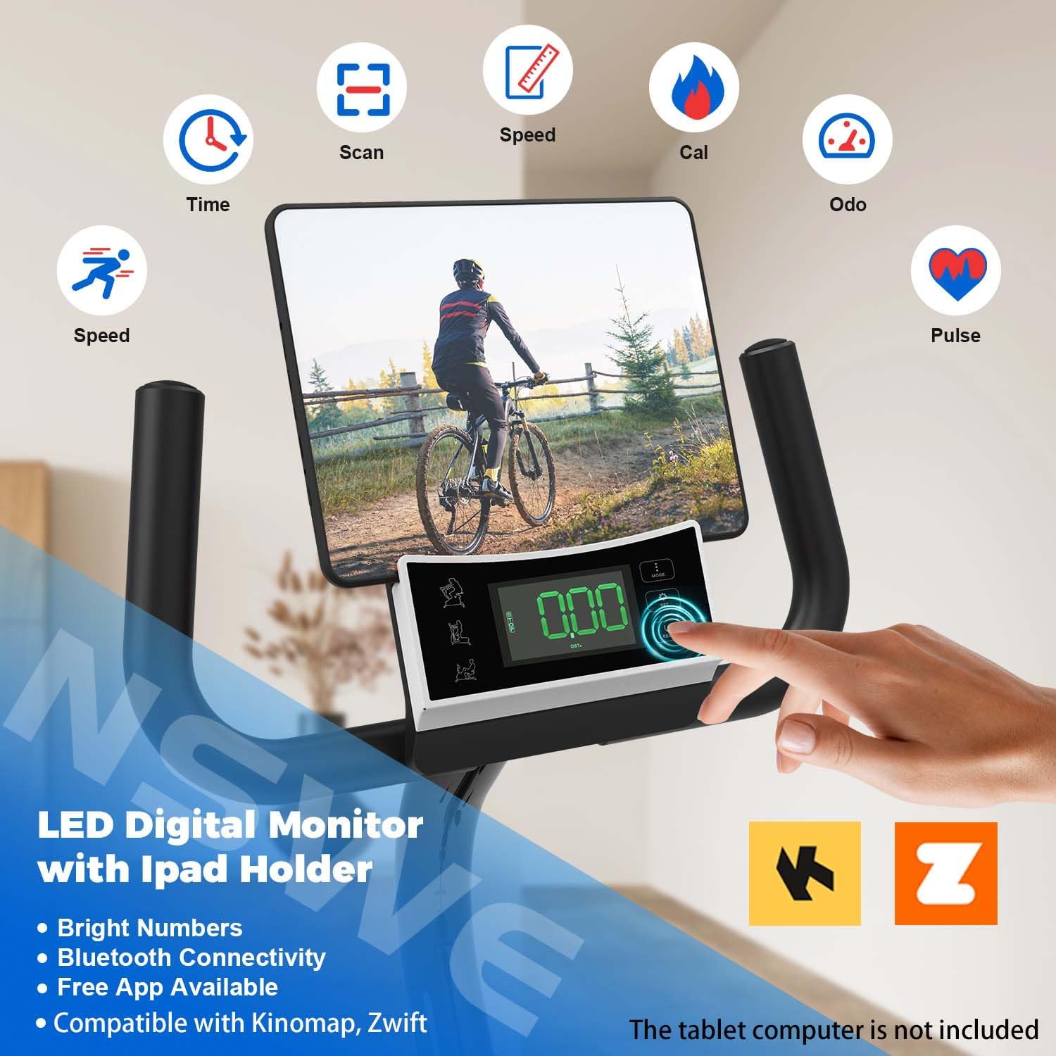 This Vanswe Recumbent Exercise Bike enables you to programme your workout goals while sitting in the comfort of your own home. With its 16 preset levels of smooth magnetic resistance, you can tailor your exercise to your own needs. This recumbent cycle has a weight capability of up to 380 lbs and is fitted with a broad and huge LED screen that shows time, distance, speed, odometer, pulse, and calories. The tablet support makes it easier to watch movies or perform training while riding on this bike.